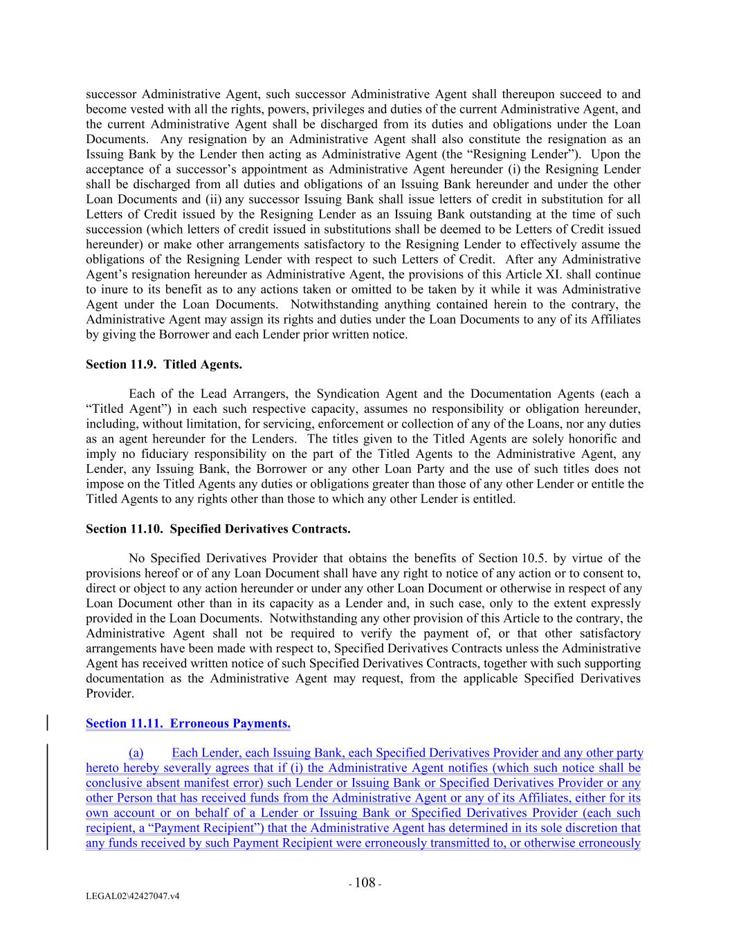 successor Administrative Agent, such successor Administrative Agent shall thereupon succeed to and become vested with all the rights, powers, privileges and duties of the current Administrative Agent, and the current Administrative Agent shall be discharged from its duties and obligations under the Loan Documents. Any resignation by an Administrative Agent shall also constitute the resignation as an Issuing Bank by the Lender then acting as Administrative Agent (the “Resigning Lender”). Upon the acceptance of a successor’s appointment as Administrative Agent hereunder (i) the Resigning Lender shall be discharged from all duties and obligations of an Issuing Bank hereunder and under the other Loan Documents and (ii) any successor Issuing Bank shall issue letters of credit in substitution for all Letters of Credit issued by the Resigning Lender as an Issuing Bank outstanding at the time of such succession (which letters of credit issued in substitutions shall be deemed to be Letters of Credit issued hereunder) or make other arrangements satisfactory to the Resigning Lender to effectively assume the obligations of the Resigning Lender with respect to such Letters of Credit. After any Administrative Agent’s resignation hereunder as Administrative Agent, the provisions of this Article XI. shall continue to inure to its benefit as to any actions taken or omitted to be taken by it while it was Administrative Agent under the Loan Documents. Notwithstanding anything contained herein to the contrary, the Administrative Agent may assign its rights and duties under the Loan Documents to any of its Affiliates by giving the Borrower and each Lender prior written notice. Section 11.9. Titled Agents. Each of the Lead Arrangers, the Syndication Agent and the Documentation Agents (each a “Titled Agent”) in each such respective capacity, assumes no responsibility or obligation hereunder, including, without limitation, for servicing, enforcement or collection of any of the Loans, nor any duties as an agent hereunder for the Lenders. The titles given to the Titled Agents are solely honorific and imply no fiduciary responsibility on the part of the Titled Agents to the Administrative Agent, any Lender, any Issuing Bank, the Borrower or any other Loan Party and the use of such titles does not impose on the Titled Agents any duties or obligations greater than those of any other Lender or entitle the Titled Agents to any rights other than those to which any other Lender is entitled. Section 11.10. Specified Derivatives Contracts. No Specified Derivatives Provider that obtains the benefits of Section 10.5. by virtue of the provisions hereof or of any Loan Document shall have any right to notice of any action or to consent to, direct or object to any action hereunder or under any other Loan Document or otherwise in respect of any Loan Document other than in its capacity as a Lender and, in such case, only to the extent expressly provided in the Loan Documents. Notwithstanding any other provision of this Article to the contrary, the Administrative Agent shall not be required to verify the payment of, or that other satisfactory arrangements have been made with respect to, Specified Derivatives Contracts unless the Administrative Agent has received written notice of such Specified Derivatives Contracts, together with such supporting documentation as the Administrative Agent may request, from the applicable Specified Derivatives Provider. Section 11.11. Erroneous Payments. (a) Each Lender, each Issuing Bank, each Specified Derivatives Provider and any other party hereto hereby severally agrees that if (i) the Administrative Agent notifies (which such notice shall be conclusive absent manifest error) such Lender or Issuing Bank or Specified Derivatives Provider or any other Person that has received funds from the Administrative Agent or any of its Affiliates, either for its own account or on behalf of a Lender or Issuing Bank or Specified Derivatives Provider (each such recipient, a “Payment Recipient”) that the Administrative Agent has determined in its sole discretion that any funds received by such Payment Recipient were erroneously transmitted to, or otherwise erroneously - 108 - LEGAL02\42427047.v4