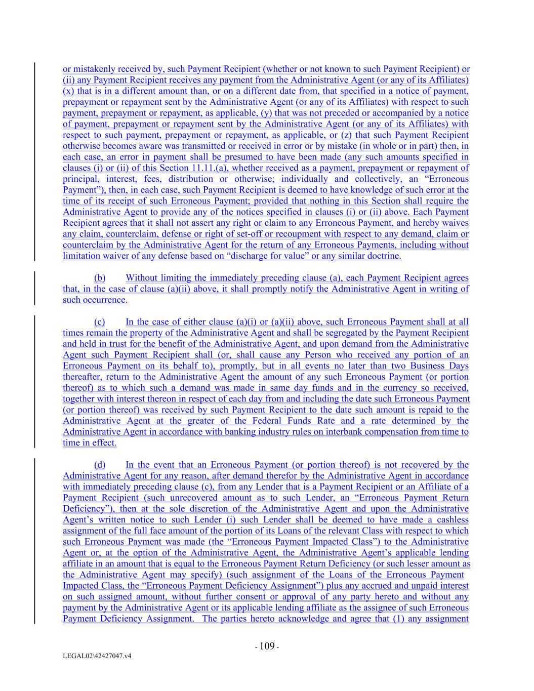 or mistakenly received by, such Payment Recipient (whether or not known to such Payment Recipient) or (ii) any Payment Recipient receives any payment from the Administrative Agent (or any of its Affiliates) (x) that is in a different amount than, or on a different date from, that specified in a notice of payment, prepayment or repayment sent by the Administrative Agent (or any of its Affiliates) with respect to such payment, prepayment or repayment, as applicable, (y) that was not preceded or accompanied by a notice of payment, prepayment or repayment sent by the Administrative Agent (or any of its Affiliates) with respect to such payment, prepayment or repayment, as applicable, or (z) that such Payment Recipient otherwise becomes aware was transmitted or received in error or by mistake (in whole or in part) then, in each case, an error in payment shall be presumed to have been made (any such amounts specified in clauses (i) or (ii) of this Section 11.11.(a), whether received as a payment, prepayment or repayment of principal, interest, fees, distribution or otherwise; individually and collectively, an “Erroneous Payment”), then, in each case, such Payment Recipient is deemed to have knowledge of such error at the time of its receipt of such Erroneous Payment; provided that nothing in this Section shall require the Administrative Agent to provide any of the notices specified in clauses (i) or (ii) above. Each Payment Recipient agrees that it shall not assert any right or claim to any Erroneous Payment, and hereby waives any claim, counterclaim, defense or right of set-off or recoupment with respect to any demand, claim or counterclaim by the Administrative Agent for the return of any Erroneous Payments, including without limitation waiver of any defense based on “discharge for value” or any similar doctrine. (b) Without limiting the immediately preceding clause (a), each Payment Recipient agrees that, in the case of clause (a)(ii) above, it shall promptly notify the Administrative Agent in writing of such occurrence. (c) In the case of either clause (a)(i) or (a)(ii) above, such Erroneous Payment shall at all times remain the property of the Administrative Agent and shall be segregated by the Payment Recipient and held in trust for the benefit of the Administrative Agent, and upon demand from the Administrative Agent such Payment Recipient shall (or, shall cause any Person who received any portion of an Erroneous Payment on its behalf to), promptly, but in all events no later than two Business Days thereafter, return to the Administrative Agent the amount of any such Erroneous Payment (or portion thereof) as to which such a demand was made in same day funds and in the currency so received, together with interest thereon in respect of each day from and including the date such Erroneous Payment (or portion thereof) was received by such Payment Recipient to the date such amount is repaid to the Administrative Agent at the greater of the Federal Funds Rate and a rate determined by the Administrative Agent in accordance with banking industry rules on interbank compensation from time to time in effect. (d) In the event that an Erroneous Payment (or portion thereof) is not recovered by the Administrative Agent for any reason, after demand therefor by the Administrative Agent in accordance with immediately preceding clause (c), from any Lender that is a Payment Recipient or an Affiliate of a Payment Recipient (such unrecovered amount as to such Lender, an “Erroneous Payment Return Deficiency”), then at the sole discretion of the Administrative Agent and upon the Administrative Agent’s written notice to such Lender (i) such Lender shall be deemed to have made a cashless assignment of the full face amount of the portion of its Loans of the relevant Class with respect to which such Erroneous Payment was made (the “Erroneous Payment Impacted Class”) to the Administrative Agent or, at the option of the Administrative Agent, the Administrative Agent’s applicable lending affiliate in an amount that is equal to the Erroneous Payment Return Deficiency (or such lesser amount as the Administrative Agent may specify) (such assignment of the Loans of the Erroneous Payment Impacted Class, the “Erroneous Payment Deficiency Assignment”) plus any accrued and unpaid interest on such assigned amount, without further consent or approval of any party hereto and without any payment by the Administrative Agent or its applicable lending affiliate as the assignee of such Erroneous Payment Deficiency Assignment. The parties hereto acknowledge and agree that (1) any assignment - 109 - LEGAL02\42427047.v4