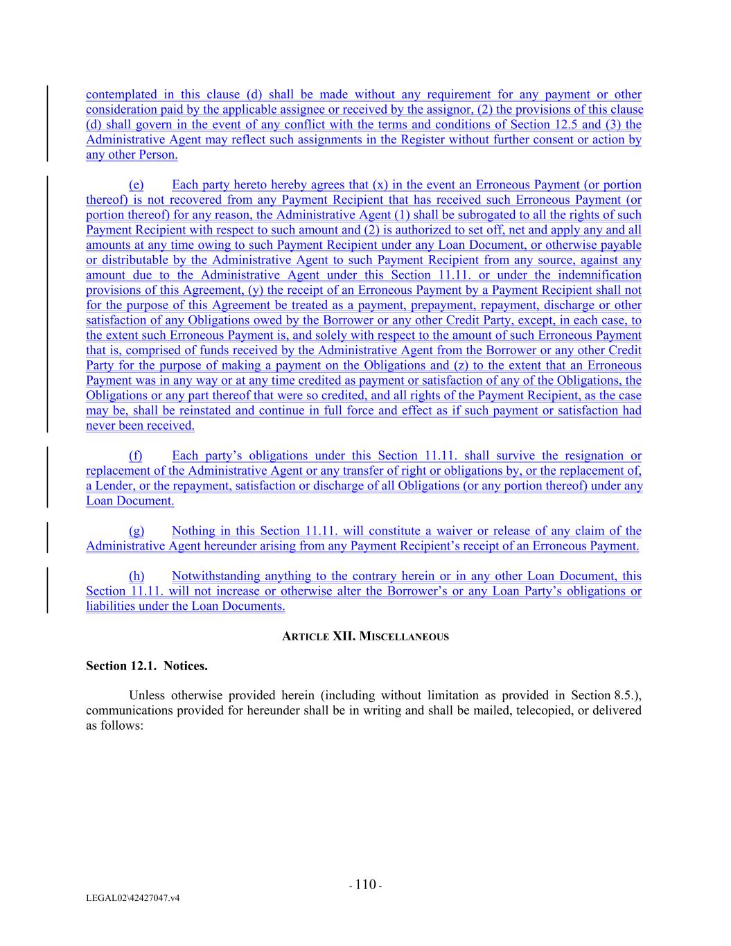 contemplated in this clause (d) shall be made without any requirement for any payment or other consideration paid by the applicable assignee or received by the assignor, (2) the provisions of this clause (d) shall govern in the event of any conflict with the terms and conditions of Section 12.5 and (3) the Administrative Agent may reflect such assignments in the Register without further consent or action by any other Person. (e) Each party hereto hereby agrees that (x) in the event an Erroneous Payment (or portion thereof) is not recovered from any Payment Recipient that has received such Erroneous Payment (or portion thereof) for any reason, the Administrative Agent (1) shall be subrogated to all the rights of such Payment Recipient with respect to such amount and (2) is authorized to set off, net and apply any and all amounts at any time owing to such Payment Recipient under any Loan Document, or otherwise payable or distributable by the Administrative Agent to such Payment Recipient from any source, against any amount due to the Administrative Agent under this Section 11.11. or under the indemnification provisions of this Agreement, (y) the receipt of an Erroneous Payment by a Payment Recipient shall not for the purpose of this Agreement be treated as a payment, prepayment, repayment, discharge or other satisfaction of any Obligations owed by the Borrower or any other Credit Party, except, in each case, to the extent such Erroneous Payment is, and solely with respect to the amount of such Erroneous Payment that is, comprised of funds received by the Administrative Agent from the Borrower or any other Credit Party for the purpose of making a payment on the Obligations and (z) to the extent that an Erroneous Payment was in any way or at any time credited as payment or satisfaction of any of the Obligations, the Obligations or any part thereof that were so credited, and all rights of the Payment Recipient, as the case may be, shall be reinstated and continue in full force and effect as if such payment or satisfaction had never been received. (f) Each party’s obligations under this Section 11.11. shall survive the resignation or replacement of the Administrative Agent or any transfer of right or obligations by, or the replacement of, a Lender, or the repayment, satisfaction or discharge of all Obligations (or any portion thereof) under any Loan Document. (g) Nothing in this Section 11.11. will constitute a waiver or release of any claim of the Administrative Agent hereunder arising from any Payment Recipient’s receipt of an Erroneous Payment. (h) Notwithstanding anything to the contrary herein or in any other Loan Document, this Section 11.11. will not increase or otherwise alter the Borrower’s or any Loan Party’s obligations or liabilities under the Loan Documents. ARTICLE XII. MISCELLANEOUS Section 12.1. Notices. Unless otherwise provided herein (including without limitation as provided in Section 8.5.), communications provided for hereunder shall be in writing and shall be mailed, telecopied, or delivered as follows: - 110 - LEGAL02\42427047.v4