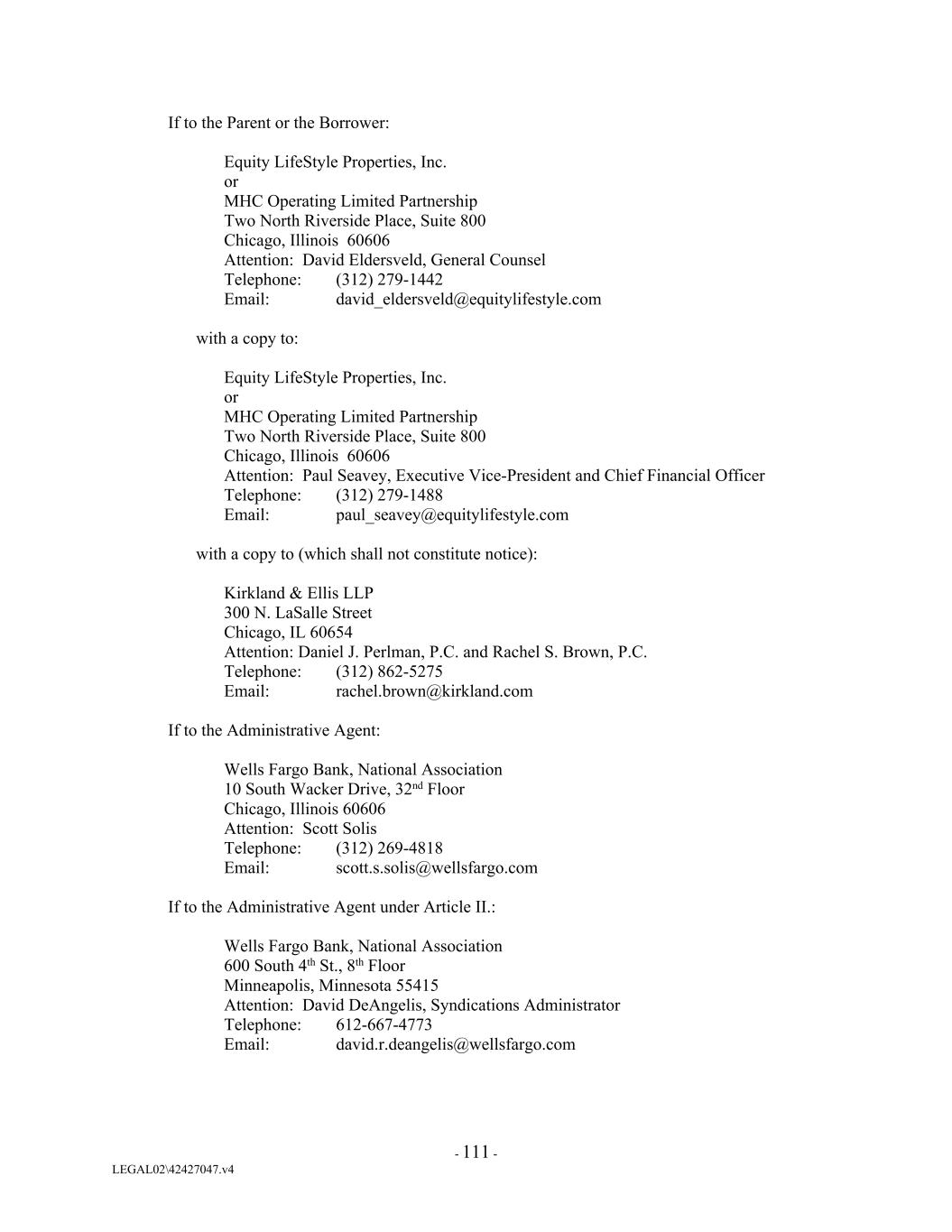 If to the Parent or the Borrower: Equity LifeStyle Properties, Inc. or MHC Operating Limited Partnership Two North Riverside Place, Suite 800 Chicago, Illinois 60606 Attention: David Eldersveld, General Counsel Telephone: (312) 279-1442 Email: david_eldersveld@equitylifestyle.com with a copy to: Equity LifeStyle Properties, Inc. or MHC Operating Limited Partnership Two North Riverside Place, Suite 800 Chicago, Illinois 60606 Attention: Paul Seavey, Executive Vice-President and Chief Financial Officer Telephone: (312) 279-1488 Email: paul_seavey@equitylifestyle.com with a copy to (which shall not constitute notice): Kirkland & Ellis LLP 300 N. LaSalle Street Chicago, IL 60654 Attention: Daniel J. Perlman, P.C. and Rachel S. Brown, P.C. Telephone: (312) 862-5275 Email: rachel.brown@kirkland.com If to the Administrative Agent: Wells Fargo Bank, National Association 10 South Wacker Drive, 32nd Floor Chicago, Illinois 60606 Attention: Scott Solis Telephone: (312) 269-4818 Email: scott.s.solis@wellsfargo.com If to the Administrative Agent under Article II.: Wells Fargo Bank, National Association 600 South 4th St., 8th Floor Minneapolis, Minnesota 55415 Attention: David DeAngelis, Syndications Administrator Telephone: 612-667-4773 Email: david.r.deangelis@wellsfargo.com - 111 - LEGAL02\42427047.v4