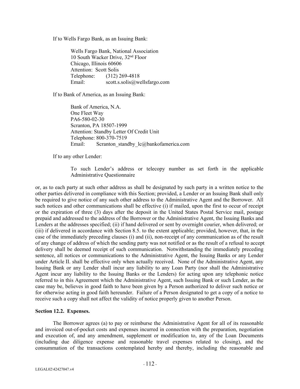 If to Wells Fargo Bank, as an Issuing Bank: Wells Fargo Bank, National Association 10 South Wacker Drive, 32nd Floor Chicago, Illinois 60606 Attention: Scott Solis Telephone: (312) 269-4818 Email: scott.s.solis@wellsfargo.com If to Bank of America, as an Issuing Bank: Bank of America, N.A. One Fleet Way PA6-580-02-30 Scranton, PA 18507-1999 Attention: Standby Letter Of Credit Unit Telephone: 800-370-7519 Email: Scranton_standby_lc@bankofamerica.com If to any other Lender: To such Lender’s address or telecopy number as set forth in the applicable Administrative Questionnaire or, as to each party at such other address as shall be designated by such party in a written notice to the other parties delivered in compliance with this Section; provided, a Lender or an Issuing Bank shall only be required to give notice of any such other address to the Administrative Agent and the Borrower. All such notices and other communications shall be effective (i) if mailed, upon the first to occur of receipt or the expiration of three (3) days after the deposit in the United States Postal Service mail, postage prepaid and addressed to the address of the Borrower or the Administrative Agent, the Issuing Banks and Lenders at the addresses specified; (ii) if hand delivered or sent by overnight courier, when delivered; or (iii) if delivered in accordance with Section 8.5. to the extent applicable; provided, however, that, in the case of the immediately preceding clauses (i) and (ii), non-receipt of any communication as of the result of any change of address of which the sending party was not notified or as the result of a refusal to accept delivery shall be deemed receipt of such communication. Notwithstanding the immediately preceding sentence, all notices or communications to the Administrative Agent, the Issuing Banks or any Lender under Article II. shall be effective only when actually received. None of the Administrative Agent, any Issuing Bank or any Lender shall incur any liability to any Loan Party (nor shall the Administrative Agent incur any liability to the Issuing Banks or the Lenders) for acting upon any telephonic notice referred to in this Agreement which the Administrative Agent, such Issuing Bank or such Lender, as the case may be, believes in good faith to have been given by a Person authorized to deliver such notice or for otherwise acting in good faith hereunder. Failure of a Person designated to get a copy of a notice to receive such a copy shall not affect the validity of notice properly given to another Person. Section 12.2. Expenses. The Borrower agrees (a) to pay or reimburse the Administrative Agent for all of its reasonable and invoiced out-of-pocket costs and expenses incurred in connection with the preparation, negotiation and execution of, and any amendment, supplement or modification to, any of the Loan Documents (including due diligence expense and reasonable travel expenses related to closing), and the consummation of the transactions contemplated hereby and thereby, including the reasonable and - 112 - LEGAL02\42427047.v4