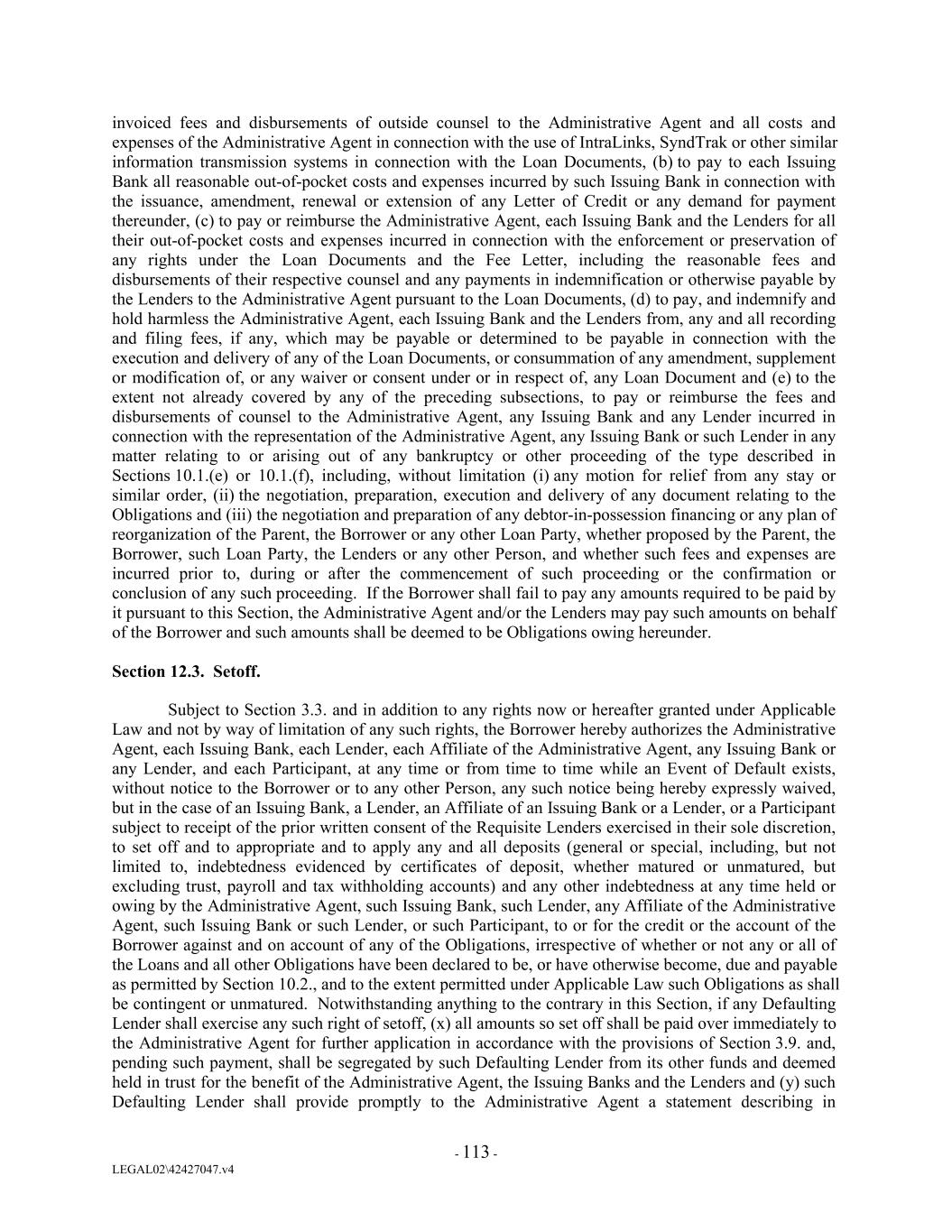 invoiced fees and disbursements of outside counsel to the Administrative Agent and all costs and expenses of the Administrative Agent in connection with the use of IntraLinks, SyndTrak or other similar information transmission systems in connection with the Loan Documents, (b) to pay to each Issuing Bank all reasonable out-of-pocket costs and expenses incurred by such Issuing Bank in connection with the issuance, amendment, renewal or extension of any Letter of Credit or any demand for payment thereunder, (c) to pay or reimburse the Administrative Agent, each Issuing Bank and the Lenders for all their out-of-pocket costs and expenses incurred in connection with the enforcement or preservation of any rights under the Loan Documents and the Fee Letter, including the reasonable fees and disbursements of their respective counsel and any payments in indemnification or otherwise payable by the Lenders to the Administrative Agent pursuant to the Loan Documents, (d) to pay, and indemnify and hold harmless the Administrative Agent, each Issuing Bank and the Lenders from, any and all recording and filing fees, if any, which may be payable or determined to be payable in connection with the execution and delivery of any of the Loan Documents, or consummation of any amendment, supplement or modification of, or any waiver or consent under or in respect of, any Loan Document and (e) to the extent not already covered by any of the preceding subsections, to pay or reimburse the fees and disbursements of counsel to the Administrative Agent, any Issuing Bank and any Lender incurred in connection with the representation of the Administrative Agent, any Issuing Bank or such Lender in any matter relating to or arising out of any bankruptcy or other proceeding of the type described in Sections 10.1.(e) or 10.1.(f), including, without limitation (i) any motion for relief from any stay or similar order, (ii) the negotiation, preparation, execution and delivery of any document relating to the Obligations and (iii) the negotiation and preparation of any debtor-in-possession financing or any plan of reorganization of the Parent, the Borrower or any other Loan Party, whether proposed by the Parent, the Borrower, such Loan Party, the Lenders or any other Person, and whether such fees and expenses are incurred prior to, during or after the commencement of such proceeding or the confirmation or conclusion of any such proceeding. If the Borrower shall fail to pay any amounts required to be paid by it pursuant to this Section, the Administrative Agent and/or the Lenders may pay such amounts on behalf of the Borrower and such amounts shall be deemed to be Obligations owing hereunder. Section 12.3. Setoff. Subject to Section 3.3. and in addition to any rights now or hereafter granted under Applicable Law and not by way of limitation of any such rights, the Borrower hereby authorizes the Administrative Agent, each Issuing Bank, each Lender, each Affiliate of the Administrative Agent, any Issuing Bank or any Lender, and each Participant, at any time or from time to time while an Event of Default exists, without notice to the Borrower or to any other Person, any such notice being hereby expressly waived, but in the case of an Issuing Bank, a Lender, an Affiliate of an Issuing Bank or a Lender, or a Participant subject to receipt of the prior written consent of the Requisite Lenders exercised in their sole discretion, to set off and to appropriate and to apply any and all deposits (general or special, including, but not limited to, indebtedness evidenced by certificates of deposit, whether matured or unmatured, but excluding trust, payroll and tax withholding accounts) and any other indebtedness at any time held or owing by the Administrative Agent, such Issuing Bank, such Lender, any Affiliate of the Administrative Agent, such Issuing Bank or such Lender, or such Participant, to or for the credit or the account of the Borrower against and on account of any of the Obligations, irrespective of whether or not any or all of the Loans and all other Obligations have been declared to be, or have otherwise become, due and payable as permitted by Section 10.2., and to the extent permitted under Applicable Law such Obligations as shall be contingent or unmatured. Notwithstanding anything to the contrary in this Section, if any Defaulting Lender shall exercise any such right of setoff, (x) all amounts so set off shall be paid over immediately to the Administrative Agent for further application in accordance with the provisions of Section 3.9. and, pending such payment, shall be segregated by such Defaulting Lender from its other funds and deemed held in trust for the benefit of the Administrative Agent, the Issuing Banks and the Lenders and (y) such Defaulting Lender shall provide promptly to the Administrative Agent a statement describing in - 113 - LEGAL02\42427047.v4