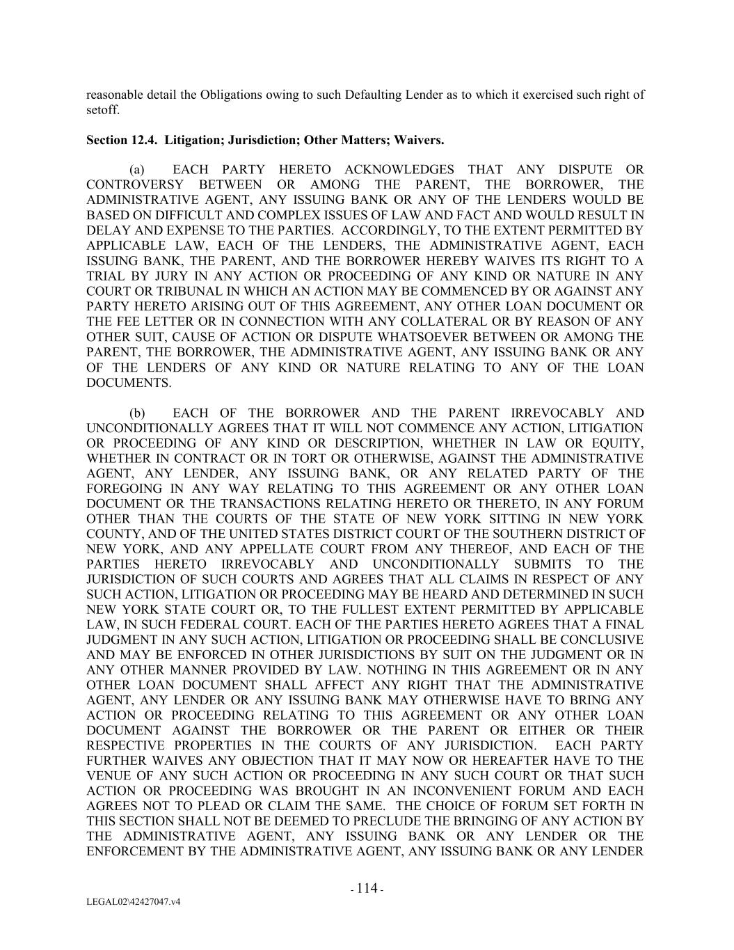 reasonable detail the Obligations owing to such Defaulting Lender as to which it exercised such right of setoff. Section 12.4. Litigation; Jurisdiction; Other Matters; Waivers. (a) EACH PARTY HERETO ACKNOWLEDGES THAT ANY DISPUTE OR CONTROVERSY BETWEEN OR AMONG THE PARENT, THE BORROWER, THE ADMINISTRATIVE AGENT, ANY ISSUING BANK OR ANY OF THE LENDERS WOULD BE BASED ON DIFFICULT AND COMPLEX ISSUES OF LAW AND FACT AND WOULD RESULT IN DELAY AND EXPENSE TO THE PARTIES. ACCORDINGLY, TO THE EXTENT PERMITTED BY APPLICABLE LAW, EACH OF THE LENDERS, THE ADMINISTRATIVE AGENT, EACH ISSUING BANK, THE PARENT, AND THE BORROWER HEREBY WAIVES ITS RIGHT TO A TRIAL BY JURY IN ANY ACTION OR PROCEEDING OF ANY KIND OR NATURE IN ANY COURT OR TRIBUNAL IN WHICH AN ACTION MAY BE COMMENCED BY OR AGAINST ANY PARTY HERETO ARISING OUT OF THIS AGREEMENT, ANY OTHER LOAN DOCUMENT OR THE FEE LETTER OR IN CONNECTION WITH ANY COLLATERAL OR BY REASON OF ANY OTHER SUIT, CAUSE OF ACTION OR DISPUTE WHATSOEVER BETWEEN OR AMONG THE PARENT, THE BORROWER, THE ADMINISTRATIVE AGENT, ANY ISSUING BANK OR ANY OF THE LENDERS OF ANY KIND OR NATURE RELATING TO ANY OF THE LOAN DOCUMENTS. (b) EACH OF THE BORROWER AND THE PARENT IRREVOCABLY AND UNCONDITIONALLY AGREES THAT IT WILL NOT COMMENCE ANY ACTION, LITIGATION OR PROCEEDING OF ANY KIND OR DESCRIPTION, WHETHER IN LAW OR EQUITY, WHETHER IN CONTRACT OR IN TORT OR OTHERWISE, AGAINST THE ADMINISTRATIVE AGENT, ANY LENDER, ANY ISSUING BANK, OR ANY RELATED PARTY OF THE FOREGOING IN ANY WAY RELATING TO THIS AGREEMENT OR ANY OTHER LOAN DOCUMENT OR THE TRANSACTIONS RELATING HERETO OR THERETO, IN ANY FORUM OTHER THAN THE COURTS OF THE STATE OF NEW YORK SITTING IN NEW YORK COUNTY, AND OF THE UNITED STATES DISTRICT COURT OF THE SOUTHERN DISTRICT OF NEW YORK, AND ANY APPELLATE COURT FROM ANY THEREOF, AND EACH OF THE PARTIES HERETO IRREVOCABLY AND UNCONDITIONALLY SUBMITS TO THE JURISDICTION OF SUCH COURTS AND AGREES THAT ALL CLAIMS IN RESPECT OF ANY SUCH ACTION, LITIGATION OR PROCEEDING MAY BE HEARD AND DETERMINED IN SUCH NEW YORK STATE COURT OR, TO THE FULLEST EXTENT PERMITTED BY APPLICABLE LAW, IN SUCH FEDERAL COURT. EACH OF THE PARTIES HERETO AGREES THAT A FINAL JUDGMENT IN ANY SUCH ACTION, LITIGATION OR PROCEEDING SHALL BE CONCLUSIVE AND MAY BE ENFORCED IN OTHER JURISDICTIONS BY SUIT ON THE JUDGMENT OR IN ANY OTHER MANNER PROVIDED BY LAW. NOTHING IN THIS AGREEMENT OR IN ANY OTHER LOAN DOCUMENT SHALL AFFECT ANY RIGHT THAT THE ADMINISTRATIVE AGENT, ANY LENDER OR ANY ISSUING BANK MAY OTHERWISE HAVE TO BRING ANY ACTION OR PROCEEDING RELATING TO THIS AGREEMENT OR ANY OTHER LOAN DOCUMENT AGAINST THE BORROWER OR THE PARENT OR EITHER OR THEIR RESPECTIVE PROPERTIES IN THE COURTS OF ANY JURISDICTION. EACH PARTY FURTHER WAIVES ANY OBJECTION THAT IT MAY NOW OR HEREAFTER HAVE TO THE VENUE OF ANY SUCH ACTION OR PROCEEDING IN ANY SUCH COURT OR THAT SUCH ACTION OR PROCEEDING WAS BROUGHT IN AN INCONVENIENT FORUM AND EACH AGREES NOT TO PLEAD OR CLAIM THE SAME. THE CHOICE OF FORUM SET FORTH IN THIS SECTION SHALL NOT BE DEEMED TO PRECLUDE THE BRINGING OF ANY ACTION BY THE ADMINISTRATIVE AGENT, ANY ISSUING BANK OR ANY LENDER OR THE ENFORCEMENT BY THE ADMINISTRATIVE AGENT, ANY ISSUING BANK OR ANY LENDER - 114 - LEGAL02\42427047.v4