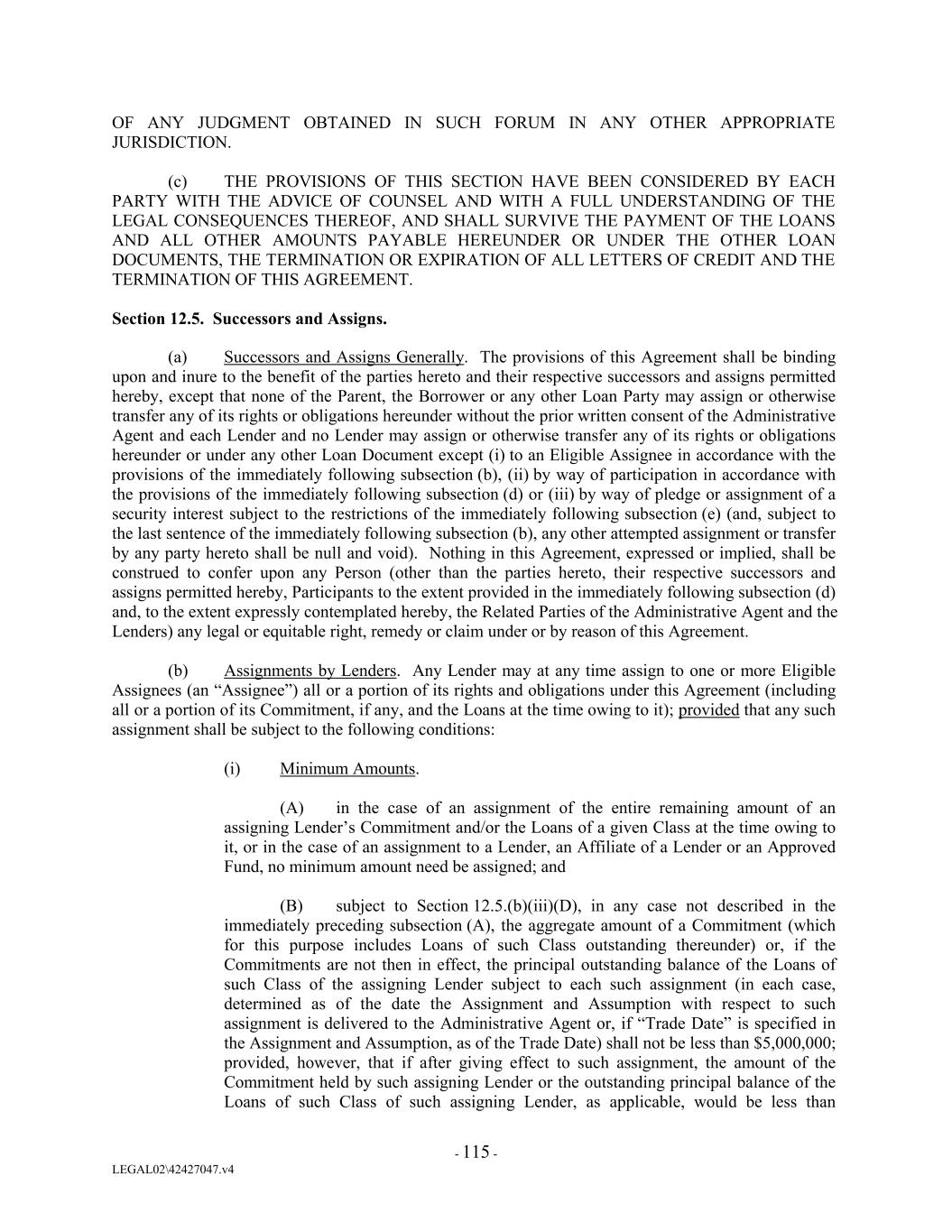 OF ANY JUDGMENT OBTAINED IN SUCH FORUM IN ANY OTHER APPROPRIATE JURISDICTION. (c) THE PROVISIONS OF THIS SECTION HAVE BEEN CONSIDERED BY EACH PARTY WITH THE ADVICE OF COUNSEL AND WITH A FULL UNDERSTANDING OF THE LEGAL CONSEQUENCES THEREOF, AND SHALL SURVIVE THE PAYMENT OF THE LOANS AND ALL OTHER AMOUNTS PAYABLE HEREUNDER OR UNDER THE OTHER LOAN DOCUMENTS, THE TERMINATION OR EXPIRATION OF ALL LETTERS OF CREDIT AND THE TERMINATION OF THIS AGREEMENT. Section 12.5. Successors and Assigns. (a) Successors and Assigns Generally. The provisions of this Agreement shall be binding upon and inure to the benefit of the parties hereto and their respective successors and assigns permitted hereby, except that none of the Parent, the Borrower or any other Loan Party may assign or otherwise transfer any of its rights or obligations hereunder without the prior written consent of the Administrative Agent and each Lender and no Lender may assign or otherwise transfer any of its rights or obligations hereunder or under any other Loan Document except (i) to an Eligible Assignee in accordance with the provisions of the immediately following subsection (b), (ii) by way of participation in accordance with the provisions of the immediately following subsection (d) or (iii) by way of pledge or assignment of a security interest subject to the restrictions of the immediately following subsection (e) (and, subject to the last sentence of the immediately following subsection (b), any other attempted assignment or transfer by any party hereto shall be null and void). Nothing in this Agreement, expressed or implied, shall be construed to confer upon any Person (other than the parties hereto, their respective successors and assigns permitted hereby, Participants to the extent provided in the immediately following subsection (d) and, to the extent expressly contemplated hereby, the Related Parties of the Administrative Agent and the Lenders) any legal or equitable right, remedy or claim under or by reason of this Agreement. (b) Assignments by Lenders. Any Lender may at any time assign to one or more Eligible Assignees (an “Assignee”) all or a portion of its rights and obligations under this Agreement (including all or a portion of its Commitment, if any, and the Loans at the time owing to it); provided that any such assignment shall be subject to the following conditions: (i) Minimum Amounts. (A) in the case of an assignment of the entire remaining amount of an assigning Lender’s Commitment and/or the Loans of a given Class at the time owing to it, or in the case of an assignment to a Lender, an Affiliate of a Lender or an Approved Fund, no minimum amount need be assigned; and (B) subject to Section 12.5.(b)(iii)(D), in any case not described in the immediately preceding subsection (A), the aggregate amount of a Commitment (which for this purpose includes Loans of such Class outstanding thereunder) or, if the Commitments are not then in effect, the principal outstanding balance of the Loans of such Class of the assigning Lender subject to each such assignment (in each case, determined as of the date the Assignment and Assumption with respect to such assignment is delivered to the Administrative Agent or, if “Trade Date” is specified in the Assignment and Assumption, as of the Trade Date) shall not be less than $5,000,000; provided, however, that if after giving effect to such assignment, the amount of the Commitment held by such assigning Lender or the outstanding principal balance of the Loans of such Class of such assigning Lender, as applicable, would be less than - 115 - LEGAL02\42427047.v4