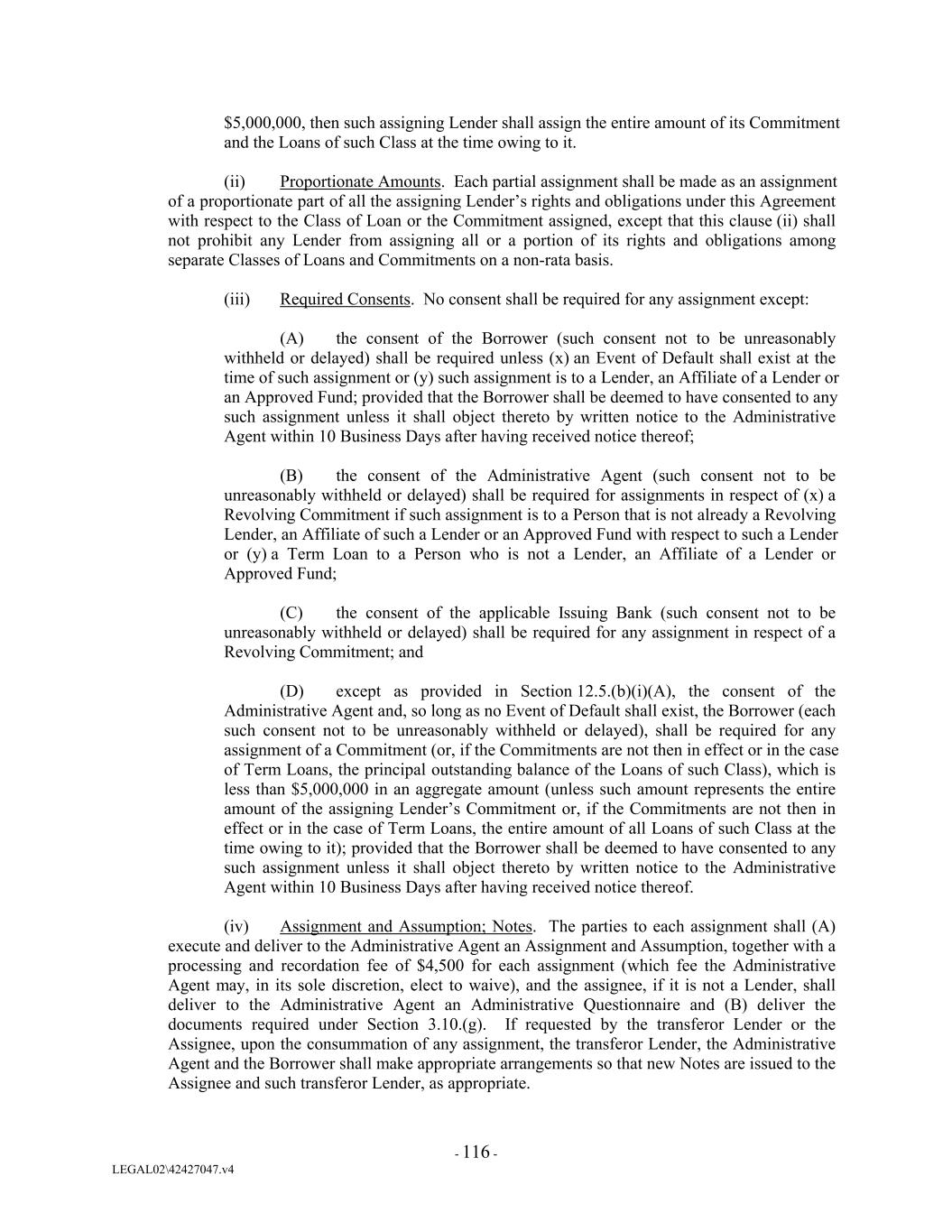 $5,000,000, then such assigning Lender shall assign the entire amount of its Commitment and the Loans of such Class at the time owing to it. (ii) Proportionate Amounts. Each partial assignment shall be made as an assignment of a proportionate part of all the assigning Lender’s rights and obligations under this Agreement with respect to the Class of Loan or the Commitment assigned, except that this clause (ii) shall not prohibit any Lender from assigning all or a portion of its rights and obligations among separate Classes of Loans and Commitments on a non-rata basis. (iii) Required Consents. No consent shall be required for any assignment except: (A) the consent of the Borrower (such consent not to be unreasonably withheld or delayed) shall be required unless (x) an Event of Default shall exist at the time of such assignment or (y) such assignment is to a Lender, an Affiliate of a Lender or an Approved Fund; provided that the Borrower shall be deemed to have consented to any such assignment unless it shall object thereto by written notice to the Administrative Agent within 10 Business Days after having received notice thereof; (B) the consent of the Administrative Agent (such consent not to be unreasonably withheld or delayed) shall be required for assignments in respect of (x) a Revolving Commitment if such assignment is to a Person that is not already a Revolving Lender, an Affiliate of such a Lender or an Approved Fund with respect to such a Lender or (y) a Term Loan to a Person who is not a Lender, an Affiliate of a Lender or Approved Fund; (C) the consent of the applicable Issuing Bank (such consent not to be unreasonably withheld or delayed) shall be required for any assignment in respect of a Revolving Commitment; and (D) except as provided in Section 12.5.(b)(i)(A), the consent of the Administrative Agent and, so long as no Event of Default shall exist, the Borrower (each such consent not to be unreasonably withheld or delayed), shall be required for any assignment of a Commitment (or, if the Commitments are not then in effect or in the case of Term Loans, the principal outstanding balance of the Loans of such Class), which is less than $5,000,000 in an aggregate amount (unless such amount represents the entire amount of the assigning Lender’s Commitment or, if the Commitments are not then in effect or in the case of Term Loans, the entire amount of all Loans of such Class at the time owing to it); provided that the Borrower shall be deemed to have consented to any such assignment unless it shall object thereto by written notice to the Administrative Agent within 10 Business Days after having received notice thereof. (iv) Assignment and Assumption; Notes. The parties to each assignment shall (A) execute and deliver to the Administrative Agent an Assignment and Assumption, together with a processing and recordation fee of $4,500 for each assignment (which fee the Administrative Agent may, in its sole discretion, elect to waive), and the assignee, if it is not a Lender, shall deliver to the Administrative Agent an Administrative Questionnaire and (B) deliver the documents required under Section 3.10.(g). If requested by the transferor Lender or the Assignee, upon the consummation of any assignment, the transferor Lender, the Administrative Agent and the Borrower shall make appropriate arrangements so that new Notes are issued to the Assignee and such transferor Lender, as appropriate. - 116 - LEGAL02\42427047.v4