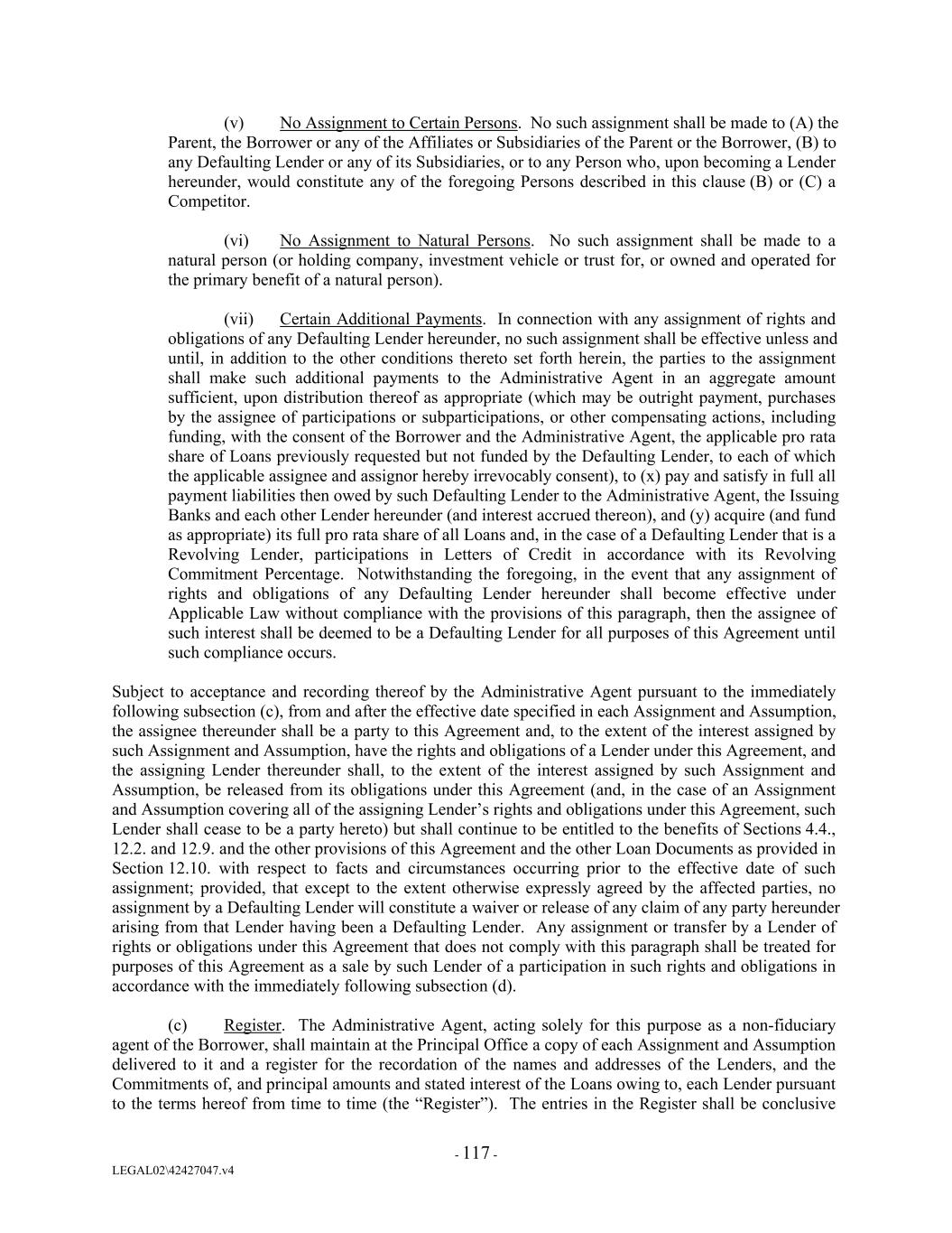 (v) No Assignment to Certain Persons. No such assignment shall be made to (A) the Parent, the Borrower or any of the Affiliates or Subsidiaries of the Parent or the Borrower, (B) to any Defaulting Lender or any of its Subsidiaries, or to any Person who, upon becoming a Lender hereunder, would constitute any of the foregoing Persons described in this clause (B) or (C) a Competitor. (vi) No Assignment to Natural Persons. No such assignment shall be made to a natural person (or holding company, investment vehicle or trust for, or owned and operated for the primary benefit of a natural person). (vii) Certain Additional Payments. In connection with any assignment of rights and obligations of any Defaulting Lender hereunder, no such assignment shall be effective unless and until, in addition to the other conditions thereto set forth herein, the parties to the assignment shall make such additional payments to the Administrative Agent in an aggregate amount sufficient, upon distribution thereof as appropriate (which may be outright payment, purchases by the assignee of participations or subparticipations, or other compensating actions, including funding, with the consent of the Borrower and the Administrative Agent, the applicable pro rata share of Loans previously requested but not funded by the Defaulting Lender, to each of which the applicable assignee and assignor hereby irrevocably consent), to (x) pay and satisfy in full all payment liabilities then owed by such Defaulting Lender to the Administrative Agent, the Issuing Banks and each other Lender hereunder (and interest accrued thereon), and (y) acquire (and fund as appropriate) its full pro rata share of all Loans and, in the case of a Defaulting Lender that is a Revolving Lender, participations in Letters of Credit in accordance with its Revolving Commitment Percentage. Notwithstanding the foregoing, in the event that any assignment of rights and obligations of any Defaulting Lender hereunder shall become effective under Applicable Law without compliance with the provisions of this paragraph, then the assignee of such interest shall be deemed to be a Defaulting Lender for all purposes of this Agreement until such compliance occurs. Subject to acceptance and recording thereof by the Administrative Agent pursuant to the immediately following subsection (c), from and after the effective date specified in each Assignment and Assumption, the assignee thereunder shall be a party to this Agreement and, to the extent of the interest assigned by such Assignment and Assumption, have the rights and obligations of a Lender under this Agreement, and the assigning Lender thereunder shall, to the extent of the interest assigned by such Assignment and Assumption, be released from its obligations under this Agreement (and, in the case of an Assignment and Assumption covering all of the assigning Lender’s rights and obligations under this Agreement, such Lender shall cease to be a party hereto) but shall continue to be entitled to the benefits of Sections 4.4., 12.2. and 12.9. and the other provisions of this Agreement and the other Loan Documents as provided in Section 12.10. with respect to facts and circumstances occurring prior to the effective date of such assignment; provided, that except to the extent otherwise expressly agreed by the affected parties, no assignment by a Defaulting Lender will constitute a waiver or release of any claim of any party hereunder arising from that Lender having been a Defaulting Lender. Any assignment or transfer by a Lender of rights or obligations under this Agreement that does not comply with this paragraph shall be treated for purposes of this Agreement as a sale by such Lender of a participation in such rights and obligations in accordance with the immediately following subsection (d). (c) Register. The Administrative Agent, acting solely for this purpose as a non-fiduciary agent of the Borrower, shall maintain at the Principal Office a copy of each Assignment and Assumption delivered to it and a register for the recordation of the names and addresses of the Lenders, and the Commitments of, and principal amounts and stated interest of the Loans owing to, each Lender pursuant to the terms hereof from time to time (the “Register”). The entries in the Register shall be conclusive - 117 - LEGAL02\42427047.v4