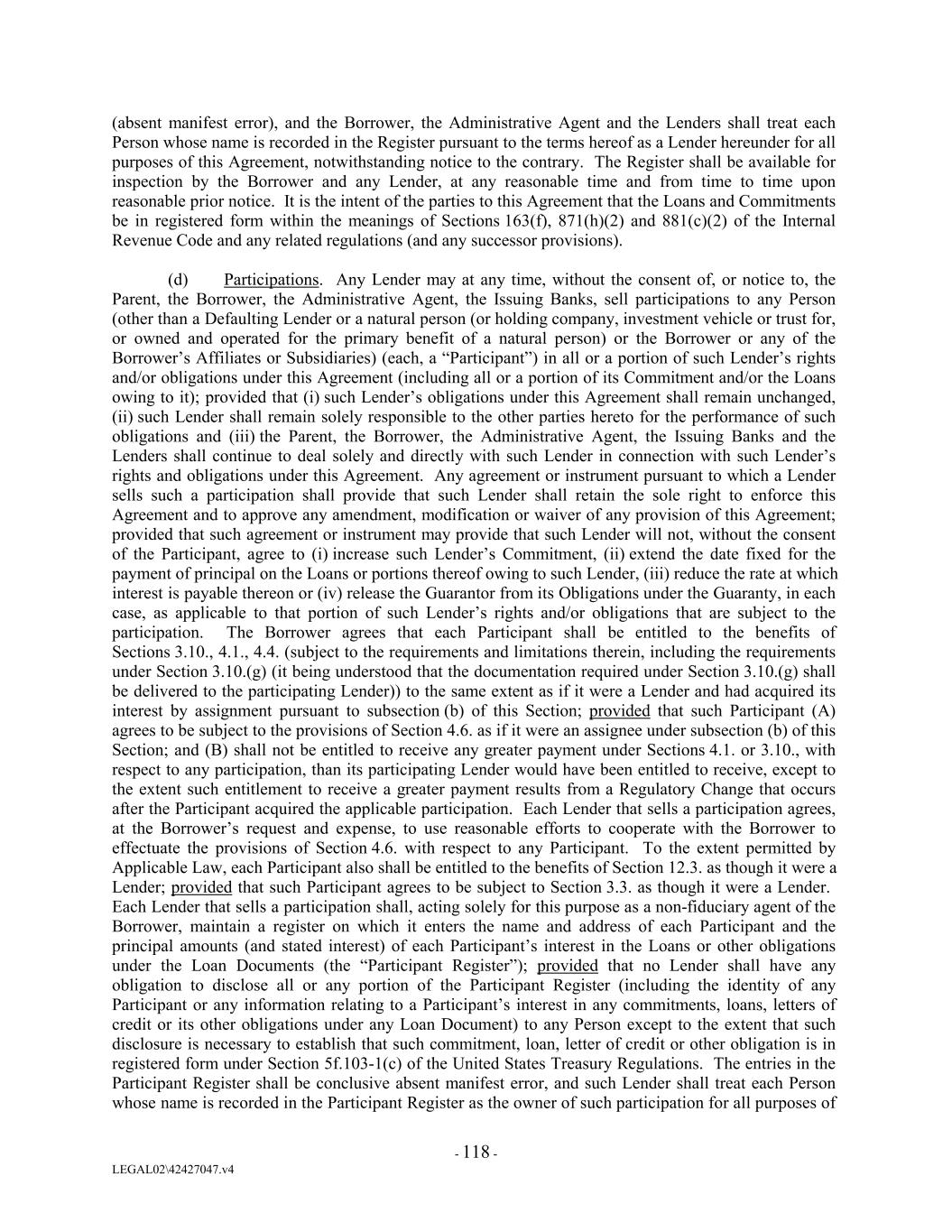 (absent manifest error), and the Borrower, the Administrative Agent and the Lenders shall treat each Person whose name is recorded in the Register pursuant to the terms hereof as a Lender hereunder for all purposes of this Agreement, notwithstanding notice to the contrary. The Register shall be available for inspection by the Borrower and any Lender, at any reasonable time and from time to time upon reasonable prior notice. It is the intent of the parties to this Agreement that the Loans and Commitments be in registered form within the meanings of Sections 163(f), 871(h)(2) and 881(c)(2) of the Internal Revenue Code and any related regulations (and any successor provisions). (d) Participations. Any Lender may at any time, without the consent of, or notice to, the Parent, the Borrower, the Administrative Agent, the Issuing Banks, sell participations to any Person (other than a Defaulting Lender or a natural person (or holding company, investment vehicle or trust for, or owned and operated for the primary benefit of a natural person) or the Borrower or any of the Borrower’s Affiliates or Subsidiaries) (each, a “Participant”) in all or a portion of such Lender’s rights and/or obligations under this Agreement (including all or a portion of its Commitment and/or the Loans owing to it); provided that (i) such Lender’s obligations under this Agreement shall remain unchanged, (ii) such Lender shall remain solely responsible to the other parties hereto for the performance of such obligations and (iii) the Parent, the Borrower, the Administrative Agent, the Issuing Banks and the Lenders shall continue to deal solely and directly with such Lender in connection with such Lender’s rights and obligations under this Agreement. Any agreement or instrument pursuant to which a Lender sells such a participation shall provide that such Lender shall retain the sole right to enforce this Agreement and to approve any amendment, modification or waiver of any provision of this Agreement; provided that such agreement or instrument may provide that such Lender will not, without the consent of the Participant, agree to (i) increase such Lender’s Commitment, (ii) extend the date fixed for the payment of principal on the Loans or portions thereof owing to such Lender, (iii) reduce the rate at which interest is payable thereon or (iv) release the Guarantor from its Obligations under the Guaranty, in each case, as applicable to that portion of such Lender’s rights and/or obligations that are subject to the participation. The Borrower agrees that each Participant shall be entitled to the benefits of Sections 3.10., 4.1., 4.4. (subject to the requirements and limitations therein, including the requirements under Section 3.10.(g) (it being understood that the documentation required under Section 3.10.(g) shall be delivered to the participating Lender)) to the same extent as if it were a Lender and had acquired its interest by assignment pursuant to subsection (b) of this Section; provided that such Participant (A) agrees to be subject to the provisions of Section 4.6. as if it were an assignee under subsection (b) of this Section; and (B) shall not be entitled to receive any greater payment under Sections 4.1. or 3.10., with respect to any participation, than its participating Lender would have been entitled to receive, except to the extent such entitlement to receive a greater payment results from a Regulatory Change that occurs after the Participant acquired the applicable participation. Each Lender that sells a participation agrees, at the Borrower’s request and expense, to use reasonable efforts to cooperate with the Borrower to effectuate the provisions of Section 4.6. with respect to any Participant. To the extent permitted by Applicable Law, each Participant also shall be entitled to the benefits of Section 12.3. as though it were a Lender; provided that such Participant agrees to be subject to Section 3.3. as though it were a Lender. Each Lender that sells a participation shall, acting solely for this purpose as a non-fiduciary agent of the Borrower, maintain a register on which it enters the name and address of each Participant and the principal amounts (and stated interest) of each Participant’s interest in the Loans or other obligations under the Loan Documents (the “Participant Register”); provided that no Lender shall have any obligation to disclose all or any portion of the Participant Register (including the identity of any Participant or any information relating to a Participant’s interest in any commitments, loans, letters of credit or its other obligations under any Loan Document) to any Person except to the extent that such disclosure is necessary to establish that such commitment, loan, letter of credit or other obligation is in registered form under Section 5f.103-1(c) of the United States Treasury Regulations. The entries in the Participant Register shall be conclusive absent manifest error, and such Lender shall treat each Person whose name is recorded in the Participant Register as the owner of such participation for all purposes of - 118 - LEGAL02\42427047.v4