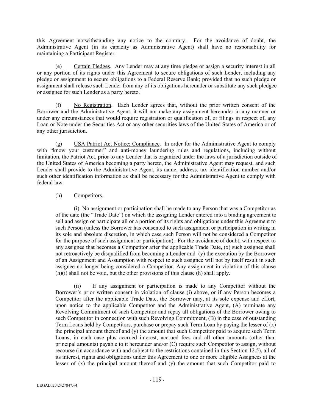 this Agreement notwithstanding any notice to the contrary. For the avoidance of doubt, the Administrative Agent (in its capacity as Administrative Agent) shall have no responsibility for maintaining a Participant Register. (e) Certain Pledges. Any Lender may at any time pledge or assign a security interest in all or any portion of its rights under this Agreement to secure obligations of such Lender, including any pledge or assignment to secure obligations to a Federal Reserve Bank; provided that no such pledge or assignment shall release such Lender from any of its obligations hereunder or substitute any such pledgee or assignee for such Lender as a party hereto. (f) No Registration. Each Lender agrees that, without the prior written consent of the Borrower and the Administrative Agent, it will not make any assignment hereunder in any manner or under any circumstances that would require registration or qualification of, or filings in respect of, any Loan or Note under the Securities Act or any other securities laws of the United States of America or of any other jurisdiction. (g) USA Patriot Act Notice; Compliance. In order for the Administrative Agent to comply with “know your customer” and anti-money laundering rules and regulations, including without limitation, the Patriot Act, prior to any Lender that is organized under the laws of a jurisdiction outside of the United States of America becoming a party hereto, the Administrative Agent may request, and such Lender shall provide to the Administrative Agent, its name, address, tax identification number and/or such other identification information as shall be necessary for the Administrative Agent to comply with federal law. (h) Competitors. (i) No assignment or participation shall be made to any Person that was a Competitor as of the date (the “Trade Date”) on which the assigning Lender entered into a binding agreement to sell and assign or participate all or a portion of its rights and obligations under this Agreement to such Person (unless the Borrower has consented to such assignment or participation in writing in its sole and absolute discretion, in which case such Person will not be considered a Competitor for the purpose of such assignment or participation). For the avoidance of doubt, with respect to any assignee that becomes a Competitor after the applicable Trade Date, (x) such assignee shall not retroactively be disqualified from becoming a Lender and (y) the execution by the Borrower of an Assignment and Assumption with respect to such assignee will not by itself result in such assignee no longer being considered a Competitor. Any assignment in violation of this clause (h)(i) shall not be void, but the other provisions of this clause (h) shall apply. (ii) If any assignment or participation is made to any Competitor without the Borrower’s prior written consent in violation of clause (i) above, or if any Person becomes a Competitor after the applicable Trade Date, the Borrower may, at its sole expense and effort, upon notice to the applicable Competitor and the Administrative Agent, (A) terminate any Revolving Commitment of such Competitor and repay all obligations of the Borrower owing to such Competitor in connection with such Revolving Commitment, (B) in the case of outstanding Term Loans held by Competitors, purchase or prepay such Term Loan by paying the lesser of (x) the principal amount thereof and (y) the amount that such Competitor paid to acquire such Term Loans, in each case plus accrued interest, accrued fees and all other amounts (other than principal amounts) payable to it hereunder and/or (C) require such Competitor to assign, without recourse (in accordance with and subject to the restrictions contained in this Section 12.5), all of its interest, rights and obligations under this Agreement to one or more Eligible Assignees at the lesser of (x) the principal amount thereof and (y) the amount that such Competitor paid to - 119 - LEGAL02\42427047.v4