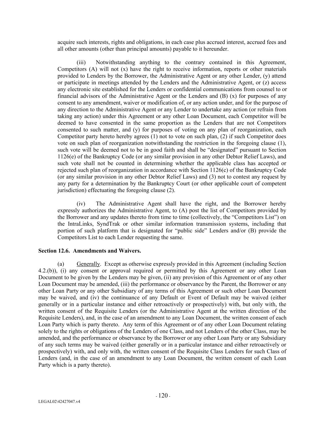 acquire such interests, rights and obligations, in each case plus accrued interest, accrued fees and all other amounts (other than principal amounts) payable to it hereunder. (iii) Notwithstanding anything to the contrary contained in this Agreement, Competitors (A) will not (x) have the right to receive information, reports or other materials provided to Lenders by the Borrower, the Administrative Agent or any other Lender, (y) attend or participate in meetings attended by the Lenders and the Administrative Agent, or (z) access any electronic site established for the Lenders or confidential communications from counsel to or financial advisors of the Administrative Agent or the Lenders and (B) (x) for purposes of any consent to any amendment, waiver or modification of, or any action under, and for the purpose of any direction to the Administrative Agent or any Lender to undertake any action (or refrain from taking any action) under this Agreement or any other Loan Document, each Competitor will be deemed to have consented in the same proportion as the Lenders that are not Competitors consented to such matter, and (y) for purposes of voting on any plan of reorganization, each Competitor party hereto hereby agrees (1) not to vote on such plan, (2) if such Competitor does vote on such plan of reorganization notwithstanding the restriction in the foregoing clause (1), such vote will be deemed not to be in good faith and shall be “designated” pursuant to Section 1126(e) of the Bankruptcy Code (or any similar provision in any other Debtor Relief Laws), and such vote shall not be counted in determining whether the applicable class has accepted or rejected such plan of reorganization in accordance with Section 1126(c) of the Bankruptcy Code (or any similar provision in any other Debtor Relief Laws) and (3) not to contest any request by any party for a determination by the Bankruptcy Court (or other applicable court of competent jurisdiction) effectuating the foregoing clause (2). (iv) The Administrative Agent shall have the right, and the Borrower hereby expressly authorizes the Administrative Agent, to (A) post the list of Competitors provided by the Borrower and any updates thereto from time to time (collectively, the “Competitors List”) on the IntraLinks, SyndTrak or other similar information transmission systems, including that portion of such platform that is designated for “public side” Lenders and/or (B) provide the Competitors List to each Lender requesting the same. Section 12.6. Amendments and Waivers. (a) Generally. Except as otherwise expressly provided in this Agreement (including Section 4.2.(b)), (i) any consent or approval required or permitted by this Agreement or any other Loan Document to be given by the Lenders may be given, (ii) any provision of this Agreement or of any other Loan Document may be amended, (iii) the performance or observance by the Parent, the Borrower or any other Loan Party or any other Subsidiary of any terms of this Agreement or such other Loan Document may be waived, and (iv) the continuance of any Default or Event of Default may be waived (either generally or in a particular instance and either retroactively or prospectively) with, but only with, the written consent of the Requisite Lenders (or the Administrative Agent at the written direction of the Requisite Lenders), and, in the case of an amendment to any Loan Document, the written consent of each Loan Party which is party thereto. Any term of this Agreement or of any other Loan Document relating solely to the rights or obligations of the Lenders of one Class, and not Lenders of the other Class, may be amended, and the performance or observance by the Borrower or any other Loan Party or any Subsidiary of any such terms may be waived (either generally or in a particular instance and either retroactively or prospectively) with, and only with, the written consent of the Requisite Class Lenders for such Class of Lenders (and, in the case of an amendment to any Loan Document, the written consent of each Loan Party which is a party thereto). - 120 - LEGAL02\42427047.v4