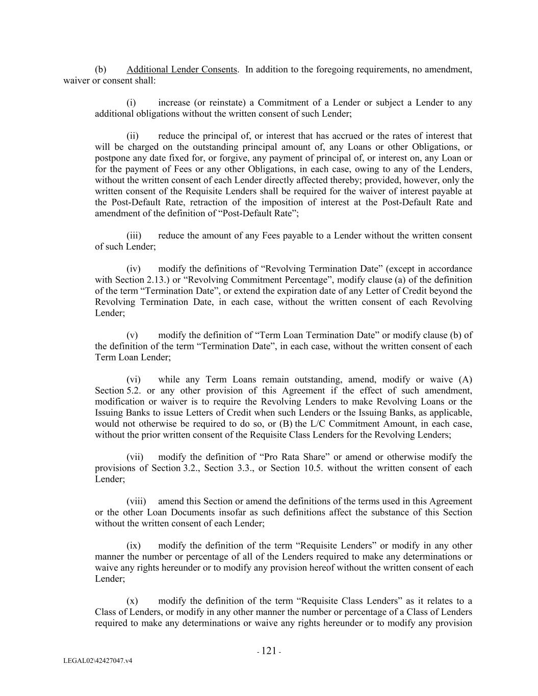 (b) Additional Lender Consents. In addition to the foregoing requirements, no amendment, waiver or consent shall: (i) increase (or reinstate) a Commitment of a Lender or subject a Lender to any additional obligations without the written consent of such Lender; (ii) reduce the principal of, or interest that has accrued or the rates of interest that will be charged on the outstanding principal amount of, any Loans or other Obligations, or postpone any date fixed for, or forgive, any payment of principal of, or interest on, any Loan or for the payment of Fees or any other Obligations, in each case, owing to any of the Lenders, without the written consent of each Lender directly affected thereby; provided, however, only the written consent of the Requisite Lenders shall be required for the waiver of interest payable at the Post-Default Rate, retraction of the imposition of interest at the Post-Default Rate and amendment of the definition of “Post-Default Rate”; (iii) reduce the amount of any Fees payable to a Lender without the written consent of such Lender; (iv) modify the definitions of “Revolving Termination Date” (except in accordance with Section 2.13.) or “Revolving Commitment Percentage”, modify clause (a) of the definition of the term “Termination Date”, or extend the expiration date of any Letter of Credit beyond the Revolving Termination Date, in each case, without the written consent of each Revolving Lender; (v) modify the definition of “Term Loan Termination Date” or modify clause (b) of the definition of the term “Termination Date”, in each case, without the written consent of each Term Loan Lender; (vi) while any Term Loans remain outstanding, amend, modify or waive (A) Section 5.2. or any other provision of this Agreement if the effect of such amendment, modification or waiver is to require the Revolving Lenders to make Revolving Loans or the Issuing Banks to issue Letters of Credit when such Lenders or the Issuing Banks, as applicable, would not otherwise be required to do so, or (B) the L/C Commitment Amount, in each case, without the prior written consent of the Requisite Class Lenders for the Revolving Lenders; (vii) modify the definition of “Pro Rata Share” or amend or otherwise modify the provisions of Section 3.2., Section 3.3., or Section 10.5. without the written consent of each Lender; (viii) amend this Section or amend the definitions of the terms used in this Agreement or the other Loan Documents insofar as such definitions affect the substance of this Section without the written consent of each Lender; (ix) modify the definition of the term “Requisite Lenders” or modify in any other manner the number or percentage of all of the Lenders required to make any determinations or waive any rights hereunder or to modify any provision hereof without the written consent of each Lender; (x) modify the definition of the term “Requisite Class Lenders” as it relates to a Class of Lenders, or modify in any other manner the number or percentage of a Class of Lenders required to make any determinations or waive any rights hereunder or to modify any provision - 121 - LEGAL02\42427047.v4