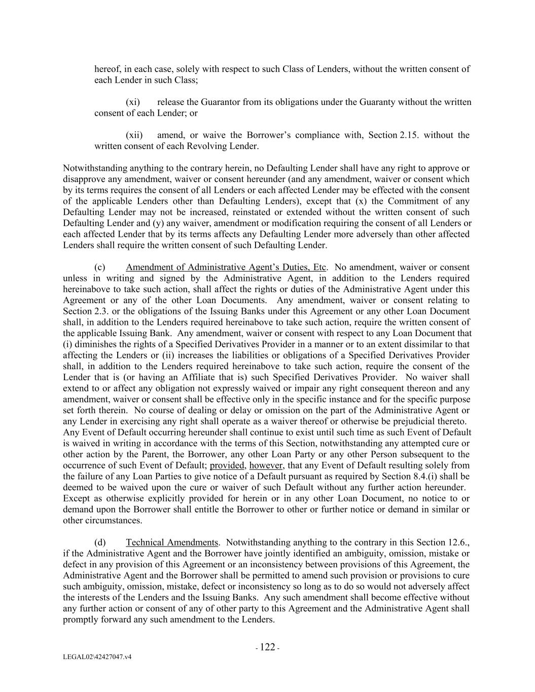 hereof, in each case, solely with respect to such Class of Lenders, without the written consent of each Lender in such Class; (xi) release the Guarantor from its obligations under the Guaranty without the written consent of each Lender; or (xii) amend, or waive the Borrower’s compliance with, Section 2.15. without the written consent of each Revolving Lender. Notwithstanding anything to the contrary herein, no Defaulting Lender shall have any right to approve or disapprove any amendment, waiver or consent hereunder (and any amendment, waiver or consent which by its terms requires the consent of all Lenders or each affected Lender may be effected with the consent of the applicable Lenders other than Defaulting Lenders), except that (x) the Commitment of any Defaulting Lender may not be increased, reinstated or extended without the written consent of such Defaulting Lender and (y) any waiver, amendment or modification requiring the consent of all Lenders or each affected Lender that by its terms affects any Defaulting Lender more adversely than other affected Lenders shall require the written consent of such Defaulting Lender. (c) Amendment of Administrative Agent’s Duties, Etc. No amendment, waiver or consent unless in writing and signed by the Administrative Agent, in addition to the Lenders required hereinabove to take such action, shall affect the rights or duties of the Administrative Agent under this Agreement or any of the other Loan Documents. Any amendment, waiver or consent relating to Section 2.3. or the obligations of the Issuing Banks under this Agreement or any other Loan Document shall, in addition to the Lenders required hereinabove to take such action, require the written consent of the applicable Issuing Bank. Any amendment, waiver or consent with respect to any Loan Document that (i) diminishes the rights of a Specified Derivatives Provider in a manner or to an extent dissimilar to that affecting the Lenders or (ii) increases the liabilities or obligations of a Specified Derivatives Provider shall, in addition to the Lenders required hereinabove to take such action, require the consent of the Lender that is (or having an Affiliate that is) such Specified Derivatives Provider. No waiver shall extend to or affect any obligation not expressly waived or impair any right consequent thereon and any amendment, waiver or consent shall be effective only in the specific instance and for the specific purpose set forth therein. No course of dealing or delay or omission on the part of the Administrative Agent or any Lender in exercising any right shall operate as a waiver thereof or otherwise be prejudicial thereto. Any Event of Default occurring hereunder shall continue to exist until such time as such Event of Default is waived in writing in accordance with the terms of this Section, notwithstanding any attempted cure or other action by the Parent, the Borrower, any other Loan Party or any other Person subsequent to the occurrence of such Event of Default; provided, however, that any Event of Default resulting solely from the failure of any Loan Parties to give notice of a Default pursuant as required by Section 8.4.(i) shall be deemed to be waived upon the cure or waiver of such Default without any further action hereunder. Except as otherwise explicitly provided for herein or in any other Loan Document, no notice to or demand upon the Borrower shall entitle the Borrower to other or further notice or demand in similar or other circumstances. (d) Technical Amendments. Notwithstanding anything to the contrary in this Section 12.6., if the Administrative Agent and the Borrower have jointly identified an ambiguity, omission, mistake or defect in any provision of this Agreement or an inconsistency between provisions of this Agreement, the Administrative Agent and the Borrower shall be permitted to amend such provision or provisions to cure such ambiguity, omission, mistake, defect or inconsistency so long as to do so would not adversely affect the interests of the Lenders and the Issuing Banks. Any such amendment shall become effective without any further action or consent of any of other party to this Agreement and the Administrative Agent shall promptly forward any such amendment to the Lenders. - 122 - LEGAL02\42427047.v4