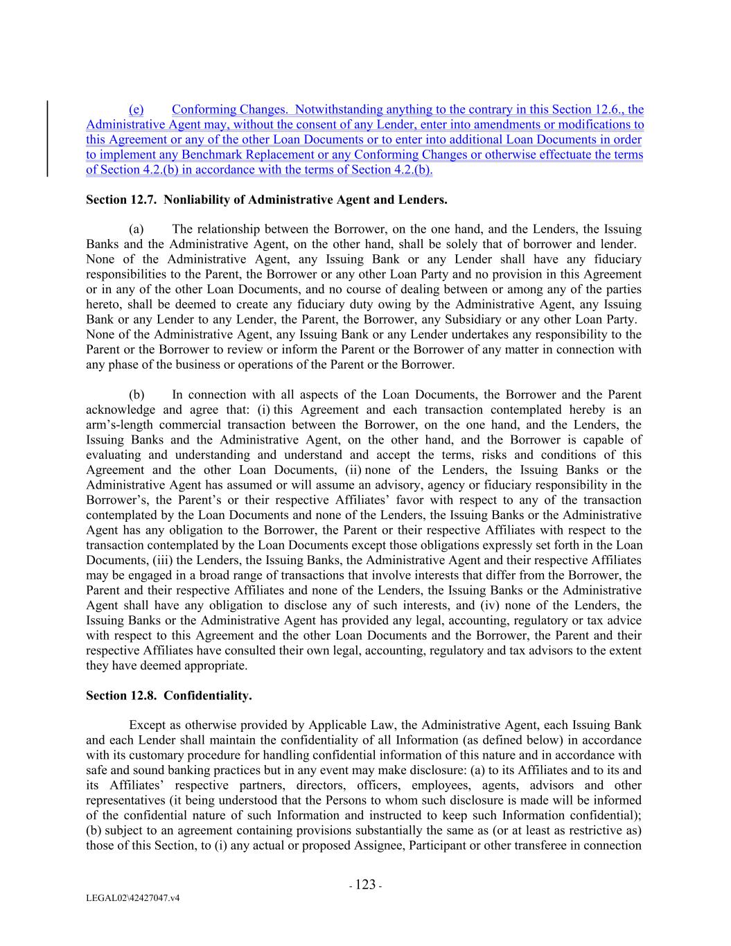 (e) Conforming Changes. Notwithstanding anything to the contrary in this Section 12.6., the Administrative Agent may, without the consent of any Lender, enter into amendments or modifications to this Agreement or any of the other Loan Documents or to enter into additional Loan Documents in order to implement any Benchmark Replacement or any Conforming Changes or otherwise effectuate the terms of Section 4.2.(b) in accordance with the terms of Section 4.2.(b). Section 12.7. Nonliability of Administrative Agent and Lenders. (a) The relationship between the Borrower, on the one hand, and the Lenders, the Issuing Banks and the Administrative Agent, on the other hand, shall be solely that of borrower and lender. None of the Administrative Agent, any Issuing Bank or any Lender shall have any fiduciary responsibilities to the Parent, the Borrower or any other Loan Party and no provision in this Agreement or in any of the other Loan Documents, and no course of dealing between or among any of the parties hereto, shall be deemed to create any fiduciary duty owing by the Administrative Agent, any Issuing Bank or any Lender to any Lender, the Parent, the Borrower, any Subsidiary or any other Loan Party. None of the Administrative Agent, any Issuing Bank or any Lender undertakes any responsibility to the Parent or the Borrower to review or inform the Parent or the Borrower of any matter in connection with any phase of the business or operations of the Parent or the Borrower. (b) In connection with all aspects of the Loan Documents, the Borrower and the Parent acknowledge and agree that: (i) this Agreement and each transaction contemplated hereby is an arm’s-length commercial transaction between the Borrower, on the one hand, and the Lenders, the Issuing Banks and the Administrative Agent, on the other hand, and the Borrower is capable of evaluating and understanding and understand and accept the terms, risks and conditions of this Agreement and the other Loan Documents, (ii) none of the Lenders, the Issuing Banks or the Administrative Agent has assumed or will assume an advisory, agency or fiduciary responsibility in the Borrower’s, the Parent’s or their respective Affiliates’ favor with respect to any of the transaction contemplated by the Loan Documents and none of the Lenders, the Issuing Banks or the Administrative Agent has any obligation to the Borrower, the Parent or their respective Affiliates with respect to the transaction contemplated by the Loan Documents except those obligations expressly set forth in the Loan Documents, (iii) the Lenders, the Issuing Banks, the Administrative Agent and their respective Affiliates may be engaged in a broad range of transactions that involve interests that differ from the Borrower, the Parent and their respective Affiliates and none of the Lenders, the Issuing Banks or the Administrative Agent shall have any obligation to disclose any of such interests, and (iv) none of the Lenders, the Issuing Banks or the Administrative Agent has provided any legal, accounting, regulatory or tax advice with respect to this Agreement and the other Loan Documents and the Borrower, the Parent and their respective Affiliates have consulted their own legal, accounting, regulatory and tax advisors to the extent they have deemed appropriate. Section 12.8. Confidentiality. Except as otherwise provided by Applicable Law, the Administrative Agent, each Issuing Bank and each Lender shall maintain the confidentiality of all Information (as defined below) in accordance with its customary procedure for handling confidential information of this nature and in accordance with safe and sound banking practices but in any event may make disclosure: (a) to its Affiliates and to its and its Affiliates’ respective partners, directors, officers, employees, agents, advisors and other representatives (it being understood that the Persons to whom such disclosure is made will be informed of the confidential nature of such Information and instructed to keep such Information confidential); (b) subject to an agreement containing provisions substantially the same as (or at least as restrictive as) those of this Section, to (i) any actual or proposed Assignee, Participant or other transferee in connection - 123 - LEGAL02\42427047.v4