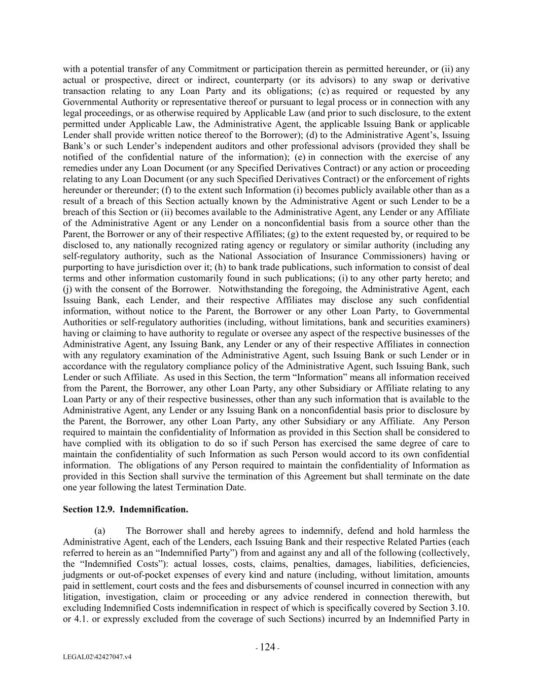 with a potential transfer of any Commitment or participation therein as permitted hereunder, or (ii) any actual or prospective, direct or indirect, counterparty (or its advisors) to any swap or derivative transaction relating to any Loan Party and its obligations; (c) as required or requested by any Governmental Authority or representative thereof or pursuant to legal process or in connection with any legal proceedings, or as otherwise required by Applicable Law (and prior to such disclosure, to the extent permitted under Applicable Law, the Administrative Agent, the applicable Issuing Bank or applicable Lender shall provide written notice thereof to the Borrower); (d) to the Administrative Agent’s, Issuing Bank’s or such Lender’s independent auditors and other professional advisors (provided they shall be notified of the confidential nature of the information); (e) in connection with the exercise of any remedies under any Loan Document (or any Specified Derivatives Contract) or any action or proceeding relating to any Loan Document (or any such Specified Derivatives Contract) or the enforcement of rights hereunder or thereunder; (f) to the extent such Information (i) becomes publicly available other than as a result of a breach of this Section actually known by the Administrative Agent or such Lender to be a breach of this Section or (ii) becomes available to the Administrative Agent, any Lender or any Affiliate of the Administrative Agent or any Lender on a nonconfidential basis from a source other than the Parent, the Borrower or any of their respective Affiliates; (g) to the extent requested by, or required to be disclosed to, any nationally recognized rating agency or regulatory or similar authority (including any self-regulatory authority, such as the National Association of Insurance Commissioners) having or purporting to have jurisdiction over it; (h) to bank trade publications, such information to consist of deal terms and other information customarily found in such publications; (i) to any other party hereto; and (j) with the consent of the Borrower. Notwithstanding the foregoing, the Administrative Agent, each Issuing Bank, each Lender, and their respective Affiliates may disclose any such confidential information, without notice to the Parent, the Borrower or any other Loan Party, to Governmental Authorities or self-regulatory authorities (including, without limitations, bank and securities examiners) having or claiming to have authority to regulate or oversee any aspect of the respective businesses of the Administrative Agent, any Issuing Bank, any Lender or any of their respective Affiliates in connection with any regulatory examination of the Administrative Agent, such Issuing Bank or such Lender or in accordance with the regulatory compliance policy of the Administrative Agent, such Issuing Bank, such Lender or such Affiliate. As used in this Section, the term “Information” means all information received from the Parent, the Borrower, any other Loan Party, any other Subsidiary or Affiliate relating to any Loan Party or any of their respective businesses, other than any such information that is available to the Administrative Agent, any Lender or any Issuing Bank on a nonconfidential basis prior to disclosure by the Parent, the Borrower, any other Loan Party, any other Subsidiary or any Affiliate. Any Person required to maintain the confidentiality of Information as provided in this Section shall be considered to have complied with its obligation to do so if such Person has exercised the same degree of care to maintain the confidentiality of such Information as such Person would accord to its own confidential information. The obligations of any Person required to maintain the confidentiality of Information as provided in this Section shall survive the termination of this Agreement but shall terminate on the date one year following the latest Termination Date. Section 12.9. Indemnification. (a) The Borrower shall and hereby agrees to indemnify, defend and hold harmless the Administrative Agent, each of the Lenders, each Issuing Bank and their respective Related Parties (each referred to herein as an “Indemnified Party”) from and against any and all of the following (collectively, the “Indemnified Costs”): actual losses, costs, claims, penalties, damages, liabilities, deficiencies, judgments or out-of-pocket expenses of every kind and nature (including, without limitation, amounts paid in settlement, court costs and the fees and disbursements of counsel incurred in connection with any litigation, investigation, claim or proceeding or any advice rendered in connection therewith, but excluding Indemnified Costs indemnification in respect of which is specifically covered by Section 3.10. or 4.1. or expressly excluded from the coverage of such Sections) incurred by an Indemnified Party in - 124 - LEGAL02\42427047.v4