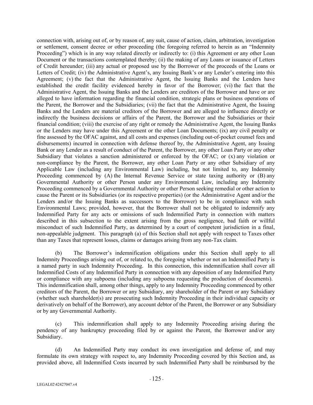 connection with, arising out of, or by reason of, any suit, cause of action, claim, arbitration, investigation or settlement, consent decree or other proceeding (the foregoing referred to herein as an “Indemnity Proceeding”) which is in any way related directly or indirectly to: (i) this Agreement or any other Loan Document or the transactions contemplated thereby; (ii) the making of any Loans or issuance of Letters of Credit hereunder; (iii) any actual or proposed use by the Borrower of the proceeds of the Loans or Letters of Credit; (iv) the Administrative Agent’s, any Issuing Bank’s or any Lender’s entering into this Agreement; (v) the fact that the Administrative Agent, the Issuing Banks and the Lenders have established the credit facility evidenced hereby in favor of the Borrower; (vi) the fact that the Administrative Agent, the Issuing Banks and the Lenders are creditors of the Borrower and have or are alleged to have information regarding the financial condition, strategic plans or business operations of the Parent, the Borrower and the Subsidiaries; (vii) the fact that the Administrative Agent, the Issuing Banks and the Lenders are material creditors of the Borrower and are alleged to influence directly or indirectly the business decisions or affairs of the Parent, the Borrower and the Subsidiaries or their financial condition; (viii) the exercise of any right or remedy the Administrative Agent, the Issuing Banks or the Lenders may have under this Agreement or the other Loan Documents; (ix) any civil penalty or fine assessed by the OFAC against, and all costs and expenses (including out-of-pocket counsel fees and disbursements) incurred in connection with defense thereof by, the Administrative Agent, any Issuing Bank or any Lender as a result of conduct of the Parent, the Borrower, any other Loan Party or any other Subsidiary that violates a sanction administered or enforced by the OFAC; or (x) any violation or non-compliance by the Parent, the Borrower, any other Loan Party or any other Subsidiary of any Applicable Law (including any Environmental Law) including, but not limited to, any Indemnity Proceeding commenced by (A) the Internal Revenue Service or state taxing authority or (B) any Governmental Authority or other Person under any Environmental Law, including any Indemnity Proceeding commenced by a Governmental Authority or other Person seeking remedial or other action to cause the Parent or its Subsidiaries (or its respective properties) (or the Administrative Agent and/or the Lenders and/or the Issuing Banks as successors to the Borrower) to be in compliance with such Environmental Laws; provided, however, that the Borrower shall not be obligated to indemnify any Indemnified Party for any acts or omissions of such Indemnified Party in connection with matters described in this subsection to the extent arising from the gross negligence, bad faith or willful misconduct of such Indemnified Party, as determined by a court of competent jurisdiction in a final, non-appealable judgment. This paragraph (a) of this Section shall not apply with respect to Taxes other than any Taxes that represent losses, claims or damages arising from any non-Tax claim. (b) The Borrower’s indemnification obligations under this Section shall apply to all Indemnity Proceedings arising out of, or related to, the foregoing whether or not an Indemnified Party is a named party in such Indemnity Proceeding. In this connection, this indemnification shall cover all Indemnified Costs of any Indemnified Party in connection with any deposition of any Indemnified Party or compliance with any subpoena (including any subpoena requesting the production of documents). This indemnification shall, among other things, apply to any Indemnity Proceeding commenced by other creditors of the Parent, the Borrower or any Subsidiary, any shareholder of the Parent or any Subsidiary (whether such shareholder(s) are prosecuting such Indemnity Proceeding in their individual capacity or derivatively on behalf of the Borrower), any account debtor of the Parent, the Borrower or any Subsidiary or by any Governmental Authority. (c) This indemnification shall apply to any Indemnity Proceeding arising during the pendency of any bankruptcy proceeding filed by or against the Parent, the Borrower and/or any Subsidiary. (d) An Indemnified Party may conduct its own investigation and defense of, and may formulate its own strategy with respect to, any Indemnity Proceeding covered by this Section and, as provided above, all Indemnified Costs incurred by such Indemnified Party shall be reimbursed by the - 125 - LEGAL02\42427047.v4