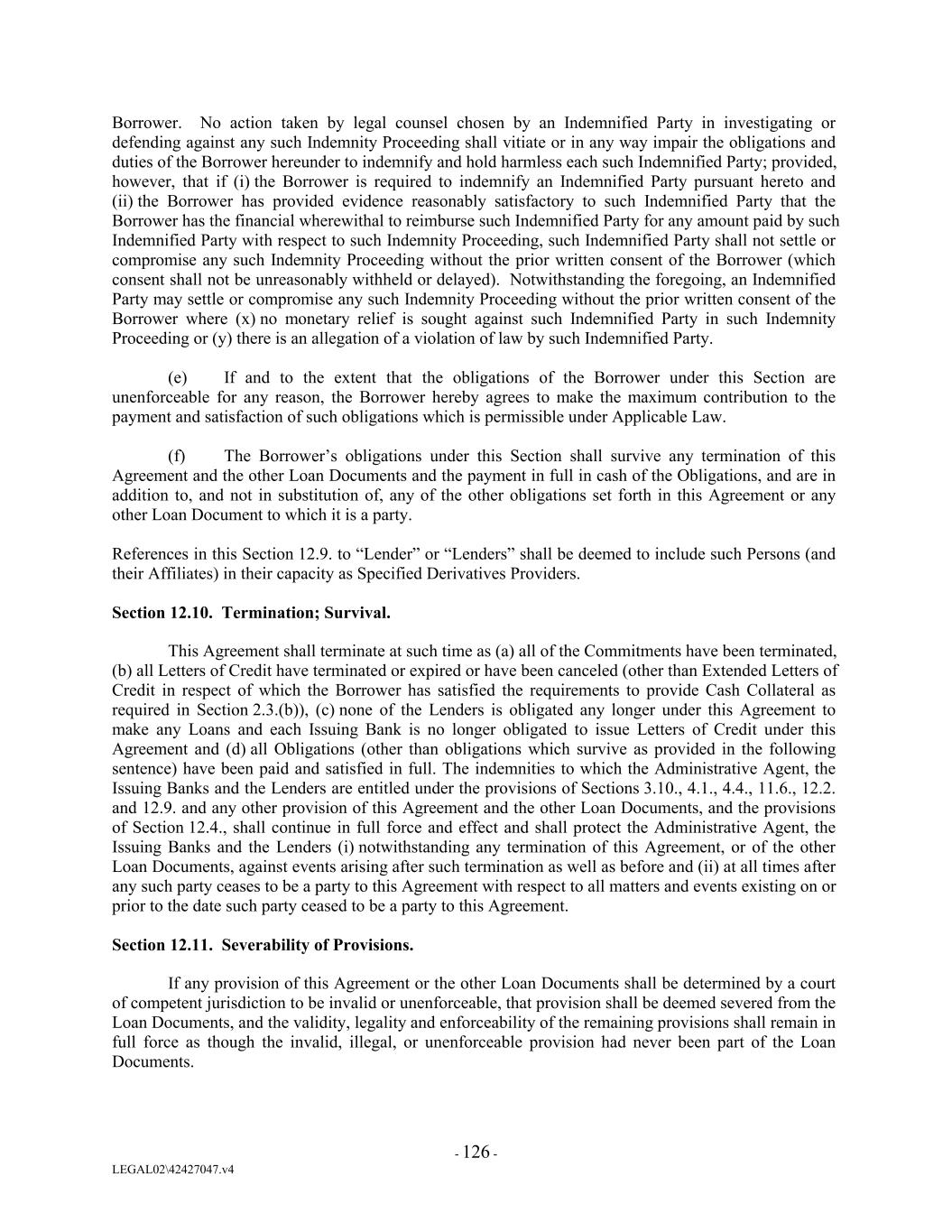 Borrower. No action taken by legal counsel chosen by an Indemnified Party in investigating or defending against any such Indemnity Proceeding shall vitiate or in any way impair the obligations and duties of the Borrower hereunder to indemnify and hold harmless each such Indemnified Party; provided, however, that if (i) the Borrower is required to indemnify an Indemnified Party pursuant hereto and (ii) the Borrower has provided evidence reasonably satisfactory to such Indemnified Party that the Borrower has the financial wherewithal to reimburse such Indemnified Party for any amount paid by such Indemnified Party with respect to such Indemnity Proceeding, such Indemnified Party shall not settle or compromise any such Indemnity Proceeding without the prior written consent of the Borrower (which consent shall not be unreasonably withheld or delayed). Notwithstanding the foregoing, an Indemnified Party may settle or compromise any such Indemnity Proceeding without the prior written consent of the Borrower where (x) no monetary relief is sought against such Indemnified Party in such Indemnity Proceeding or (y) there is an allegation of a violation of law by such Indemnified Party. (e) If and to the extent that the obligations of the Borrower under this Section are unenforceable for any reason, the Borrower hereby agrees to make the maximum contribution to the payment and satisfaction of such obligations which is permissible under Applicable Law. (f) The Borrower’s obligations under this Section shall survive any termination of this Agreement and the other Loan Documents and the payment in full in cash of the Obligations, and are in addition to, and not in substitution of, any of the other obligations set forth in this Agreement or any other Loan Document to which it is a party. References in this Section 12.9. to “Lender” or “Lenders” shall be deemed to include such Persons (and their Affiliates) in their capacity as Specified Derivatives Providers. Section 12.10. Termination; Survival. This Agreement shall terminate at such time as (a) all of the Commitments have been terminated, (b) all Letters of Credit have terminated or expired or have been canceled (other than Extended Letters of Credit in respect of which the Borrower has satisfied the requirements to provide Cash Collateral as required in Section 2.3.(b)), (c) none of the Lenders is obligated any longer under this Agreement to make any Loans and each Issuing Bank is no longer obligated to issue Letters of Credit under this Agreement and (d) all Obligations (other than obligations which survive as provided in the following sentence) have been paid and satisfied in full. The indemnities to which the Administrative Agent, the Issuing Banks and the Lenders are entitled under the provisions of Sections 3.10., 4.1., 4.4., 11.6., 12.2. and 12.9. and any other provision of this Agreement and the other Loan Documents, and the provisions of Section 12.4., shall continue in full force and effect and shall protect the Administrative Agent, the Issuing Banks and the Lenders (i) notwithstanding any termination of this Agreement, or of the other Loan Documents, against events arising after such termination as well as before and (ii) at all times after any such party ceases to be a party to this Agreement with respect to all matters and events existing on or prior to the date such party ceased to be a party to this Agreement. Section 12.11. Severability of Provisions. If any provision of this Agreement or the other Loan Documents shall be determined by a court of competent jurisdiction to be invalid or unenforceable, that provision shall be deemed severed from the Loan Documents, and the validity, legality and enforceability of the remaining provisions shall remain in full force as though the invalid, illegal, or unenforceable provision had never been part of the Loan Documents. - 126 - LEGAL02\42427047.v4