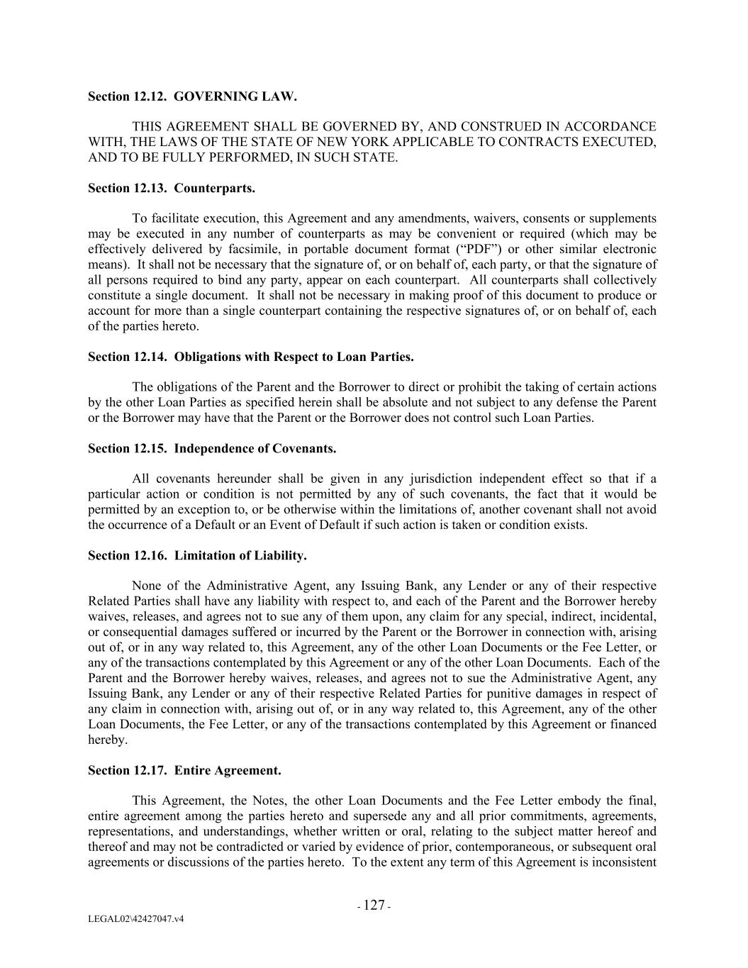 Section 12.12. GOVERNING LAW. THIS AGREEMENT SHALL BE GOVERNED BY, AND CONSTRUED IN ACCORDANCE WITH, THE LAWS OF THE STATE OF NEW YORK APPLICABLE TO CONTRACTS EXECUTED, AND TO BE FULLY PERFORMED, IN SUCH STATE. Section 12.13. Counterparts. To facilitate execution, this Agreement and any amendments, waivers, consents or supplements may be executed in any number of counterparts as may be convenient or required (which may be effectively delivered by facsimile, in portable document format (“PDF”) or other similar electronic means). It shall not be necessary that the signature of, or on behalf of, each party, or that the signature of all persons required to bind any party, appear on each counterpart. All counterparts shall collectively constitute a single document. It shall not be necessary in making proof of this document to produce or account for more than a single counterpart containing the respective signatures of, or on behalf of, each of the parties hereto. Section 12.14. Obligations with Respect to Loan Parties. The obligations of the Parent and the Borrower to direct or prohibit the taking of certain actions by the other Loan Parties as specified herein shall be absolute and not subject to any defense the Parent or the Borrower may have that the Parent or the Borrower does not control such Loan Parties. Section 12.15. Independence of Covenants. All covenants hereunder shall be given in any jurisdiction independent effect so that if a particular action or condition is not permitted by any of such covenants, the fact that it would be permitted by an exception to, or be otherwise within the limitations of, another covenant shall not avoid the occurrence of a Default or an Event of Default if such action is taken or condition exists. Section 12.16. Limitation of Liability. None of the Administrative Agent, any Issuing Bank, any Lender or any of their respective Related Parties shall have any liability with respect to, and each of the Parent and the Borrower hereby waives, releases, and agrees not to sue any of them upon, any claim for any special, indirect, incidental, or consequential damages suffered or incurred by the Parent or the Borrower in connection with, arising out of, or in any way related to, this Agreement, any of the other Loan Documents or the Fee Letter, or any of the transactions contemplated by this Agreement or any of the other Loan Documents. Each of the Parent and the Borrower hereby waives, releases, and agrees not to sue the Administrative Agent, any Issuing Bank, any Lender or any of their respective Related Parties for punitive damages in respect of any claim in connection with, arising out of, or in any way related to, this Agreement, any of the other Loan Documents, the Fee Letter, or any of the transactions contemplated by this Agreement or financed hereby. Section 12.17. Entire Agreement. This Agreement, the Notes, the other Loan Documents and the Fee Letter embody the final, entire agreement among the parties hereto and supersede any and all prior commitments, agreements, representations, and understandings, whether written or oral, relating to the subject matter hereof and thereof and may not be contradicted or varied by evidence of prior, contemporaneous, or subsequent oral agreements or discussions of the parties hereto. To the extent any term of this Agreement is inconsistent - 127 - LEGAL02\42427047.v4