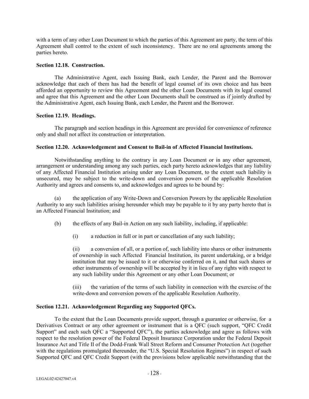with a term of any other Loan Document to which the parties of this Agreement are party, the term of this Agreement shall control to the extent of such inconsistency. There are no oral agreements among the parties hereto. Section 12.18. Construction. The Administrative Agent, each Issuing Bank, each Lender, the Parent and the Borrower acknowledge that each of them has had the benefit of legal counsel of its own choice and has been afforded an opportunity to review this Agreement and the other Loan Documents with its legal counsel and agree that this Agreement and the other Loan Documents shall be construed as if jointly drafted by the Administrative Agent, each Issuing Bank, each Lender, the Parent and the Borrower. Section 12.19. Headings. The paragraph and section headings in this Agreement are provided for convenience of reference only and shall not affect its construction or interpretation. Section 12.20. Acknowledgement and Consent to Bail-in of Affected Financial Institutions. Notwithstanding anything to the contrary in any Loan Document or in any other agreement, arrangement or understanding among any such parties, each party hereto acknowledges that any liability of any Affected Financial Institution arising under any Loan Document, to the extent such liability is unsecured, may be subject to the write-down and conversion powers of the applicable Resolution Authority and agrees and consents to, and acknowledges and agrees to be bound by: (a) the application of any Write-Down and Conversion Powers by the applicable Resolution Authority to any such liabilities arising hereunder which may be payable to it by any party hereto that is an Affected Financial Institution; and (b) the effects of any Bail-in Action on any such liability, including, if applicable: (i) a reduction in full or in part or cancellation of any such liability; (ii) a conversion of all, or a portion of, such liability into shares or other instruments of ownership in such Affected Financial Institution, its parent undertaking, or a bridge institution that may be issued to it or otherwise conferred on it, and that such shares or other instruments of ownership will be accepted by it in lieu of any rights with respect to any such liability under this Agreement or any other Loan Document; or (iii) the variation of the terms of such liability in connection with the exercise of the write-down and conversion powers of the applicable Resolution Authority. Section 12.21. Acknowledgement Regarding any Supported QFCs. To the extent that the Loan Documents provide support, through a guarantee or otherwise, for a Derivatives Contract or any other agreement or instrument that is a QFC (such support, “QFC Credit Support” and each such QFC a “Supported QFC”), the parties acknowledge and agree as follows with respect to the resolution power of the Federal Deposit Insurance Corporation under the Federal Deposit Insurance Act and Title II of the Dodd-Frank Wall Street Reform and Consumer Protection Act (together with the regulations promulgated thereunder, the “U.S. Special Resolution Regimes”) in respect of such Supported QFC and QFC Credit Support (with the provisions below applicable notwithstanding that the - 128 - LEGAL02\42427047.v4