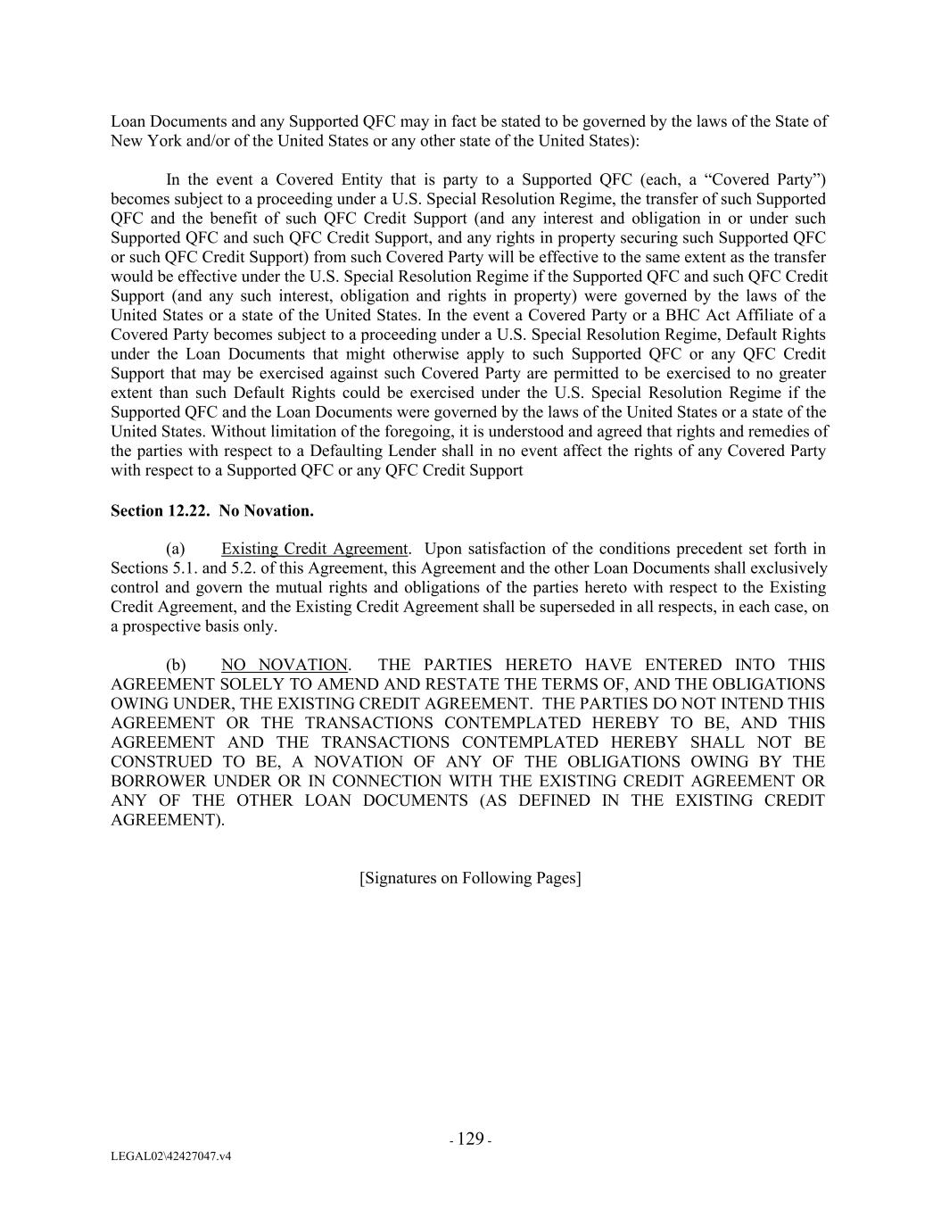 Loan Documents and any Supported QFC may in fact be stated to be governed by the laws of the State of New York and/or of the United States or any other state of the United States): In the event a Covered Entity that is party to a Supported QFC (each, a “Covered Party”) becomes subject to a proceeding under a U.S. Special Resolution Regime, the transfer of such Supported QFC and the benefit of such QFC Credit Support (and any interest and obligation in or under such Supported QFC and such QFC Credit Support, and any rights in property securing such Supported QFC or such QFC Credit Support) from such Covered Party will be effective to the same extent as the transfer would be effective under the U.S. Special Resolution Regime if the Supported QFC and such QFC Credit Support (and any such interest, obligation and rights in property) were governed by the laws of the United States or a state of the United States. In the event a Covered Party or a BHC Act Affiliate of a Covered Party becomes subject to a proceeding under a U.S. Special Resolution Regime, Default Rights under the Loan Documents that might otherwise apply to such Supported QFC or any QFC Credit Support that may be exercised against such Covered Party are permitted to be exercised to no greater extent than such Default Rights could be exercised under the U.S. Special Resolution Regime if the Supported QFC and the Loan Documents were governed by the laws of the United States or a state of the United States. Without limitation of the foregoing, it is understood and agreed that rights and remedies of the parties with respect to a Defaulting Lender shall in no event affect the rights of any Covered Party with respect to a Supported QFC or any QFC Credit Support Section 12.22. No Novation. (a) Existing Credit Agreement. Upon satisfaction of the conditions precedent set forth in Sections 5.1. and 5.2. of this Agreement, this Agreement and the other Loan Documents shall exclusively control and govern the mutual rights and obligations of the parties hereto with respect to the Existing Credit Agreement, and the Existing Credit Agreement shall be superseded in all respects, in each case, on a prospective basis only. (b) NO NOVATION. THE PARTIES HERETO HAVE ENTERED INTO THIS AGREEMENT SOLELY TO AMEND AND RESTATE THE TERMS OF, AND THE OBLIGATIONS OWING UNDER, THE EXISTING CREDIT AGREEMENT. THE PARTIES DO NOT INTEND THIS AGREEMENT OR THE TRANSACTIONS CONTEMPLATED HEREBY TO BE, AND THIS AGREEMENT AND THE TRANSACTIONS CONTEMPLATED HEREBY SHALL NOT BE CONSTRUED TO BE, A NOVATION OF ANY OF THE OBLIGATIONS OWING BY THE BORROWER UNDER OR IN CONNECTION WITH THE EXISTING CREDIT AGREEMENT OR ANY OF THE OTHER LOAN DOCUMENTS (AS DEFINED IN THE EXISTING CREDIT AGREEMENT). [Signatures on Following Pages] - 129 - LEGAL02\42427047.v4