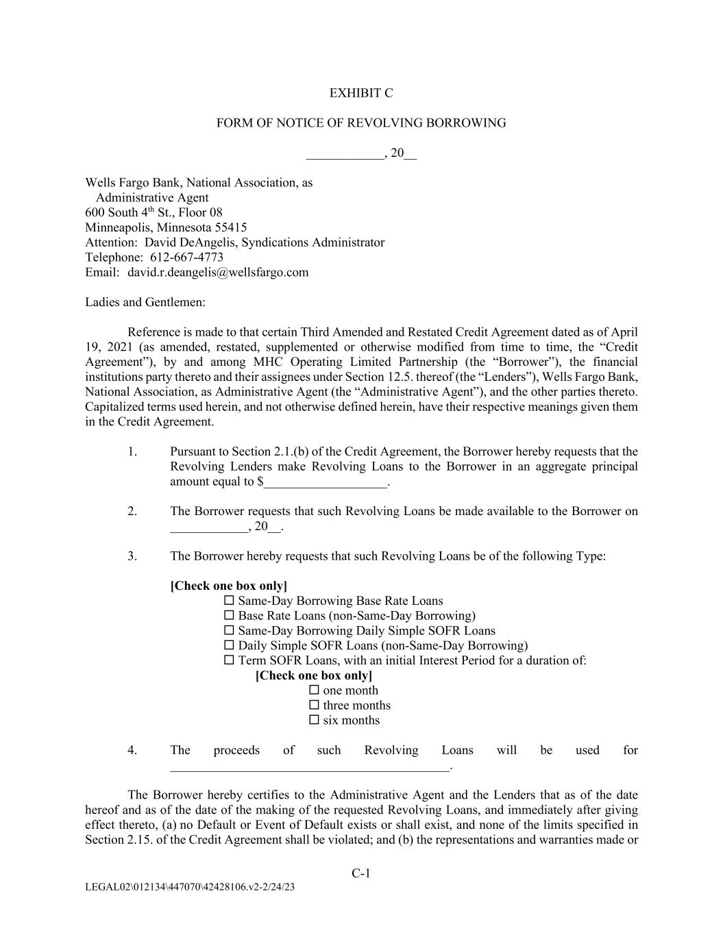 C-1 LEGAL02\012134\447070\42428106.v2-2/24/23 EXHIBIT C FORM OF NOTICE OF REVOLVING BORROWING ____________, 20__ Wells Fargo Bank, National Association, as Administrative Agent 600 South 4th St., Floor 08 Minneapolis, Minnesota 55415 Attention: David DeAngelis, Syndications Administrator Telephone: 612-667-4773 Email: david.r.deangelis@wellsfargo.com Ladies and Gentlemen: Reference is made to that certain Third Amended and Restated Credit Agreement dated as of April 19, 2021 (as amended, restated, supplemented or otherwise modified from time to time, the “Credit Agreement”), by and among MHC Operating Limited Partnership (the “Borrower”), the financial institutions party thereto and their assignees under Section 12.5. thereof (the “Lenders”), Wells Fargo Bank, National Association, as Administrative Agent (the “Administrative Agent”), and the other parties thereto. Capitalized terms used herein, and not otherwise defined herein, have their respective meanings given them in the Credit Agreement. 1. Pursuant to Section 2.1.(b) of the Credit Agreement, the Borrower hereby requests that the Revolving Lenders make Revolving Loans to the Borrower in an aggregate principal amount equal to $___________________. 2. The Borrower requests that such Revolving Loans be made available to the Borrower on ____________, 20__. 3. The Borrower hereby requests that such Revolving Loans be of the following Type: [Check one box only]  Same-Day Borrowing Base Rate Loans  Base Rate Loans (non-Same-Day Borrowing)  Same-Day Borrowing Daily Simple SOFR Loans  Daily Simple SOFR Loans (non-Same-Day Borrowing)  Term SOFR Loans, with an initial Interest Period for a duration of: [Check one box only]  one month  three months  six months 4. The proceeds of such Revolving Loans will be used for ___________________________________________. The Borrower hereby certifies to the Administrative Agent and the Lenders that as of the date hereof and as of the date of the making of the requested Revolving Loans, and immediately after giving effect thereto, (a) no Default or Event of Default exists or shall exist, and none of the limits specified in Section 2.15. of the Credit Agreement shall be violated; and (b) the representations and warranties made or