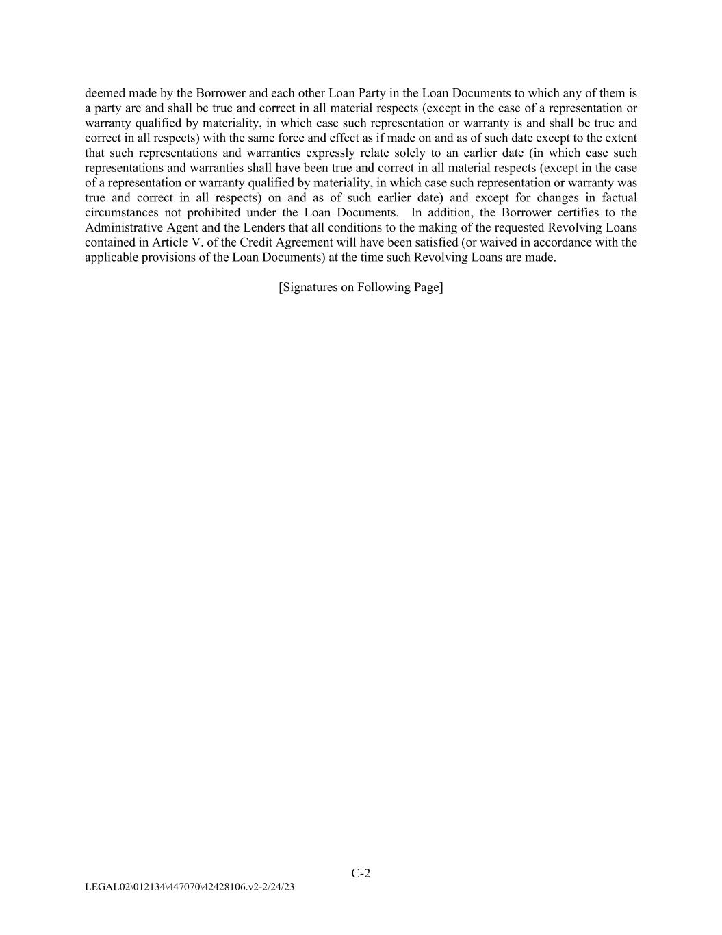 C-2 LEGAL02\012134\447070\42428106.v2-2/24/23 deemed made by the Borrower and each other Loan Party in the Loan Documents to which any of them is a party are and shall be true and correct in all material respects (except in the case of a representation or warranty qualified by materiality, in which case such representation or warranty is and shall be true and correct in all respects) with the same force and effect as if made on and as of such date except to the extent that such representations and warranties expressly relate solely to an earlier date (in which case such representations and warranties shall have been true and correct in all material respects (except in the case of a representation or warranty qualified by materiality, in which case such representation or warranty was true and correct in all respects) on and as of such earlier date) and except for changes in factual circumstances not prohibited under the Loan Documents. In addition, the Borrower certifies to the Administrative Agent and the Lenders that all conditions to the making of the requested Revolving Loans contained in Article V. of the Credit Agreement will have been satisfied (or waived in accordance with the applicable provisions of the Loan Documents) at the time such Revolving Loans are made. [Signatures on Following Page]