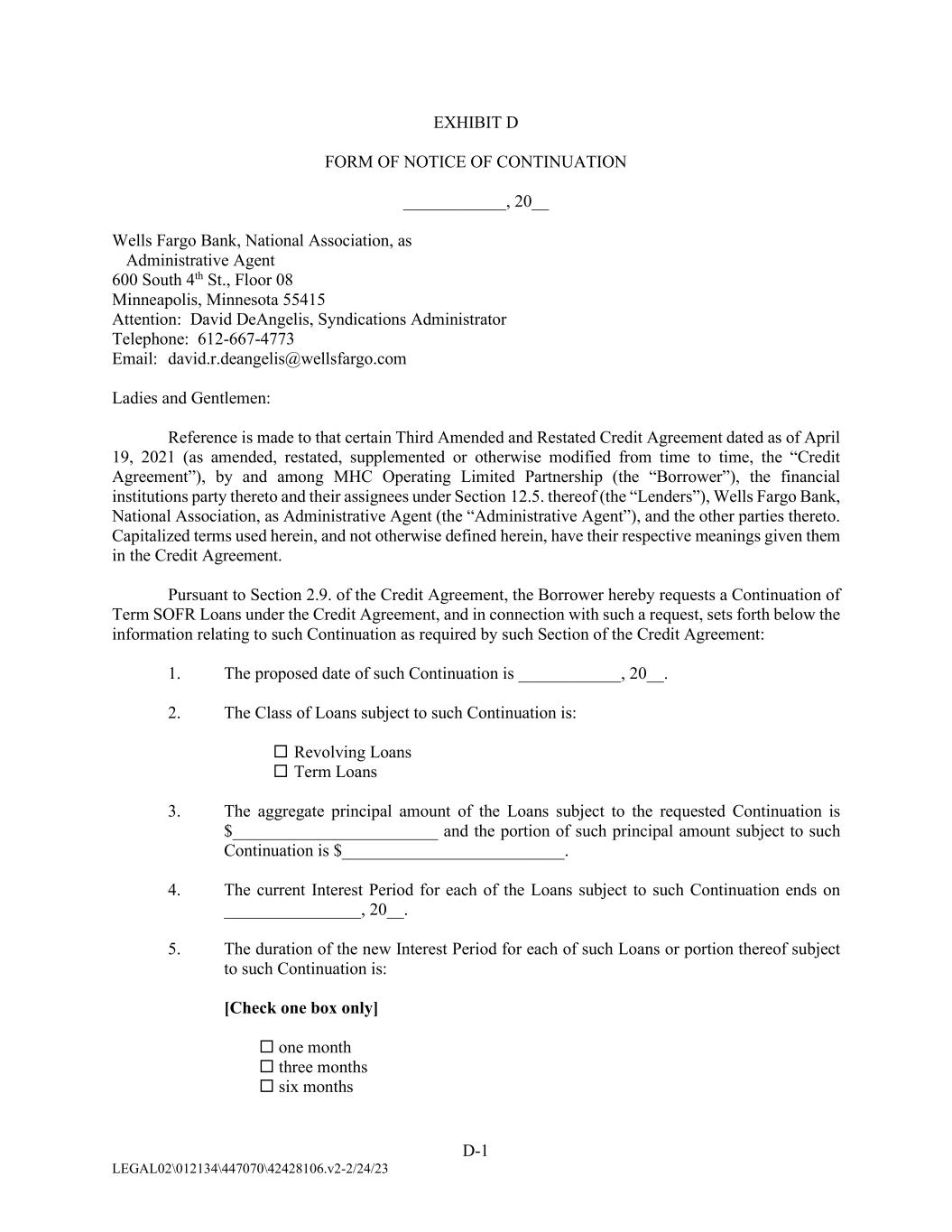 D-1 LEGAL02\012134\447070\42428106.v2-2/24/23 EXHIBIT D FORM OF NOTICE OF CONTINUATION ____________, 20__ Wells Fargo Bank, National Association, as Administrative Agent 600 South 4th St., Floor 08 Minneapolis, Minnesota 55415 Attention: David DeAngelis, Syndications Administrator Telephone: 612-667-4773 Email: david.r.deangelis@wellsfargo.com Ladies and Gentlemen: Reference is made to that certain Third Amended and Restated Credit Agreement dated as of April 19, 2021 (as amended, restated, supplemented or otherwise modified from time to time, the “Credit Agreement”), by and among MHC Operating Limited Partnership (the “Borrower”), the financial institutions party thereto and their assignees under Section 12.5. thereof (the “Lenders”), Wells Fargo Bank, National Association, as Administrative Agent (the “Administrative Agent”), and the other parties thereto. Capitalized terms used herein, and not otherwise defined herein, have their respective meanings given them in the Credit Agreement. Pursuant to Section 2.9. of the Credit Agreement, the Borrower hereby requests a Continuation of Term SOFR Loans under the Credit Agreement, and in connection with such a request, sets forth below the information relating to such Continuation as required by such Section of the Credit Agreement: 1. The proposed date of such Continuation is ____________, 20__. 2. The Class of Loans subject to such Continuation is:  Revolving Loans  Term Loans 3. The aggregate principal amount of the Loans subject to the requested Continuation is $________________________ and the portion of such principal amount subject to such Continuation is $__________________________. 4. The current Interest Period for each of the Loans subject to such Continuation ends on ________________, 20__. 5. The duration of the new Interest Period for each of such Loans or portion thereof subject to such Continuation is: [Check one box only]  one month  three months  six months