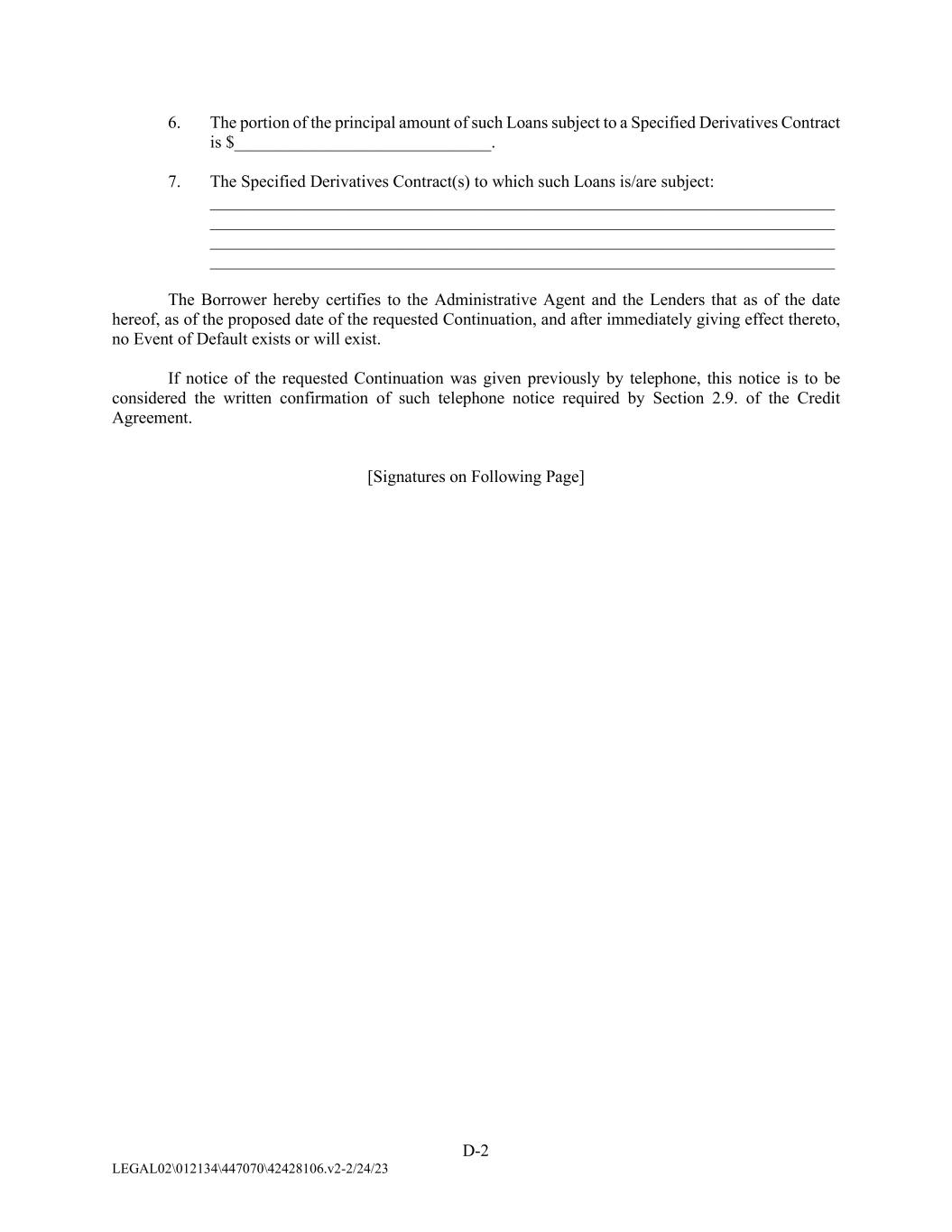 D-2 LEGAL02\012134\447070\42428106.v2-2/24/23 6. The portion of the principal amount of such Loans subject to a Specified Derivatives Contract is $______________________________. 7. The Specified Derivatives Contract(s) to which such Loans is/are subject: _________________________________________________________________________ _________________________________________________________________________ _________________________________________________________________________ _________________________________________________________________________ The Borrower hereby certifies to the Administrative Agent and the Lenders that as of the date hereof, as of the proposed date of the requested Continuation, and after immediately giving effect thereto, no Event of Default exists or will exist. If notice of the requested Continuation was given previously by telephone, this notice is to be considered the written confirmation of such telephone notice required by Section 2.9. of the Credit Agreement. [Signatures on Following Page]