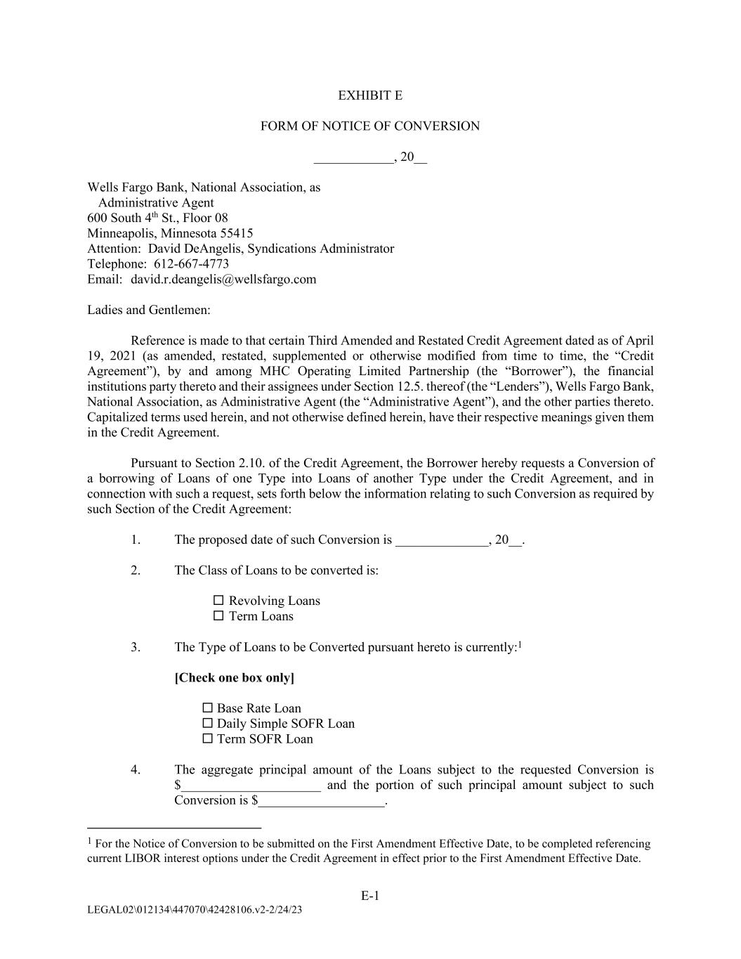 E-1 LEGAL02\012134\447070\42428106.v2-2/24/23 EXHIBIT E FORM OF NOTICE OF CONVERSION ____________, 20__ Wells Fargo Bank, National Association, as Administrative Agent 600 South 4th St., Floor 08 Minneapolis, Minnesota 55415 Attention: David DeAngelis, Syndications Administrator Telephone: 612-667-4773 Email: david.r.deangelis@wellsfargo.com Ladies and Gentlemen: Reference is made to that certain Third Amended and Restated Credit Agreement dated as of April 19, 2021 (as amended, restated, supplemented or otherwise modified from time to time, the “Credit Agreement”), by and among MHC Operating Limited Partnership (the “Borrower”), the financial institutions party thereto and their assignees under Section 12.5. thereof (the “Lenders”), Wells Fargo Bank, National Association, as Administrative Agent (the “Administrative Agent”), and the other parties thereto. Capitalized terms used herein, and not otherwise defined herein, have their respective meanings given them in the Credit Agreement. Pursuant to Section 2.10. of the Credit Agreement, the Borrower hereby requests a Conversion of a borrowing of Loans of one Type into Loans of another Type under the Credit Agreement, and in connection with such a request, sets forth below the information relating to such Conversion as required by such Section of the Credit Agreement: 1. The proposed date of such Conversion is ______________, 20__. 2. The Class of Loans to be converted is:  Revolving Loans  Term Loans 3. The Type of Loans to be Converted pursuant hereto is currently:1 [Check one box only]  Base Rate Loan  Daily Simple SOFR Loan  Term SOFR Loan 4. The aggregate principal amount of the Loans subject to the requested Conversion is $_____________________ and the portion of such principal amount subject to such Conversion is $___________________. 1 For the Notice of Conversion to be submitted on the First Amendment Effective Date, to be completed referencing current LIBOR interest options under the Credit Agreement in effect prior to the First Amendment Effective Date.