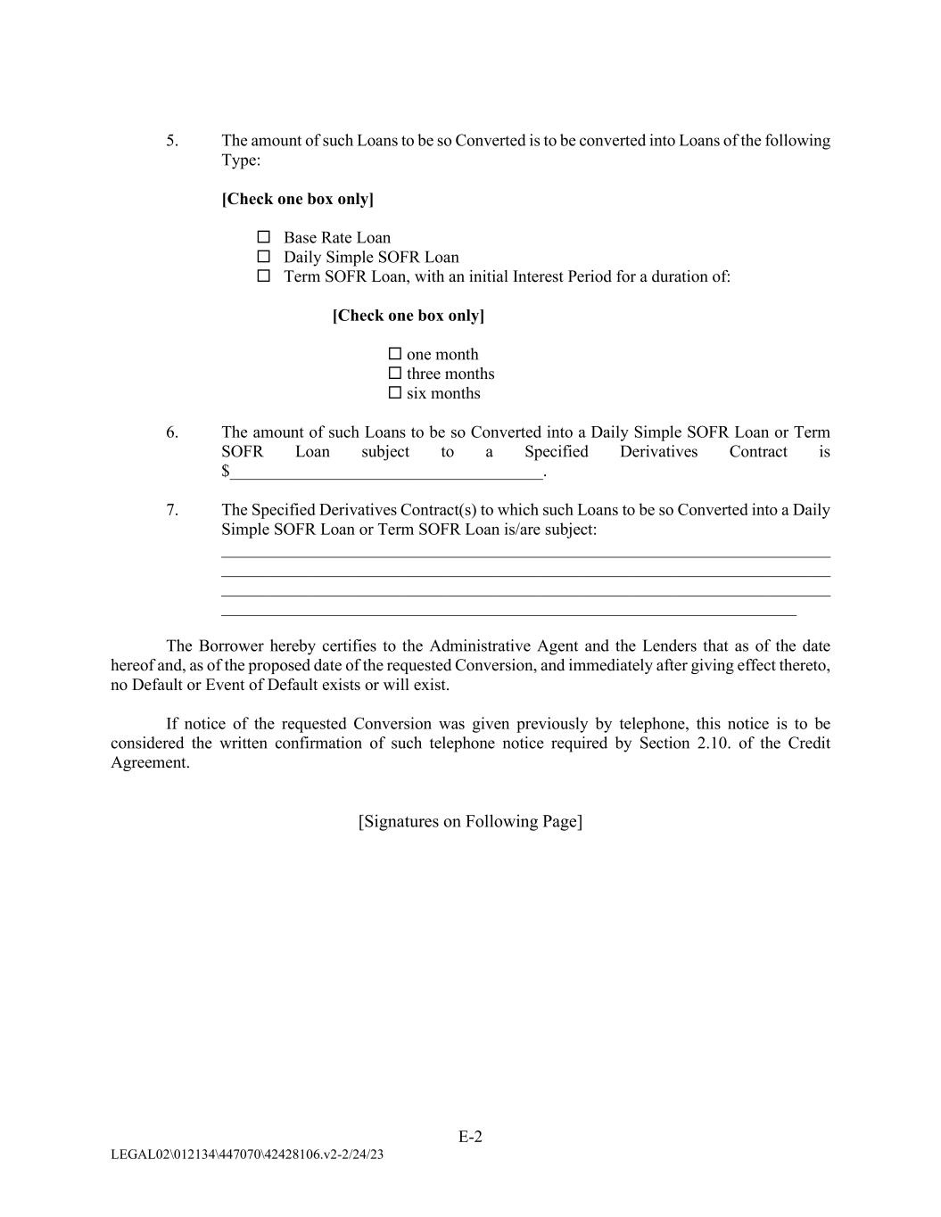 E-2 LEGAL02\012134\447070\42428106.v2-2/24/23 5. The amount of such Loans to be so Converted is to be converted into Loans of the following Type: [Check one box only]  Base Rate Loan  Daily Simple SOFR Loan  Term SOFR Loan, with an initial Interest Period for a duration of: [Check one box only]  one month  three months  six months 6. The amount of such Loans to be so Converted into a Daily Simple SOFR Loan or Term SOFR Loan subject to a Specified Derivatives Contract is $_____________________________________. 7. The Specified Derivatives Contract(s) to which such Loans to be so Converted into a Daily Simple SOFR Loan or Term SOFR Loan is/are subject: ________________________________________________________________________ ________________________________________________________________________ ________________________________________________________________________ ____________________________________________________________________ The Borrower hereby certifies to the Administrative Agent and the Lenders that as of the date hereof and, as of the proposed date of the requested Conversion, and immediately after giving effect thereto, no Default or Event of Default exists or will exist. If notice of the requested Conversion was given previously by telephone, this notice is to be considered the written confirmation of such telephone notice required by Section 2.10. of the Credit Agreement. [Signatures on Following Page]