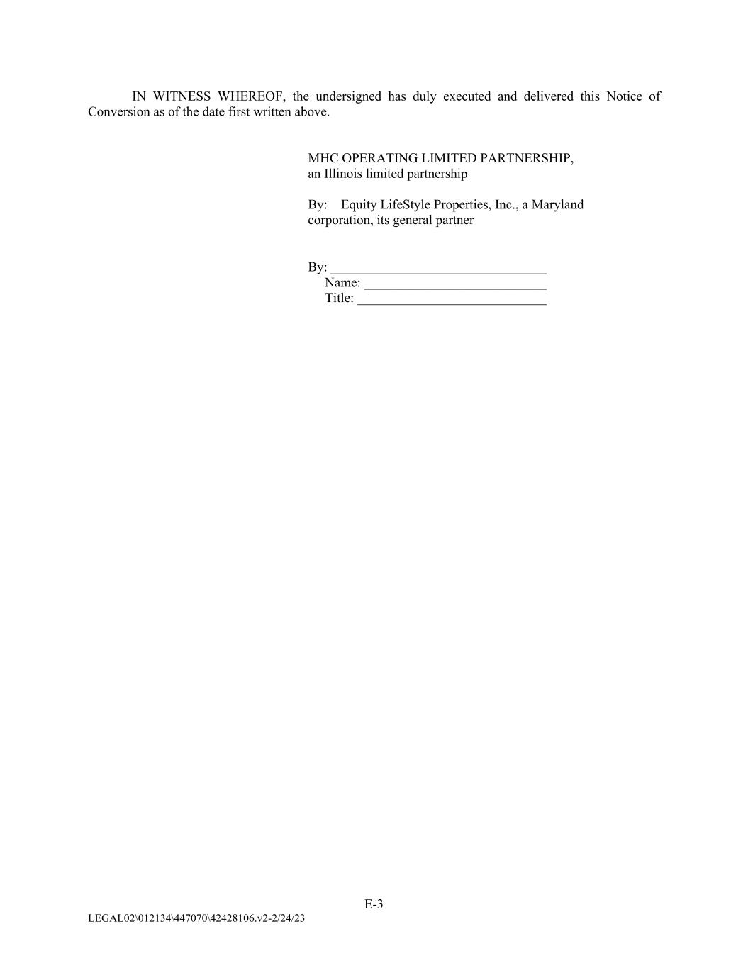 E-3 LEGAL02\012134\447070\42428106.v2-2/24/23 IN WITNESS WHEREOF, the undersigned has duly executed and delivered this Notice of Conversion as of the date first written above. MHC OPERATING LIMITED PARTNERSHIP, an Illinois limited partnership By: Equity LifeStyle Properties, Inc., a Maryland corporation, its general partner By: ________________________________ Name: ___________________________ Title: ____________________________