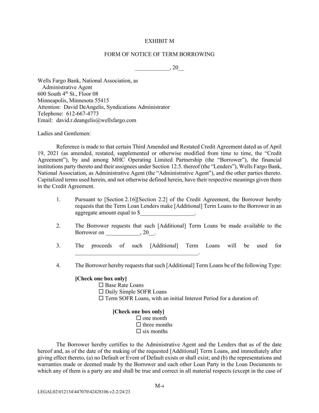 M-4 LEGAL02\012134\447070\42428106.v2-2/24/23 EXHIBIT M FORM OF NOTICE OF TERM BORROWING ____________, 20__ Wells Fargo Bank, National Association, as Administrative Agent 600 South 4th St., Floor 08 Minneapolis, Minnesota 55415 Attention: David DeAngelis, Syndications Administrator Telephone: 612-667-4773 Email: david.r.deangelis@wellsfargo.com Ladies and Gentlemen: Reference is made to that certain Third Amended and Restated Credit Agreement dated as of April 19, 2021 (as amended, restated, supplemented or otherwise modified from time to time, the “Credit Agreement”), by and among MHC Operating Limited Partnership (the “Borrower”), the financial institutions party thereto and their assignees under Section 12.5. thereof (the “Lenders”), Wells Fargo Bank, National Association, as Administrative Agent (the “Administrative Agent”), and the other parties thereto. Capitalized terms used herein, and not otherwise defined herein, have their respective meanings given them in the Credit Agreement. 1. Pursuant to [Section 2.16][Section 2.2] of the Credit Agreement, the Borrower hereby requests that the Term Loan Lenders make [Additional] Term Loans to the Borrower in an aggregate amount equal to $___________________. 2. The Borrower requests that such [Additional] Term Loans be made available to the Borrower on ____________, 20__. 3. The proceeds of such [Additional] Term Loans will be used for ___________________________________________. 4. The Borrower hereby requests that such [Additional] Term Loans be of the following Type: [Check one box only]  Base Rate Loans  Daily Simple SOFR Loans  Term SOFR Loans, with an initial Interest Period for a duration of: [Check one box only]  one month  three months  six months The Borrower hereby certifies to the Administrative Agent and the Lenders that as of the date hereof and, as of the date of the making of the requested [Additional] Term Loans, and immediately after giving effect thereto, (a) no Default or Event of Default exists or shall exist; and (b) the representations and warranties made or deemed made by the Borrower and each other Loan Party in the Loan Documents to which any of them is a party are and shall be true and correct in all material respects (except in the case of