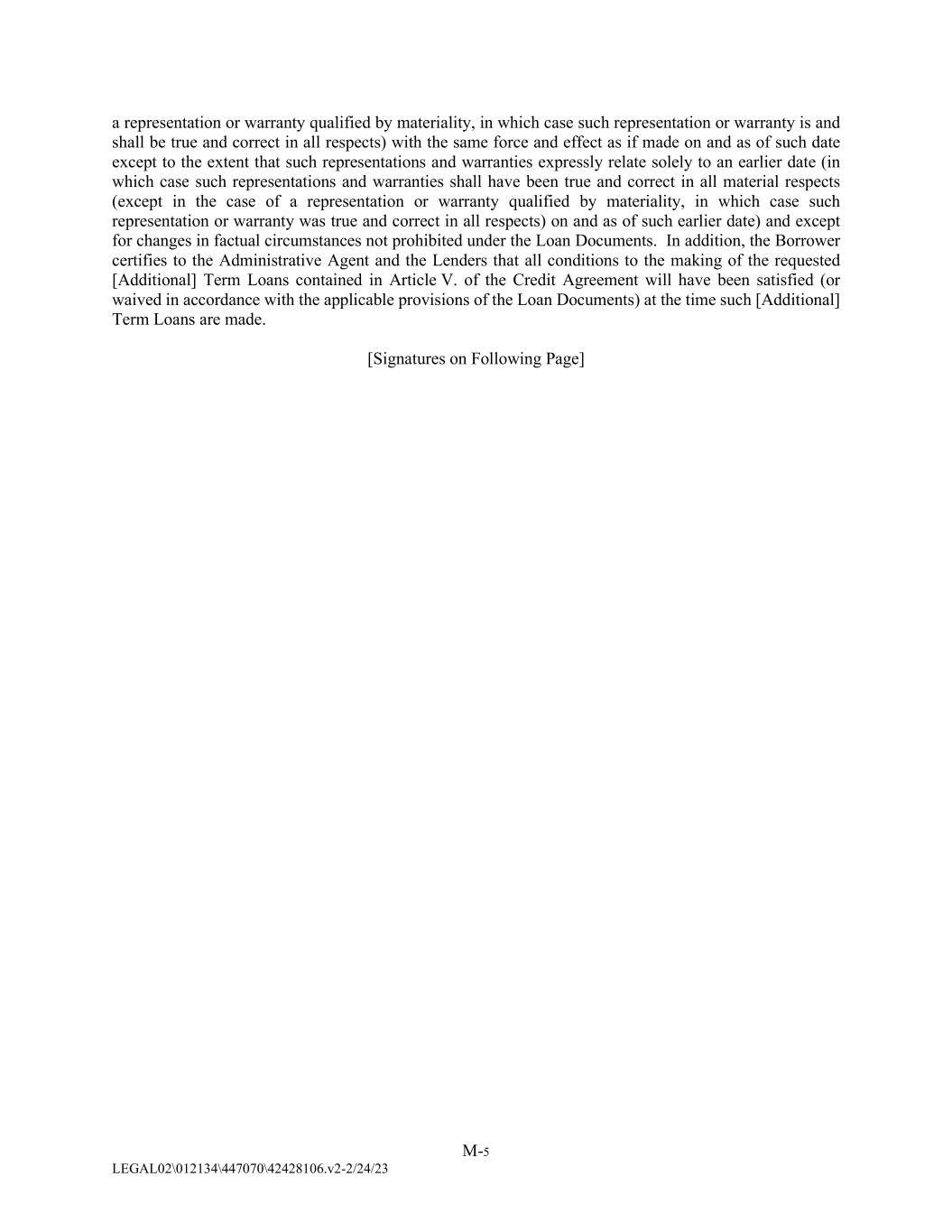 M-5 LEGAL02\012134\447070\42428106.v2-2/24/23 a representation or warranty qualified by materiality, in which case such representation or warranty is and shall be true and correct in all respects) with the same force and effect as if made on and as of such date except to the extent that such representations and warranties expressly relate solely to an earlier date (in which case such representations and warranties shall have been true and correct in all material respects (except in the case of a representation or warranty qualified by materiality, in which case such representation or warranty was true and correct in all respects) on and as of such earlier date) and except for changes in factual circumstances not prohibited under the Loan Documents. In addition, the Borrower certifies to the Administrative Agent and the Lenders that all conditions to the making of the requested [Additional] Term Loans contained in Article V. of the Credit Agreement will have been satisfied (or waived in accordance with the applicable provisions of the Loan Documents) at the time such [Additional] Term Loans are made. [Signatures on Following Page]