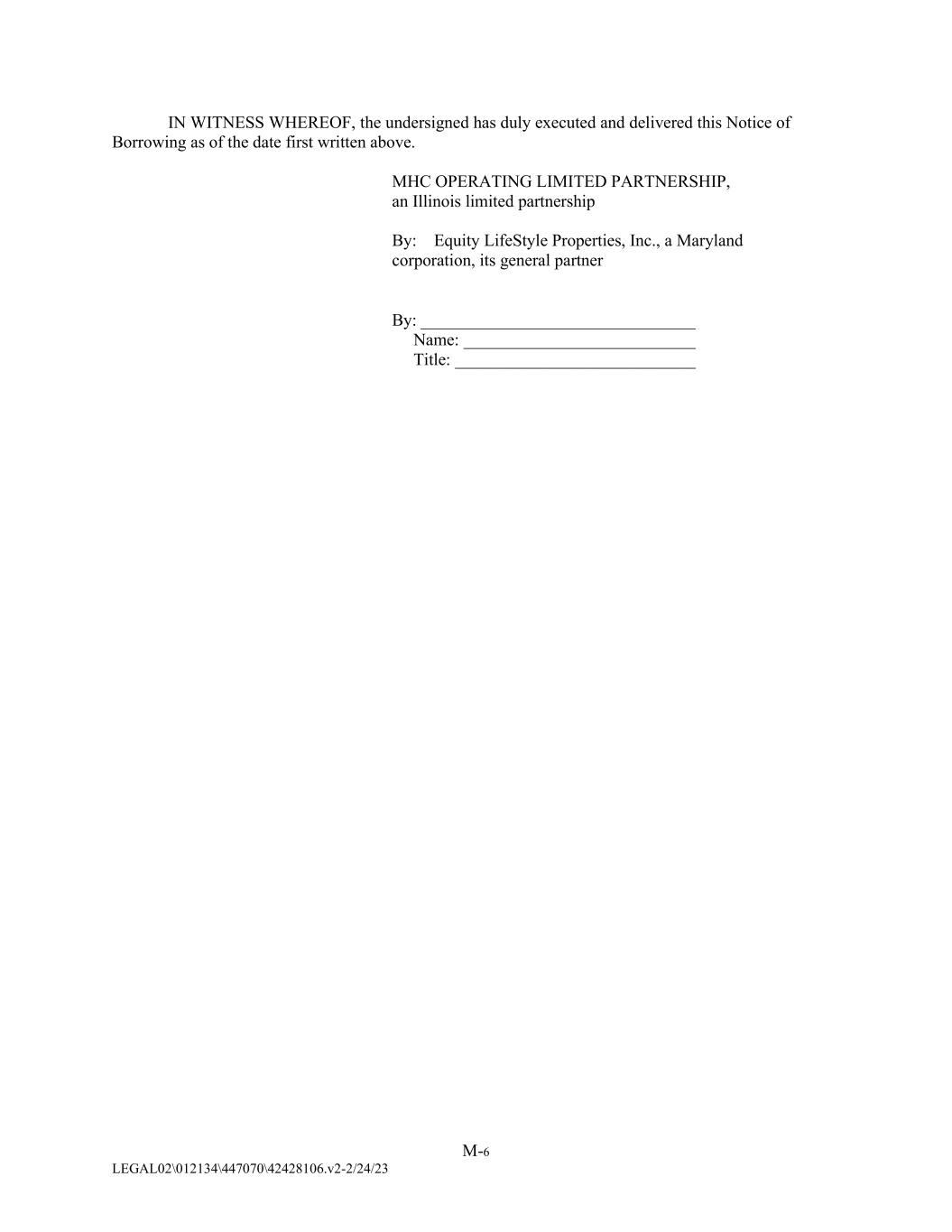 M-6 LEGAL02\012134\447070\42428106.v2-2/24/23 IN WITNESS WHEREOF, the undersigned has duly executed and delivered this Notice of Borrowing as of the date first written above. MHC OPERATING LIMITED PARTNERSHIP, an Illinois limited partnership By: Equity LifeStyle Properties, Inc., a Maryland corporation, its general partner By: ________________________________ Name: ___________________________ Title: ____________________________