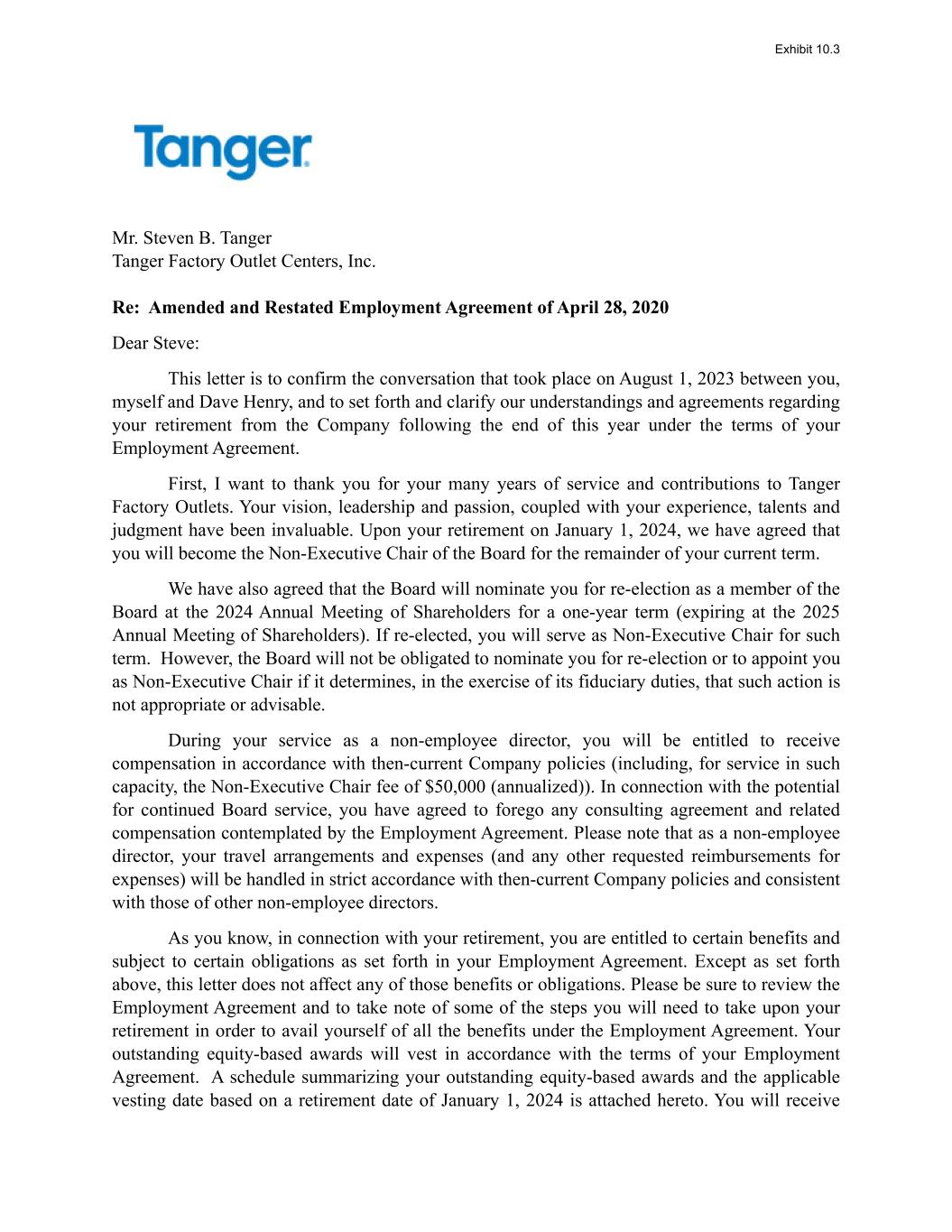 Mr. Steven B. Tanger Tanger Factory Outlet Centers, Inc. Re: Amended and Restated Employment Agreement of April 28, 2020 Dear Steve: This letter is to confirm the conversation that took place on August 1, 2023 between you, myself and Dave Henry, and to set forth and clarify our understandings and agreements regarding your retirement from the Company following the end of this year under the terms of your Employment Agreement. First, I want to thank you for your many years of service and contributions to Tanger Factory Outlets. Your vision, leadership and passion, coupled with your experience, talents and judgment have been invaluable. Upon your retirement on January 1, 2024, we have agreed that you will become the Non-Executive Chair of the Board for the remainder of your current term. We have also agreed that the Board will nominate you for re-election as a member of the Board at the 2024 Annual Meeting of Shareholders for a one-year term (expiring at the 2025 Annual Meeting of Shareholders). If re-elected, you will serve as Non-Executive Chair for such term. However, the Board will not be obligated to nominate you for re-election or to appoint you as Non-Executive Chair if it determines, in the exercise of its fiduciary duties, that such action is not appropriate or advisable. During your service as a non-employee director, you will be entitled to receive compensation in accordance with then-current Company policies (including, for service in such capacity, the Non-Executive Chair fee of $50,000 (annualized)). In connection with the potential for continued Board service, you have agreed to forego any consulting agreement and related compensation contemplated by the Employment Agreement. Please note that as a non-employee director, your travel arrangements and expenses (and any other requested reimbursements for expenses) will be handled in strict accordance with then-current Company policies and consistent with those of other non-employee directors. As you know, in connection with your retirement, you are entitled to certain benefits and subject to certain obligations as set forth in your Employment Agreement. Except as set forth above, this letter does not affect any of those benefits or obligations. Please be sure to review the Employment Agreement and to take note of some of the steps you will need to take upon your retirement in order to avail yourself of all the benefits under the Employment Agreement. Your outstanding equity-based awards will vest in accordance with the terms of your Employment Agreement. A schedule summarizing your outstanding equity-based awards and the applicable vesting date based on a retirement date of January 1, 2024 is attached hereto. You will receive Exhibit 10.3
