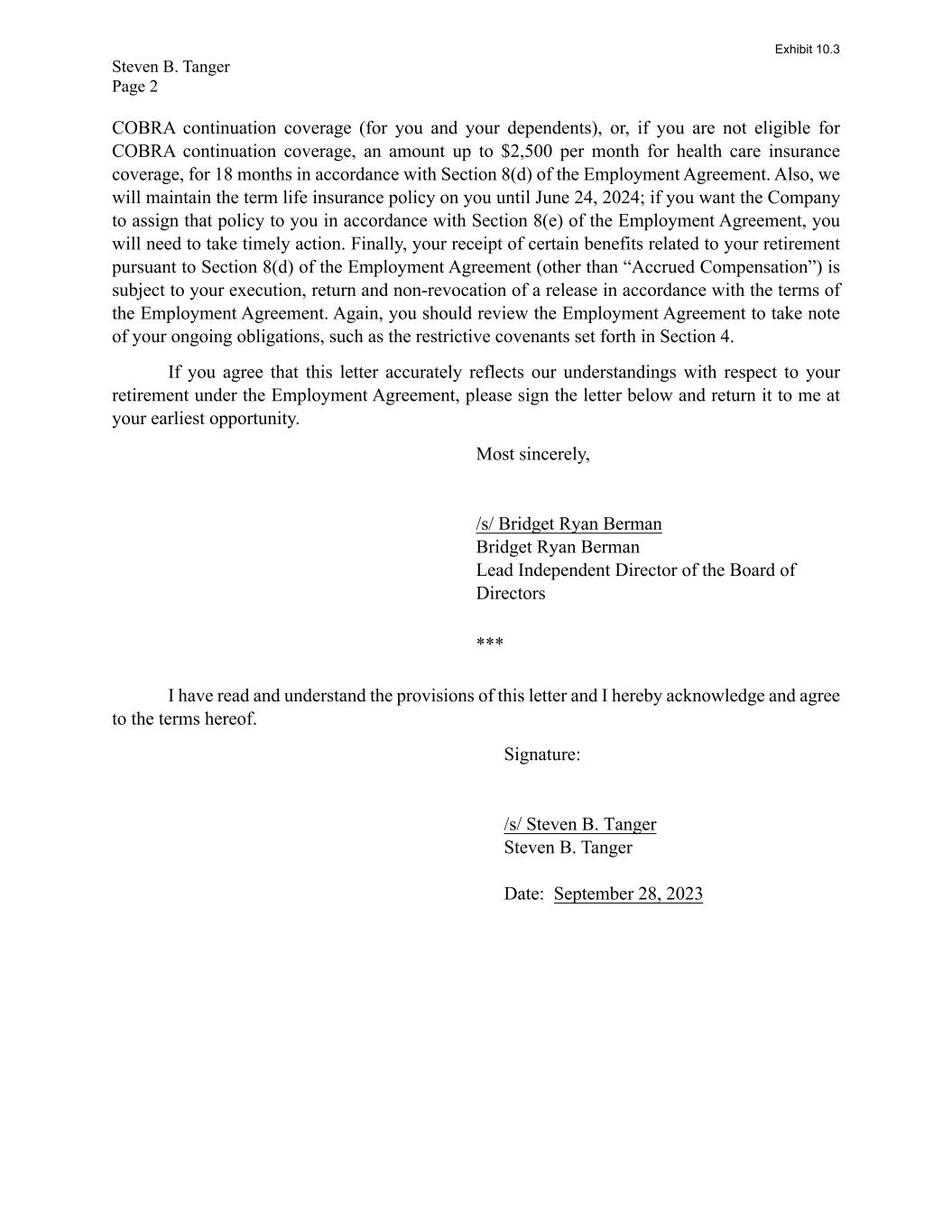 Steven B. Tanger Page 2 COBRA continuation coverage (for you and your dependents), or, if you are not eligible for COBRA continuation coverage, an amount up to $2,500 per month for health care insurance coverage, for 18 months in accordance with Section 8(d) of the Employment Agreement. Also, we will maintain the term life insurance policy on you until June 24, 2024; if you want the Company to assign that policy to you in accordance with Section 8(e) of the Employment Agreement, you will need to take timely action. Finally, your receipt of certain benefits related to your retirement pursuant to Section 8(d) of the Employment Agreement (other than “Accrued Compensation”) is subject to your execution, return and non-revocation of a release in accordance with the terms of the Employment Agreement. Again, you should review the Employment Agreement to take note of your ongoing obligations, such as the restrictive covenants set forth in Section 4. If you agree that this letter accurately reflects our understandings with respect to your retirement under the Employment Agreement, please sign the letter below and return it to me at your earliest opportunity. Most sincerely, /s/ Bridget Ryan Berman Bridget Ryan Berman Lead Independent Director of the Board of Directors *** I have read and understand the provisions of this letter and I hereby acknowledge and agree to the terms hereof. Signature: /s/ Steven B. Tanger Steven B. Tanger Date: September 28, 2023 Exhibit 10.3
