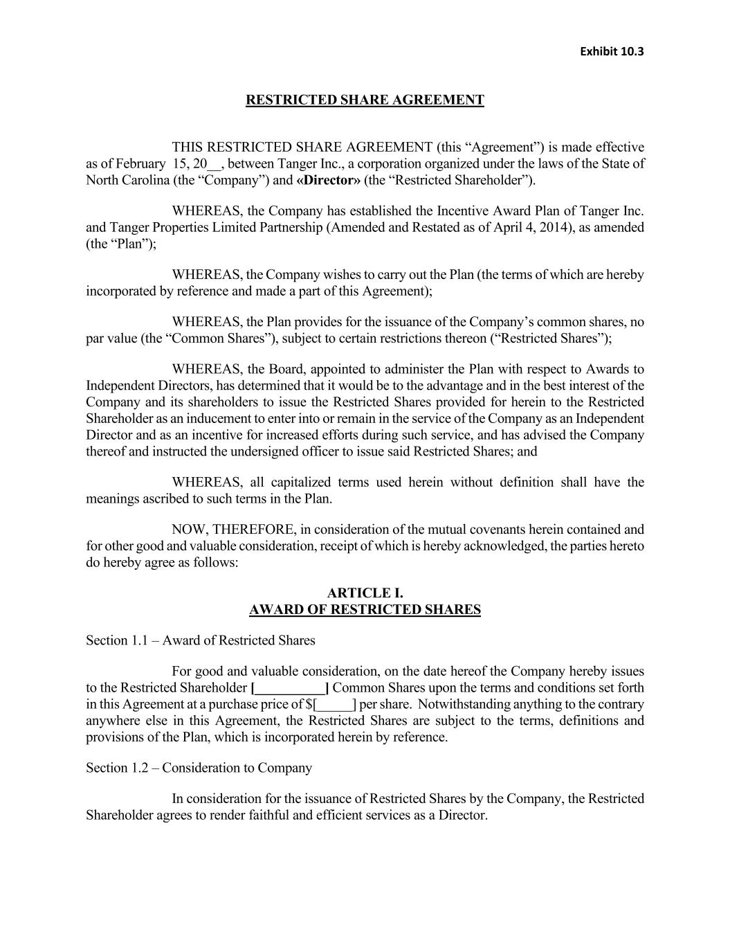 Exhibit 10.3 RESTRICTED SHARE AGREEMENT THIS RESTRICTED SHARE AGREEMENT (this “Agreement”) is made effective as of February 15, 20__, between Tanger Inc., a corporation organized under the laws of the State of North Carolina (the “Company”) and «Director» (the “Restricted Shareholder”). WHEREAS, the Company has established the Incentive Award Plan of Tanger Inc. and Tanger Properties Limited Partnership (Amended and Restated as of April 4, 2014), as amended (the “Plan”); WHEREAS, the Company wishes to carry out the Plan (the terms of which are hereby incorporated by reference and made a part of this Agreement); WHEREAS, the Plan provides for the issuance of the Company’s common shares, no par value (the “Common Shares”), subject to certain restrictions thereon (“Restricted Shares”); WHEREAS, the Board, appointed to administer the Plan with respect to Awards to Independent Directors, has determined that it would be to the advantage and in the best interest of the Company and its shareholders to issue the Restricted Shares provided for herein to the Restricted Shareholder as an inducement to enter into or remain in the service of the Company as an Independent Director and as an incentive for increased efforts during such service, and has advised the Company thereof and instructed the undersigned officer to issue said Restricted Shares; and WHEREAS, all capitalized terms used herein without definition shall have the meanings ascribed to such terms in the Plan. NOW, THEREFORE, in consideration of the mutual covenants herein contained and for other good and valuable consideration, receipt of which is hereby acknowledged, the parties hereto do hereby agree as follows: ARTICLE I. AWARD OF RESTRICTED SHARES Section 1.1 – Award of Restricted Shares For good and valuable consideration, on the date hereof the Company hereby issues to the Restricted Shareholder [__________] Common Shares upon the terms and conditions set forth in this Agreement at a purchase price of $[_____] per share. Notwithstanding anything to the contrary anywhere else in this Agreement, the Restricted Shares are subject to the terms, definitions and provisions of the Plan, which is incorporated herein by reference. Section 1.2 – Consideration to Company In consideration for the issuance of Restricted Shares by the Company, the Restricted Shareholder agrees to render faithful and efficient services as a Director.