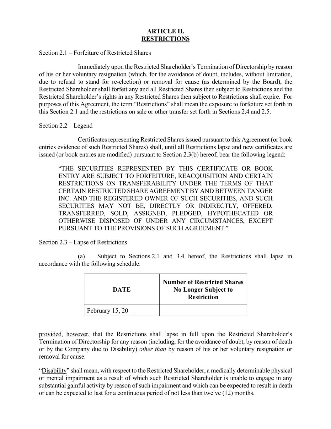 ARTICLE II. RESTRICTIONS Section 2.1 – Forfeiture of Restricted Shares Immediately upon the Restricted Shareholder’s Termination of Directorship by reason of his or her voluntary resignation (which, for the avoidance of doubt, includes, without limitation, due to refusal to stand for re-election) or removal for cause (as determined by the Board), the Restricted Shareholder shall forfeit any and all Restricted Shares then subject to Restrictions and the Restricted Shareholder’s rights in any Restricted Shares then subject to Restrictions shall expire. For purposes of this Agreement, the term “Restrictions” shall mean the exposure to forfeiture set forth in this Section 2.1 and the restrictions on sale or other transfer set forth in Sections 2.4 and 2.5. Section 2.2 – Legend Certificates representing Restricted Shares issued pursuant to this Agreement (or book entries evidence of such Restricted Shares) shall, until all Restrictions lapse and new certificates are issued (or book entries are modified) pursuant to Section 2.3(b) hereof, bear the following legend: “THE SECURITIES REPRESENTED BY THIS CERTIFICATE OR BOOK ENTRY ARE SUBJECT TO FORFEITURE, REACQUISITION AND CERTAIN RESTRICTIONS ON TRANSFERABILITY UNDER THE TERMS OF THAT CERTAIN RESTRICTED SHARE AGREEMENT BY AND BETWEEN TANGER INC. AND THE REGISTERED OWNER OF SUCH SECURITIES, AND SUCH SECURITIES MAY NOT BE, DIRECTLY OR INDIRECTLY, OFFERED, TRANSFERRED, SOLD, ASSIGNED, PLEDGED, HYPOTHECATED OR OTHERWISE DISPOSED OF UNDER ANY CIRCUMSTANCES, EXCEPT PURSUANT TO THE PROVISIONS OF SUCH AGREEMENT.” Section 2.3 – Lapse of Restrictions (a) Subject to Sections 2.1 and 3.4 hereof, the Restrictions shall lapse in accordance with the following schedule: DATE Number of Restricted Shares No Longer Subject to Restriction February 15, 20__ provided, however, that the Restrictions shall lapse in full upon the Restricted Shareholder’s Termination of Directorship for any reason (including, for the avoidance of doubt, by reason of death or by the Company due to Disability) other than by reason of his or her voluntary resignation or removal for cause. “Disability” shall mean, with respect to the Restricted Shareholder, a medically determinable physical or mental impairment as a result of which such Restricted Shareholder is unable to engage in any substantial gainful activity by reason of such impairment and which can be expected to result in death or can be expected to last for a continuous period of not less than twelve (12) months.