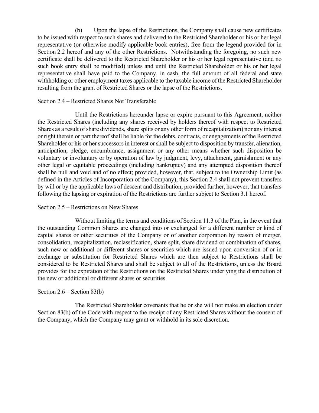(b) Upon the lapse of the Restrictions, the Company shall cause new certificates to be issued with respect to such shares and delivered to the Restricted Shareholder or his or her legal representative (or otherwise modify applicable book entries), free from the legend provided for in Section 2.2 hereof and any of the other Restrictions. Notwithstanding the foregoing, no such new certificate shall be delivered to the Restricted Shareholder or his or her legal representative (and no such book entry shall be modified) unless and until the Restricted Shareholder or his or her legal representative shall have paid to the Company, in cash, the full amount of all federal and state withholding or other employment taxes applicable to the taxable income of the Restricted Shareholder resulting from the grant of Restricted Shares or the lapse of the Restrictions. Section 2.4 – Restricted Shares Not Transferable Until the Restrictions hereunder lapse or expire pursuant to this Agreement, neither the Restricted Shares (including any shares received by holders thereof with respect to Restricted Shares as a result of share dividends, share splits or any other form of recapitalization) nor any interest or right therein or part thereof shall be liable for the debts, contracts, or engagements of the Restricted Shareholder or his or her successors in interest or shall be subject to disposition by transfer, alienation, anticipation, pledge, encumbrance, assignment or any other means whether such disposition be voluntary or involuntary or by operation of law by judgment, levy, attachment, garnishment or any other legal or equitable proceedings (including bankruptcy) and any attempted disposition thereof shall be null and void and of no effect; provided, however, that, subject to the Ownership Limit (as defined in the Articles of Incorporation of the Company), this Section 2.4 shall not prevent transfers by will or by the applicable laws of descent and distribution; provided further, however, that transfers following the lapsing or expiration of the Restrictions are further subject to Section 3.1 hereof. Section 2.5 – Restrictions on New Shares Without limiting the terms and conditions of Section 11.3 of the Plan, in the event that the outstanding Common Shares are changed into or exchanged for a different number or kind of capital shares or other securities of the Company or of another corporation by reason of merger, consolidation, recapitalization, reclassification, share split, share dividend or combination of shares, such new or additional or different shares or securities which are issued upon conversion of or in exchange or substitution for Restricted Shares which are then subject to Restrictions shall be considered to be Restricted Shares and shall be subject to all of the Restrictions, unless the Board provides for the expiration of the Restrictions on the Restricted Shares underlying the distribution of the new or additional or different shares or securities. Section 2.6 – Section 83(b) The Restricted Shareholder covenants that he or she will not make an election under Section 83(b) of the Code with respect to the receipt of any Restricted Shares without the consent of the Company, which the Company may grant or withhold in its sole discretion.