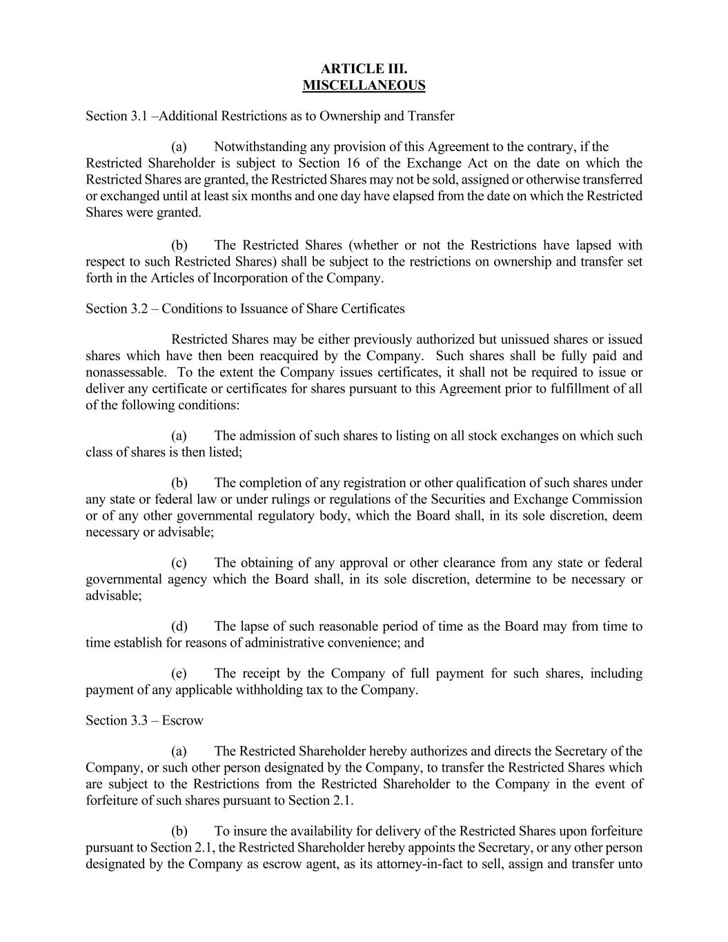ARTICLE III. MISCELLANEOUS Section 3.1 –Additional Restrictions as to Ownership and Transfer (a) Notwithstanding any provision of this Agreement to the contrary, if the Restricted Shareholder is subject to Section 16 of the Exchange Act on the date on which the Restricted Shares are granted, the Restricted Shares may not be sold, assigned or otherwise transferred or exchanged until at least six months and one day have elapsed from the date on which the Restricted Shares were granted. (b) The Restricted Shares (whether or not the Restrictions have lapsed with respect to such Restricted Shares) shall be subject to the restrictions on ownership and transfer set forth in the Articles of Incorporation of the Company. Section 3.2 – Conditions to Issuance of Share Certificates Restricted Shares may be either previously authorized but unissued shares or issued shares which have then been reacquired by the Company. Such shares shall be fully paid and nonassessable. To the extent the Company issues certificates, it shall not be required to issue or deliver any certificate or certificates for shares pursuant to this Agreement prior to fulfillment of all of the following conditions: (a) The admission of such shares to listing on all stock exchanges on which such class of shares is then listed; (b) The completion of any registration or other qualification of such shares under any state or federal law or under rulings or regulations of the Securities and Exchange Commission or of any other governmental regulatory body, which the Board shall, in its sole discretion, deem necessary or advisable; (c) The obtaining of any approval or other clearance from any state or federal governmental agency which the Board shall, in its sole discretion, determine to be necessary or advisable; (d) The lapse of such reasonable period of time as the Board may from time to time establish for reasons of administrative convenience; and (e) The receipt by the Company of full payment for such shares, including payment of any applicable withholding tax to the Company. Section 3.3 – Escrow (a) The Restricted Shareholder hereby authorizes and directs the Secretary of the Company, or such other person designated by the Company, to transfer the Restricted Shares which are subject to the Restrictions from the Restricted Shareholder to the Company in the event of forfeiture of such shares pursuant to Section 2.1. (b) To insure the availability for delivery of the Restricted Shares upon forfeiture pursuant to Section 2.1, the Restricted Shareholder hereby appoints the Secretary, or any other person designated by the Company as escrow agent, as its attorney-in-fact to sell, assign and transfer unto