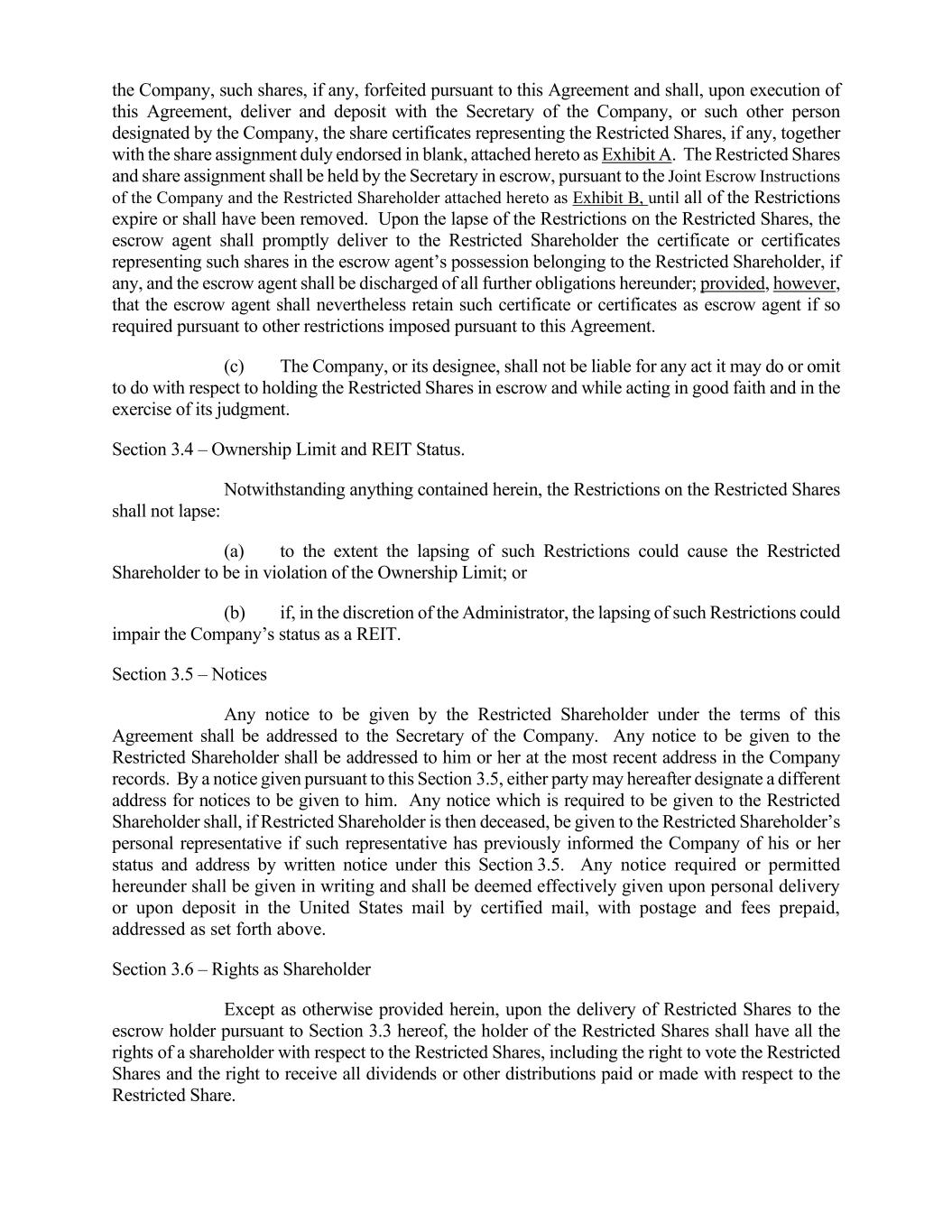 the Company, such shares, if any, forfeited pursuant to this Agreement and shall, upon execution of this Agreement, deliver and deposit with the Secretary of the Company, or such other person designated by the Company, the share certificates representing the Restricted Shares, if any, together with the share assignment duly endorsed in blank, attached hereto as Exhibit A. The Restricted Shares and share assignment shall be held by the Secretary in escrow, pursuant to the Joint Escrow Instructions of the Company and the Restricted Shareholder attached hereto as Exhibit B, until all of the Restrictions expire or shall have been removed. Upon the lapse of the Restrictions on the Restricted Shares, the escrow agent shall promptly deliver to the Restricted Shareholder the certificate or certificates representing such shares in the escrow agent’s possession belonging to the Restricted Shareholder, if any, and the escrow agent shall be discharged of all further obligations hereunder; provided, however, that the escrow agent shall nevertheless retain such certificate or certificates as escrow agent if so required pursuant to other restrictions imposed pursuant to this Agreement. (c) The Company, or its designee, shall not be liable for any act it may do or omit to do with respect to holding the Restricted Shares in escrow and while acting in good faith and in the exercise of its judgment. Section 3.4 – Ownership Limit and REIT Status. Notwithstanding anything contained herein, the Restrictions on the Restricted Shares shall not lapse: (a) to the extent the lapsing of such Restrictions could cause the Restricted Shareholder to be in violation of the Ownership Limit; or (b) if, in the discretion of the Administrator, the lapsing of such Restrictions could impair the Company’s status as a REIT. Section 3.5 – Notices Any notice to be given by the Restricted Shareholder under the terms of this Agreement shall be addressed to the Secretary of the Company. Any notice to be given to the Restricted Shareholder shall be addressed to him or her at the most recent address in the Company records. By a notice given pursuant to this Section 3.5, either party may hereafter designate a different address for notices to be given to him. Any notice which is required to be given to the Restricted Shareholder shall, if Restricted Shareholder is then deceased, be given to the Restricted Shareholder’s personal representative if such representative has previously informed the Company of his or her status and address by written notice under this Section 3.5. Any notice required or permitted hereunder shall be given in writing and shall be deemed effectively given upon personal delivery or upon deposit in the United States mail by certified mail, with postage and fees prepaid, addressed as set forth above. Section 3.6 – Rights as Shareholder Except as otherwise provided herein, upon the delivery of Restricted Shares to the escrow holder pursuant to Section 3.3 hereof, the holder of the Restricted Shares shall have all the rights of a shareholder with respect to the Restricted Shares, including the right to vote the Restricted Shares and the right to receive all dividends or other distributions paid or made with respect to the Restricted Share.