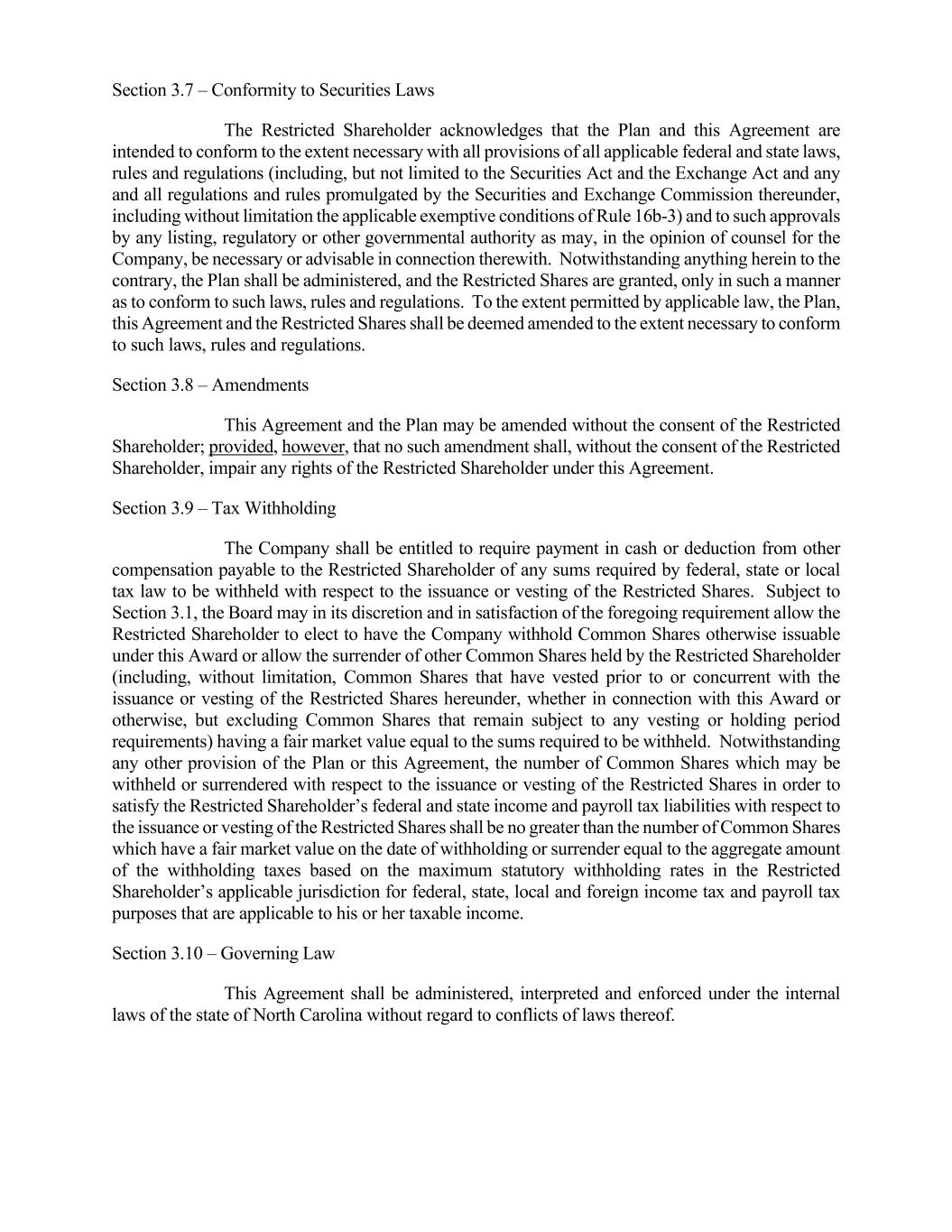 Section 3.7 – Conformity to Securities Laws The Restricted Shareholder acknowledges that the Plan and this Agreement are intended to conform to the extent necessary with all provisions of all applicable federal and state laws, rules and regulations (including, but not limited to the Securities Act and the Exchange Act and any and all regulations and rules promulgated by the Securities and Exchange Commission thereunder, including without limitation the applicable exemptive conditions of Rule 16b-3) and to such approvals by any listing, regulatory or other governmental authority as may, in the opinion of counsel for the Company, be necessary or advisable in connection therewith. Notwithstanding anything herein to the contrary, the Plan shall be administered, and the Restricted Shares are granted, only in such a manner as to conform to such laws, rules and regulations. To the extent permitted by applicable law, the Plan, this Agreement and the Restricted Shares shall be deemed amended to the extent necessary to conform to such laws, rules and regulations. Section 3.8 – Amendments This Agreement and the Plan may be amended without the consent of the Restricted Shareholder; provided, however, that no such amendment shall, without the consent of the Restricted Shareholder, impair any rights of the Restricted Shareholder under this Agreement. Section 3.9 – Tax Withholding The Company shall be entitled to require payment in cash or deduction from other compensation payable to the Restricted Shareholder of any sums required by federal, state or local tax law to be withheld with respect to the issuance or vesting of the Restricted Shares. Subject to Section 3.1, the Board may in its discretion and in satisfaction of the foregoing requirement allow the Restricted Shareholder to elect to have the Company withhold Common Shares otherwise issuable under this Award or allow the surrender of other Common Shares held by the Restricted Shareholder (including, without limitation, Common Shares that have vested prior to or concurrent with the issuance or vesting of the Restricted Shares hereunder, whether in connection with this Award or otherwise, but excluding Common Shares that remain subject to any vesting or holding period requirements) having a fair market value equal to the sums required to be withheld. Notwithstanding any other provision of the Plan or this Agreement, the number of Common Shares which may be withheld or surrendered with respect to the issuance or vesting of the Restricted Shares in order to satisfy the Restricted Shareholder’s federal and state income and payroll tax liabilities with respect to the issuance or vesting of the Restricted Shares shall be no greater than the number of Common Shares which have a fair market value on the date of withholding or surrender equal to the aggregate amount of the withholding taxes based on the maximum statutory withholding rates in the Restricted Shareholder’s applicable jurisdiction for federal, state, local and foreign income tax and payroll tax purposes that are applicable to his or her taxable income. Section 3.10 – Governing Law This Agreement shall be administered, interpreted and enforced under the internal laws of the state of North Carolina without regard to conflicts of laws thereof.