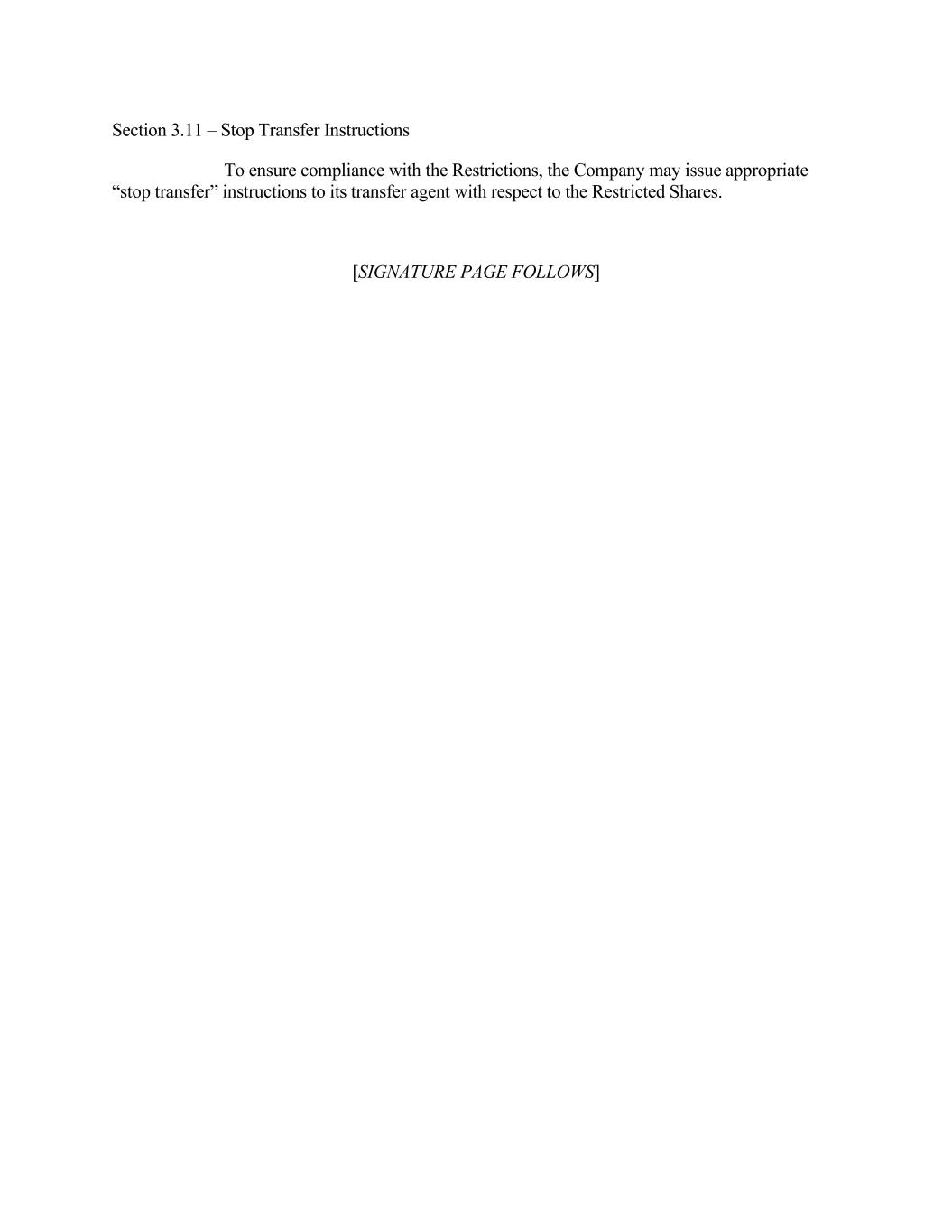 Section 3.11 – Stop Transfer Instructions To ensure compliance with the Restrictions, the Company may issue appropriate “stop transfer” instructions to its transfer agent with respect to the Restricted Shares. [SIGNATURE PAGE FOLLOWS]