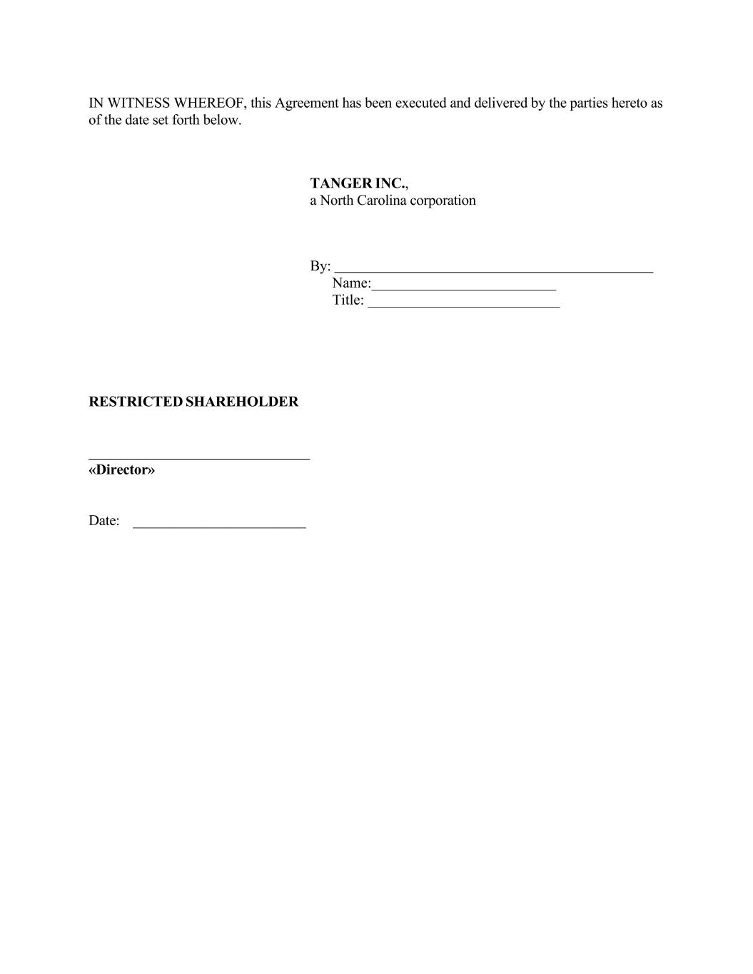 IN WITNESS WHEREOF, this Agreement has been executed and delivered by the parties hereto as of the date set forth below. TANGER INC., a North Carolina corporation By: Name:_________________________ Title: __________________________ RESTRICTED SHAREHOLDER «Director» Date: ________________________