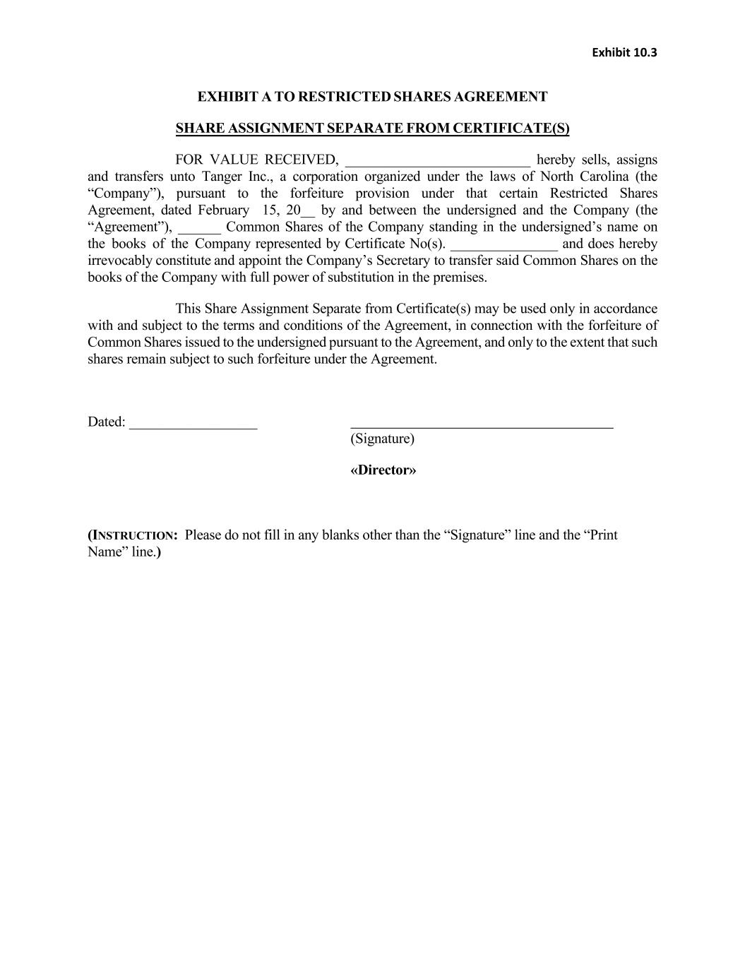 Exhibit 10.3 EXHIBIT A TO RESTRICTED SHARES AGREEMENT SHARE ASSIGNMENT SEPARATE FROM CERTIFICATE(S) FOR VALUE RECEIVED, __________________________ hereby sells, assigns and transfers unto Tanger Inc., a corporation organized under the laws of North Carolina (the “Company”), pursuant to the forfeiture provision under that certain Restricted Shares Agreement, dated February 15, 20__ by and between the undersigned and the Company (the “Agreement”), ______ Common Shares of the Company standing in the undersigned’s name on the books of the Company represented by Certificate No(s). _______________ and does hereby irrevocably constitute and appoint the Company’s Secretary to transfer said Common Shares on the books of the Company with full power of substitution in the premises. This Share Assignment Separate from Certificate(s) may be used only in accordance with and subject to the terms and conditions of the Agreement, in connection with the forfeiture of Common Shares issued to the undersigned pursuant to the Agreement, and only to the extent that such shares remain subject to such forfeiture under the Agreement. Dated: __________________ (Signature) «Director» (INSTRUCTION: Please do not fill in any blanks other than the “Signature” line and the “Print Name” line.)