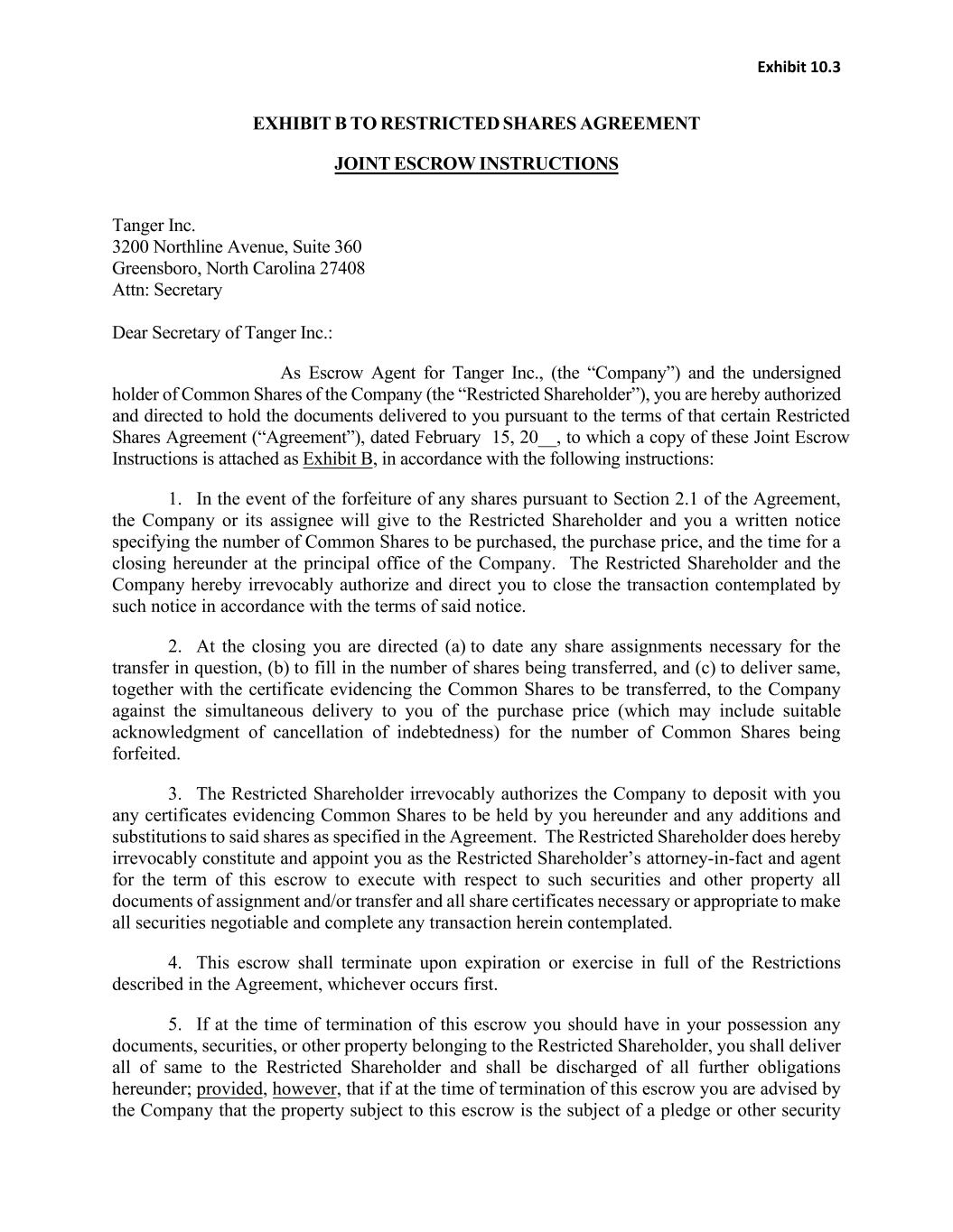Exhibit 10.3 EXHIBIT B TO RESTRICTED SHARES AGREEMENT JOINT ESCROW INSTRUCTIONS Tanger Inc. 3200 Northline Avenue, Suite 360 Greensboro, North Carolina 27408 Attn: Secretary Dear Secretary of Tanger Inc.: As Escrow Agent for Tanger Inc., (the “Company”) and the undersigned holder of Common Shares of the Company (the “Restricted Shareholder”), you are hereby authorized and directed to hold the documents delivered to you pursuant to the terms of that certain Restricted Shares Agreement (“Agreement”), dated February 15, 20__, to which a copy of these Joint Escrow Instructions is attached as Exhibit B, in accordance with the following instructions: 1. In the event of the forfeiture of any shares pursuant to Section 2.1 of the Agreement, the Company or its assignee will give to the Restricted Shareholder and you a written notice specifying the number of Common Shares to be purchased, the purchase price, and the time for a closing hereunder at the principal office of the Company. The Restricted Shareholder and the Company hereby irrevocably authorize and direct you to close the transaction contemplated by such notice in accordance with the terms of said notice. 2. At the closing you are directed (a) to date any share assignments necessary for the transfer in question, (b) to fill in the number of shares being transferred, and (c) to deliver same, together with the certificate evidencing the Common Shares to be transferred, to the Company against the simultaneous delivery to you of the purchase price (which may include suitable acknowledgment of cancellation of indebtedness) for the number of Common Shares being forfeited. 3. The Restricted Shareholder irrevocably authorizes the Company to deposit with you any certificates evidencing Common Shares to be held by you hereunder and any additions and substitutions to said shares as specified in the Agreement. The Restricted Shareholder does hereby irrevocably constitute and appoint you as the Restricted Shareholder’s attorney-in-fact and agent for the term of this escrow to execute with respect to such securities and other property all documents of assignment and/or transfer and all share certificates necessary or appropriate to make all securities negotiable and complete any transaction herein contemplated. 4. This escrow shall terminate upon expiration or exercise in full of the Restrictions described in the Agreement, whichever occurs first. 5. If at the time of termination of this escrow you should have in your possession any documents, securities, or other property belonging to the Restricted Shareholder, you shall deliver all of same to the Restricted Shareholder and shall be discharged of all further obligations hereunder; provided, however, that if at the time of termination of this escrow you are advised by the Company that the property subject to this escrow is the subject of a pledge or other security