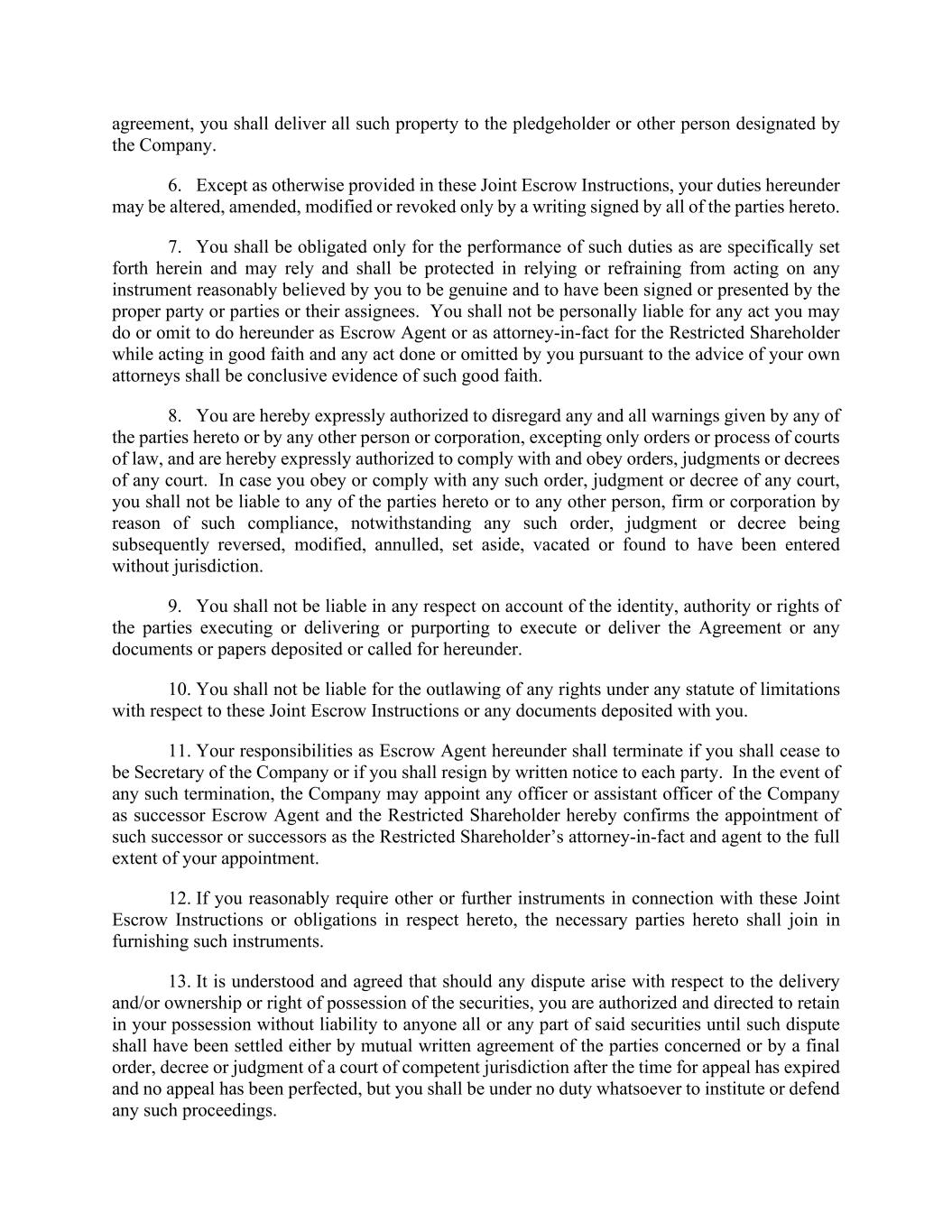 agreement, you shall deliver all such property to the pledgeholder or other person designated by the Company. 6. Except as otherwise provided in these Joint Escrow Instructions, your duties hereunder may be altered, amended, modified or revoked only by a writing signed by all of the parties hereto. 7. You shall be obligated only for the performance of such duties as are specifically set forth herein and may rely and shall be protected in relying or refraining from acting on any instrument reasonably believed by you to be genuine and to have been signed or presented by the proper party or parties or their assignees. You shall not be personally liable for any act you may do or omit to do hereunder as Escrow Agent or as attorney-in-fact for the Restricted Shareholder while acting in good faith and any act done or omitted by you pursuant to the advice of your own attorneys shall be conclusive evidence of such good faith. 8. You are hereby expressly authorized to disregard any and all warnings given by any of the parties hereto or by any other person or corporation, excepting only orders or process of courts of law, and are hereby expressly authorized to comply with and obey orders, judgments or decrees of any court. In case you obey or comply with any such order, judgment or decree of any court, you shall not be liable to any of the parties hereto or to any other person, firm or corporation by reason of such compliance, notwithstanding any such order, judgment or decree being subsequently reversed, modified, annulled, set aside, vacated or found to have been entered without jurisdiction. 9. You shall not be liable in any respect on account of the identity, authority or rights of the parties executing or delivering or purporting to execute or deliver the Agreement or any documents or papers deposited or called for hereunder. 10. You shall not be liable for the outlawing of any rights under any statute of limitations with respect to these Joint Escrow Instructions or any documents deposited with you. 11. Your responsibilities as Escrow Agent hereunder shall terminate if you shall cease to be Secretary of the Company or if you shall resign by written notice to each party. In the event of any such termination, the Company may appoint any officer or assistant officer of the Company as successor Escrow Agent and the Restricted Shareholder hereby confirms the appointment of such successor or successors as the Restricted Shareholder’s attorney-in-fact and agent to the full extent of your appointment. 12. If you reasonably require other or further instruments in connection with these Joint Escrow Instructions or obligations in respect hereto, the necessary parties hereto shall join in furnishing such instruments. 13. It is understood and agreed that should any dispute arise with respect to the delivery and/or ownership or right of possession of the securities, you are authorized and directed to retain in your possession without liability to anyone all or any part of said securities until such dispute shall have been settled either by mutual written agreement of the parties concerned or by a final order, decree or judgment of a court of competent jurisdiction after the time for appeal has expired and no appeal has been perfected, but you shall be under no duty whatsoever to institute or defend any such proceedings.