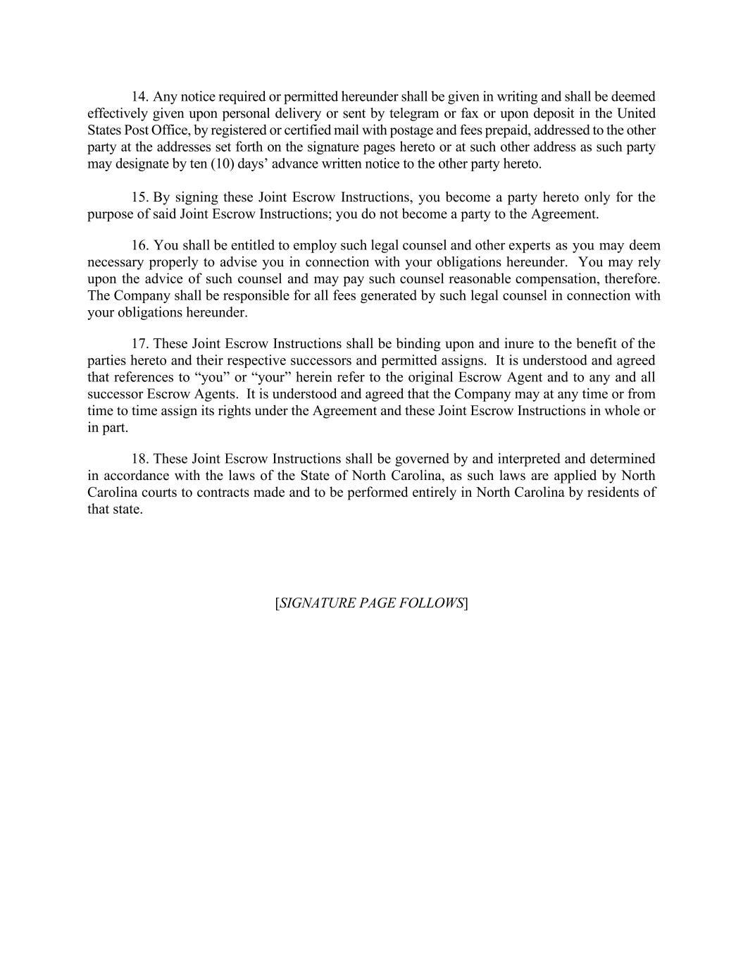 14. Any notice required or permitted hereunder shall be given in writing and shall be deemed effectively given upon personal delivery or sent by telegram or fax or upon deposit in the United States Post Office, by registered or certified mail with postage and fees prepaid, addressed to the other party at the addresses set forth on the signature pages hereto or at such other address as such party may designate by ten (10) days’ advance written notice to the other party hereto. 15. By signing these Joint Escrow Instructions, you become a party hereto only for the purpose of said Joint Escrow Instructions; you do not become a party to the Agreement. 16. You shall be entitled to employ such legal counsel and other experts as you may deem necessary properly to advise you in connection with your obligations hereunder. You may rely upon the advice of such counsel and may pay such counsel reasonable compensation, therefore. The Company shall be responsible for all fees generated by such legal counsel in connection with your obligations hereunder. 17. These Joint Escrow Instructions shall be binding upon and inure to the benefit of the parties hereto and their respective successors and permitted assigns. It is understood and agreed that references to “you” or “your” herein refer to the original Escrow Agent and to any and all successor Escrow Agents. It is understood and agreed that the Company may at any time or from time to time assign its rights under the Agreement and these Joint Escrow Instructions in whole or in part. 18. These Joint Escrow Instructions shall be governed by and interpreted and determined in accordance with the laws of the State of North Carolina, as such laws are applied by North Carolina courts to contracts made and to be performed entirely in North Carolina by residents of that state. [SIGNATURE PAGE FOLLOWS]