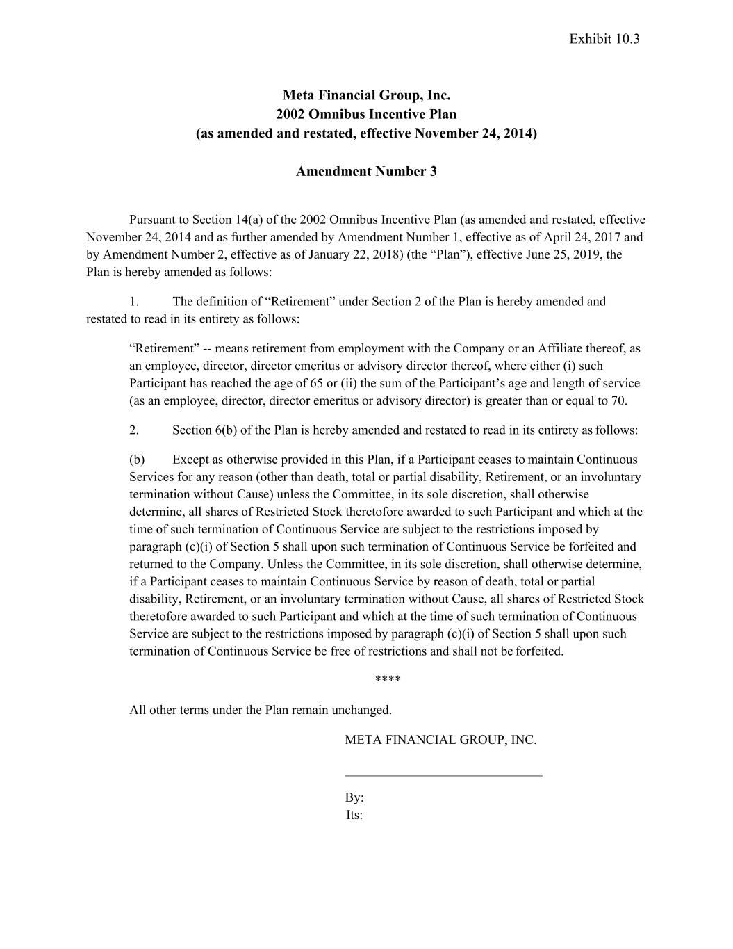 Exhibit 10.3 Meta Financial Group, Inc. 2002 Omnibus Incentive Plan (as amended and restated, effective November 24, 2014) Amendment Number 3 Pursuant to Section 14(a) of the 2002 Omnibus Incentive Plan (as amended and restated, effective November 24, 2014 and as further amended by Amendment Number 1, effective as of April 24, 2017 and by Amendment Number 2, effective as of January 22, 2018) (the “Plan”), effective June 25, 2019, the Plan is hereby amended as follows: 1. The definition of “Retirement” under Section 2 of the Plan is hereby amended and restated to read in its entirety as follows: “Retirement” -- means retirement from employment with the Company or an Affiliate thereof, as an employee, director, director emeritus or advisory director thereof, where either (i) such Participant has reached the age of 65 or (ii) the sum of the Participant’s age and length of service (as an employee, director, director emeritus or advisory director) is greater than or equal to 70. 2. Section 6(b) of the Plan is hereby amended and restated to read in its entirety as follows: (b) Except as otherwise provided in this Plan, if a Participant ceases to maintain Continuous Services for any reason (other than death, total or partial disability, Retirement, or an involuntary termination without Cause) unless the Committee, in its sole discretion, shall otherwise determine, all shares of Restricted Stock theretofore awarded to such Participant and which at the time of such termination of Continuous Service are subject to the restrictions imposed by paragraph (c)(i) of Section 5 shall upon such termination of Continuous Service be forfeited and returned to the Company. Unless the Committee, in its sole discretion, shall otherwise determine, if a Participant ceases to maintain Continuous Service by reason of death, total or partial disability, Retirement, or an involuntary termination without Cause, all shares of Restricted Stock theretofore awarded to such Participant and which at the time of such termination of Continuous Service are subject to the restrictions imposed by paragraph (c)(i) of Section 5 shall upon such termination of Continuous Service be free of restrictions and shall not be forfeited. **** All other terms under the Plan remain unchanged. META FINANCIAL GROUP, INC. By: Its: