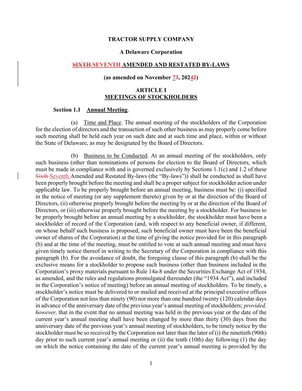1 TRACTOR SUPPLY COMPANY A Delaware Corporation SIXTH SEVENTH AMENDED AND RESTATED BY-LAWS (as amended on November 73, 20242) ARTICLE I MEETINGS OF STOCKHOLDERS Section 1.1 Annual Meeting. (a) Time and Place. The annual meeting of the stockholders of the Corporation for the election of directors and the transaction of such other business as may properly come before such meeting shall be held each year on such date and at such time and place, within or without the State of Delaware, as may be designated by the Board of Directors. (b) Business to be Conducted. At an annual meeting of the stockholders, only such business (other than nominations of persons for election to the Board of Directors, which must be made in compliance with and is governed exclusively by Sections 1.1(c) and 1.2 of these Sixth Seventh Amended and Restated By-laws (the “By-laws”)) shall be conducted as shall have been properly brought before the meeting and shall be a proper subject for stockholder action under applicable law. To be properly brought before an annual meeting, business must be: (i) specified in the notice of meeting (or any supplement thereto) given by or at the direction of the Board of Directors, (ii) otherwise properly brought before the meeting by or at the direction of the Board of Directors, or (iii) otherwise properly brought before the meeting by a stockholder. For business to be properly brought before an annual meeting by a stockholder, the stockholder must have been a stockholder of record of the Corporation (and, with respect to any beneficial owner, if different, on whose behalf such business is proposed, such beneficial owner must have been the beneficial owner of shares of the Corporation) at the time of giving the notice provided for in this paragraph (b) and at the time of the meeting, must be entitled to vote at such annual meeting and must have given timely notice thereof in writing to the Secretary of the Corporation in compliance with this paragraph (b). For the avoidance of doubt, the foregoing clause of this paragraph (b) shall be the exclusive means for a stockholder to propose such business (other than business included in the Corporation’s proxy materials pursuant to Rule 14a-8 under the Securities Exchange Act of 1934, as amended, and the rules and regulations promulgated thereunder (the “1934 Act”), and included in the Corporation’s notice of meeting) before an annual meeting of stockholders. To be timely, a stockholder’s notice must be delivered to or mailed and received at the principal executive offices of the Corporation not less than ninety (90) nor more than one hundred twenty (120) calendar days in advance of the anniversary date of the previous year’s annual meeting of stockholders; provided, however, that in the event that no annual meeting was held in the previous year or the date of the current year’s annual meeting shall have been changed by more than thirty (30) days from the anniversary date of the previous year’s annual meeting of stockholders, to be timely notice by the stockholder must be so received by the Corporation not later than the later of (i) the ninetieth (90th) day prior to such current year’s annual meeting or (ii) the tenth (10th) day following (1) the day on which the notice containing the date of the current year’s annual meeting is provided by the