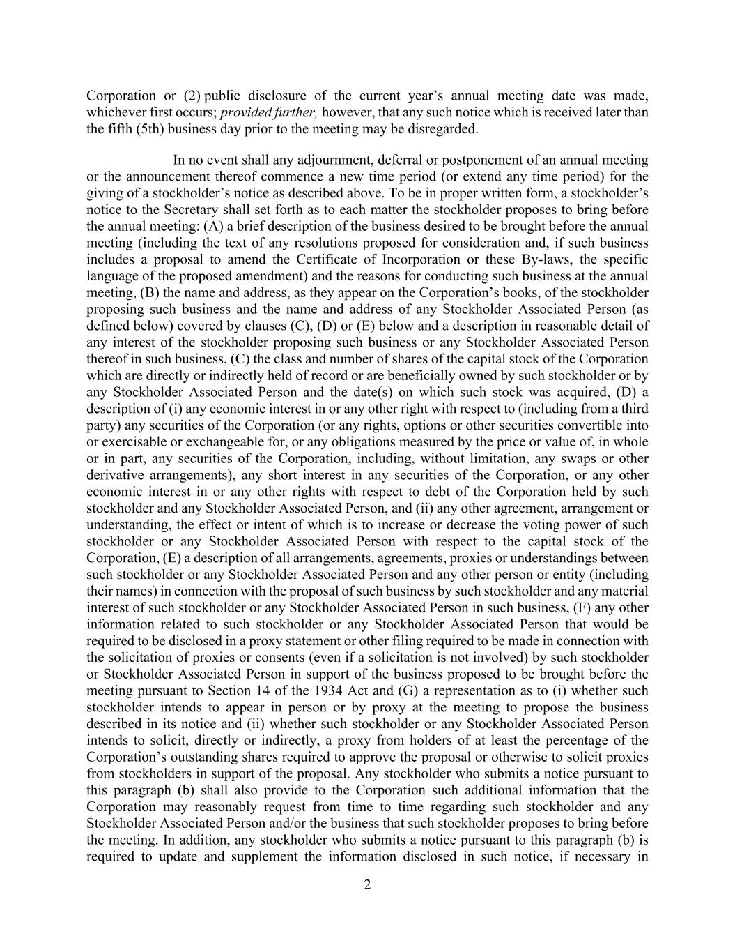 2 Corporation or (2) public disclosure of the current year’s annual meeting date was made, whichever first occurs; provided further, however, that any such notice which is received later than the fifth (5th) business day prior to the meeting may be disregarded. In no event shall any adjournment, deferral or postponement of an annual meeting or the announcement thereof commence a new time period (or extend any time period) for the giving of a stockholder’s notice as described above. To be in proper written form, a stockholder’s notice to the Secretary shall set forth as to each matter the stockholder proposes to bring before the annual meeting: (A) a brief description of the business desired to be brought before the annual meeting (including the text of any resolutions proposed for consideration and, if such business includes a proposal to amend the Certificate of Incorporation or these By-laws, the specific language of the proposed amendment) and the reasons for conducting such business at the annual meeting, (B) the name and address, as they appear on the Corporation’s books, of the stockholder proposing such business and the name and address of any Stockholder Associated Person (as defined below) covered by clauses (C), (D) or (E) below and a description in reasonable detail of any interest of the stockholder proposing such business or any Stockholder Associated Person thereof in such business, (C) the class and number of shares of the capital stock of the Corporation which are directly or indirectly held of record or are beneficially owned by such stockholder or by any Stockholder Associated Person and the date(s) on which such stock was acquired, (D) a description of (i) any economic interest in or any other right with respect to (including from a third party) any securities of the Corporation (or any rights, options or other securities convertible into or exercisable or exchangeable for, or any obligations measured by the price or value of, in whole or in part, any securities of the Corporation, including, without limitation, any swaps or other derivative arrangements), any short interest in any securities of the Corporation, or any other economic interest in or any other rights with respect to debt of the Corporation held by such stockholder and any Stockholder Associated Person, and (ii) any other agreement, arrangement or understanding, the effect or intent of which is to increase or decrease the voting power of such stockholder or any Stockholder Associated Person with respect to the capital stock of the Corporation, (E) a description of all arrangements, agreements, proxies or understandings between such stockholder or any Stockholder Associated Person and any other person or entity (including their names) in connection with the proposal of such business by such stockholder and any material interest of such stockholder or any Stockholder Associated Person in such business, (F) any other information related to such stockholder or any Stockholder Associated Person that would be required to be disclosed in a proxy statement or other filing required to be made in connection with the solicitation of proxies or consents (even if a solicitation is not involved) by such stockholder or Stockholder Associated Person in support of the business proposed to be brought before the meeting pursuant to Section 14 of the 1934 Act and (G) a representation as to (i) whether such stockholder intends to appear in person or by proxy at the meeting to propose the business described in its notice and (ii) whether such stockholder or any Stockholder Associated Person intends to solicit, directly or indirectly, a proxy from holders of at least the percentage of the Corporation’s outstanding shares required to approve the proposal or otherwise to solicit proxies from stockholders in support of the proposal. Any stockholder who submits a notice pursuant to this paragraph (b) shall also provide to the Corporation such additional information that the Corporation may reasonably request from time to time regarding such stockholder and any Stockholder Associated Person and/or the business that such stockholder proposes to bring before the meeting. In addition, any stockholder who submits a notice pursuant to this paragraph (b) is required to update and supplement the information disclosed in such notice, if necessary in