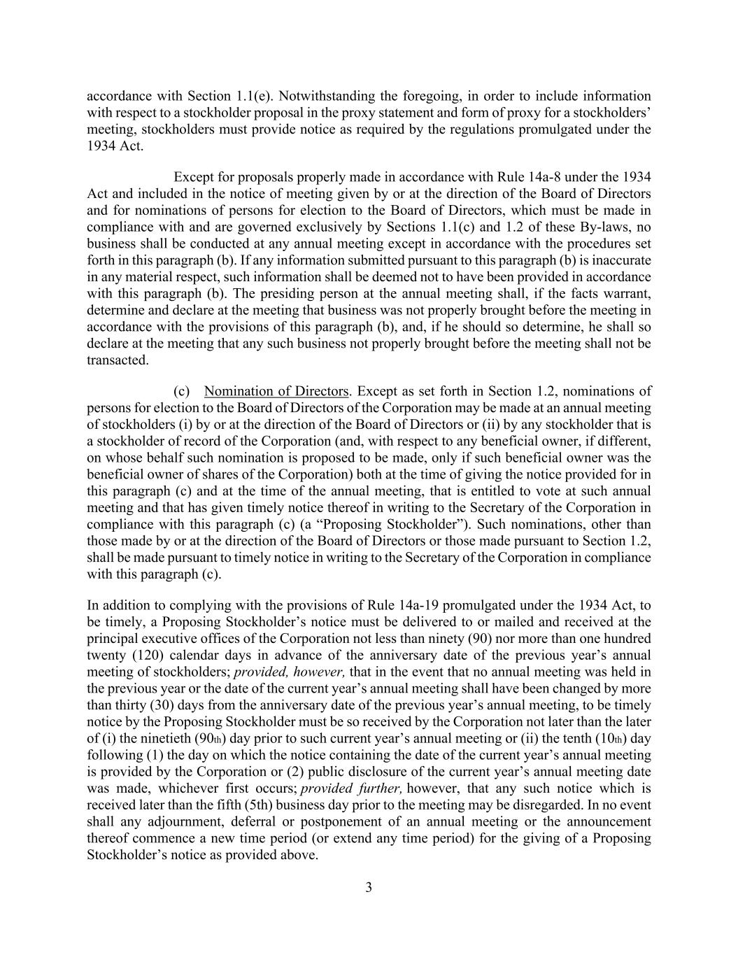 3 accordance with Section 1.1(e). Notwithstanding the foregoing, in order to include information with respect to a stockholder proposal in the proxy statement and form of proxy for a stockholders’ meeting, stockholders must provide notice as required by the regulations promulgated under the 1934 Act. Except for proposals properly made in accordance with Rule 14a-8 under the 1934 Act and included in the notice of meeting given by or at the direction of the Board of Directors and for nominations of persons for election to the Board of Directors, which must be made in compliance with and are governed exclusively by Sections 1.1(c) and 1.2 of these By-laws, no business shall be conducted at any annual meeting except in accordance with the procedures set forth in this paragraph (b). If any information submitted pursuant to this paragraph (b) is inaccurate in any material respect, such information shall be deemed not to have been provided in accordance with this paragraph (b). The presiding person at the annual meeting shall, if the facts warrant, determine and declare at the meeting that business was not properly brought before the meeting in accordance with the provisions of this paragraph (b), and, if he should so determine, he shall so declare at the meeting that any such business not properly brought before the meeting shall not be transacted. (c) Nomination of Directors. Except as set forth in Section 1.2, nominations of persons for election to the Board of Directors of the Corporation may be made at an annual meeting of stockholders (i) by or at the direction of the Board of Directors or (ii) by any stockholder that is a stockholder of record of the Corporation (and, with respect to any beneficial owner, if different, on whose behalf such nomination is proposed to be made, only if such beneficial owner was the beneficial owner of shares of the Corporation) both at the time of giving the notice provided for in this paragraph (c) and at the time of the annual meeting, that is entitled to vote at such annual meeting and that has given timely notice thereof in writing to the Secretary of the Corporation in compliance with this paragraph (c) (a “Proposing Stockholder”). Such nominations, other than those made by or at the direction of the Board of Directors or those made pursuant to Section 1.2, shall be made pursuant to timely notice in writing to the Secretary of the Corporation in compliance with this paragraph (c). In addition to complying with the provisions of Rule 14a-19 promulgated under the 1934 Act, to be timely, a Proposing Stockholder’s notice must be delivered to or mailed and received at the principal executive offices of the Corporation not less than ninety (90) nor more than one hundred twenty (120) calendar days in advance of the anniversary date of the previous year’s annual meeting of stockholders; provided, however, that in the event that no annual meeting was held in the previous year or the date of the current year’s annual meeting shall have been changed by more than thirty (30) days from the anniversary date of the previous year’s annual meeting, to be timely notice by the Proposing Stockholder must be so received by the Corporation not later than the later of (i) the ninetieth (90th) day prior to such current year’s annual meeting or (ii) the tenth (10th) day following (1) the day on which the notice containing the date of the current year’s annual meeting is provided by the Corporation or (2) public disclosure of the current year’s annual meeting date was made, whichever first occurs; provided further, however, that any such notice which is received later than the fifth (5th) business day prior to the meeting may be disregarded. In no event shall any adjournment, deferral or postponement of an annual meeting or the announcement thereof commence a new time period (or extend any time period) for the giving of a Proposing Stockholder’s notice as provided above.